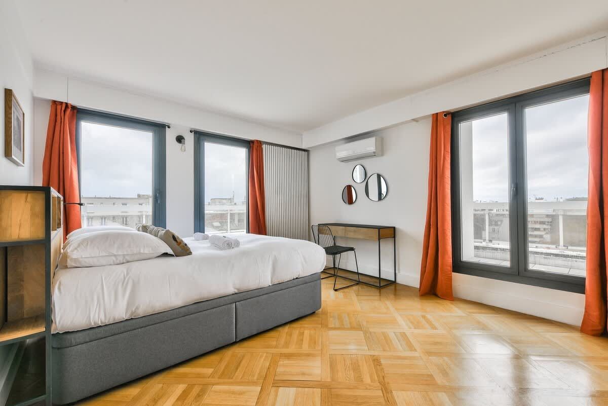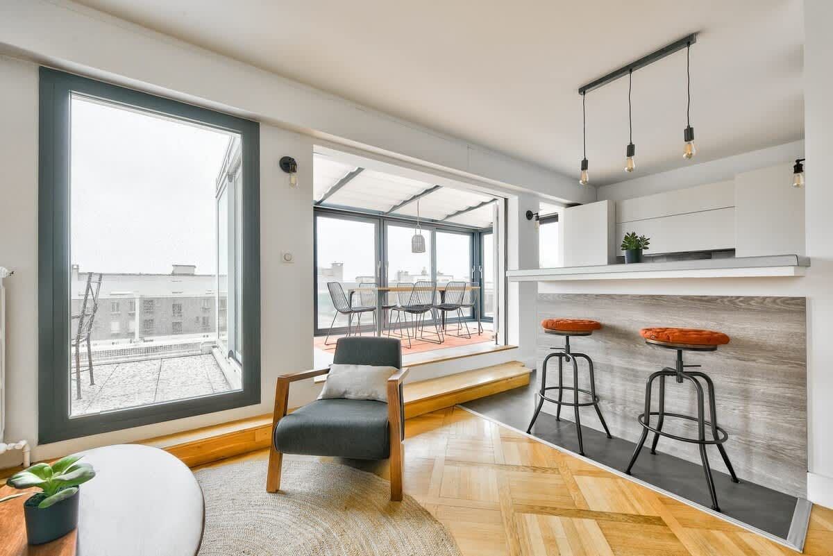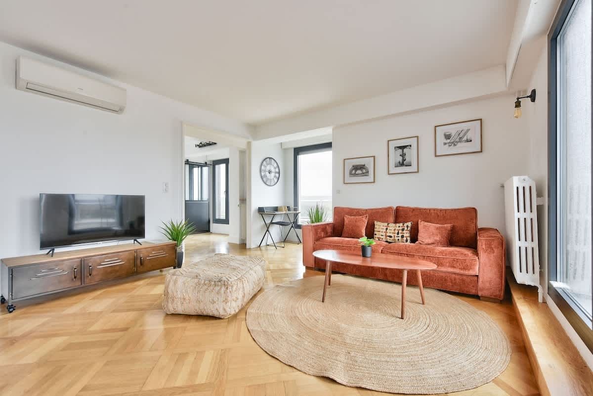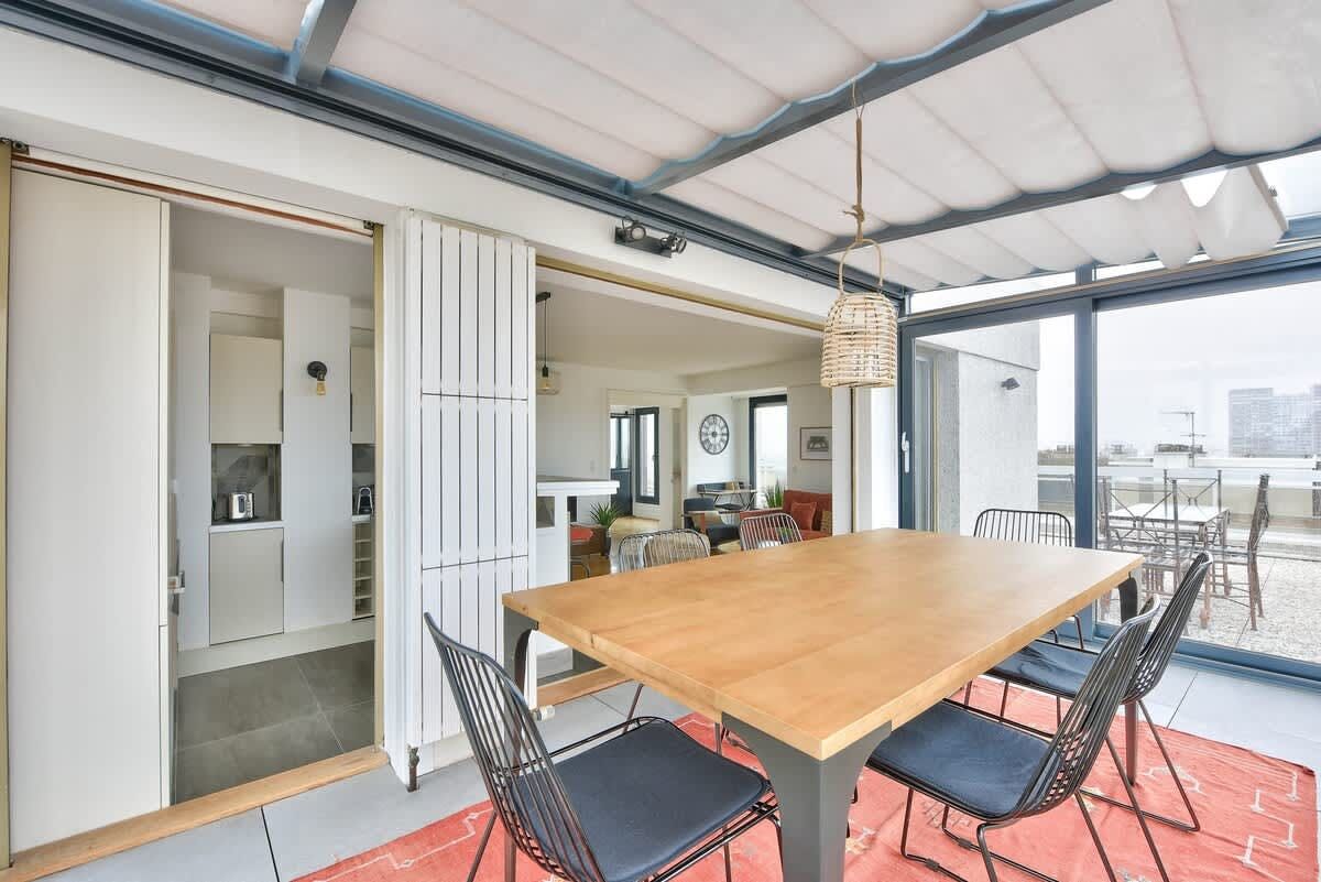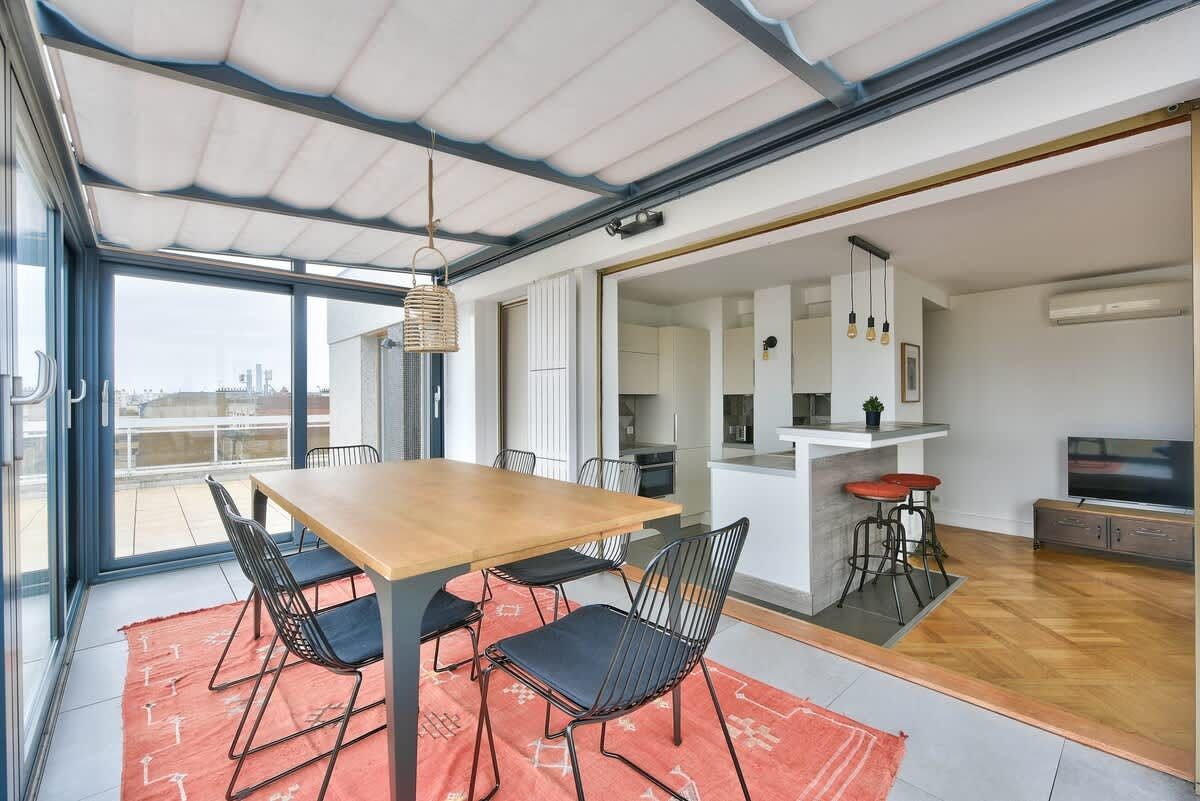 Does a stay in Paris get any better than waking up to views of the Eiffel Tower? This apartment comes with terraces and sweeping 360-degree views of the city, so you can watch the sunrise with your coffee and toast the evening as the tower sparkles after dark. Inside, there’s an open-plan kitchen and living area, a bright dining space wrapped in glass windows, and even a desk corner for catching up on emails. And when you’re ready to explore, you’re perfectly placed – the Seine, Trocadéro, and metro stops that whisk you across the city are all just a short stroll away.