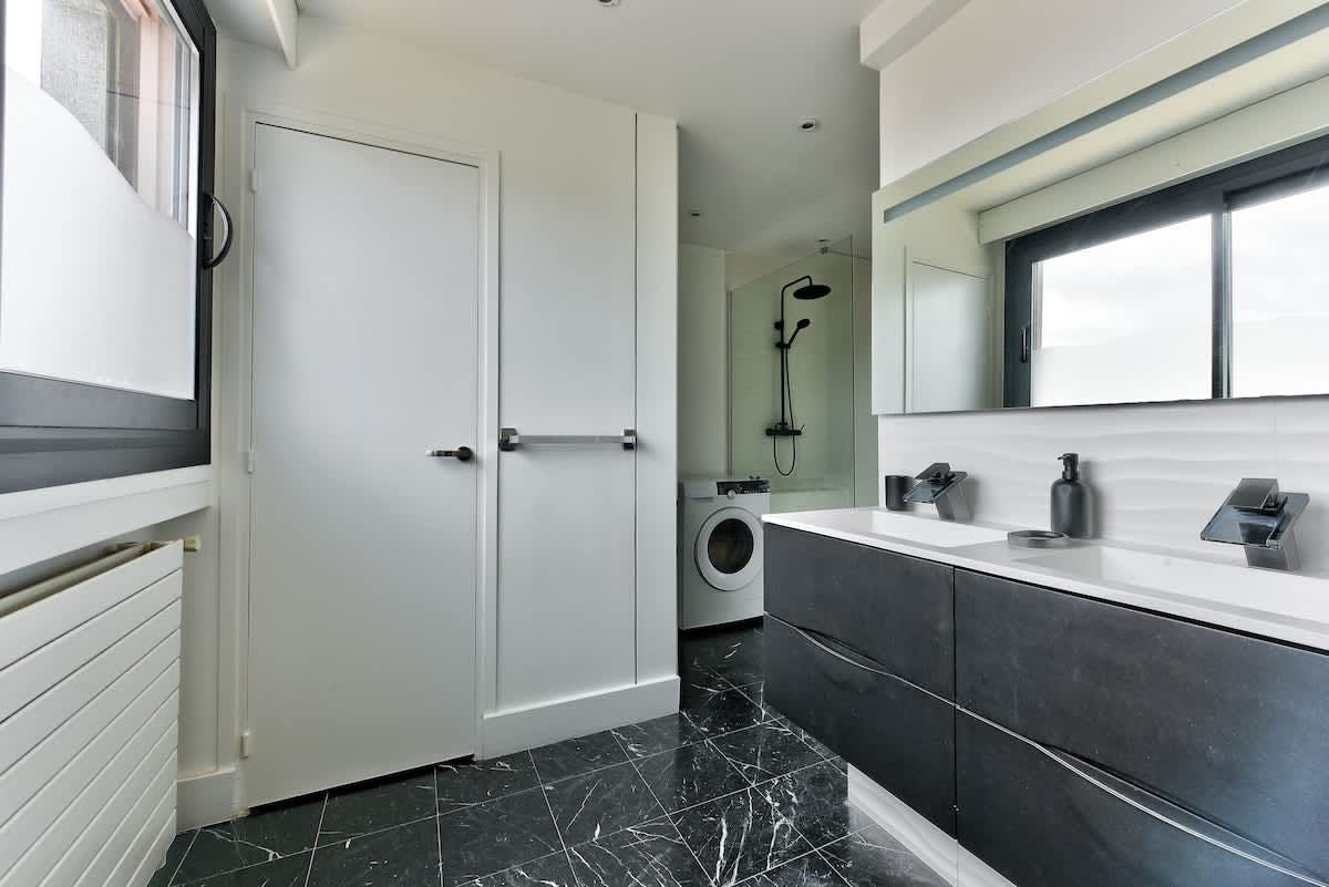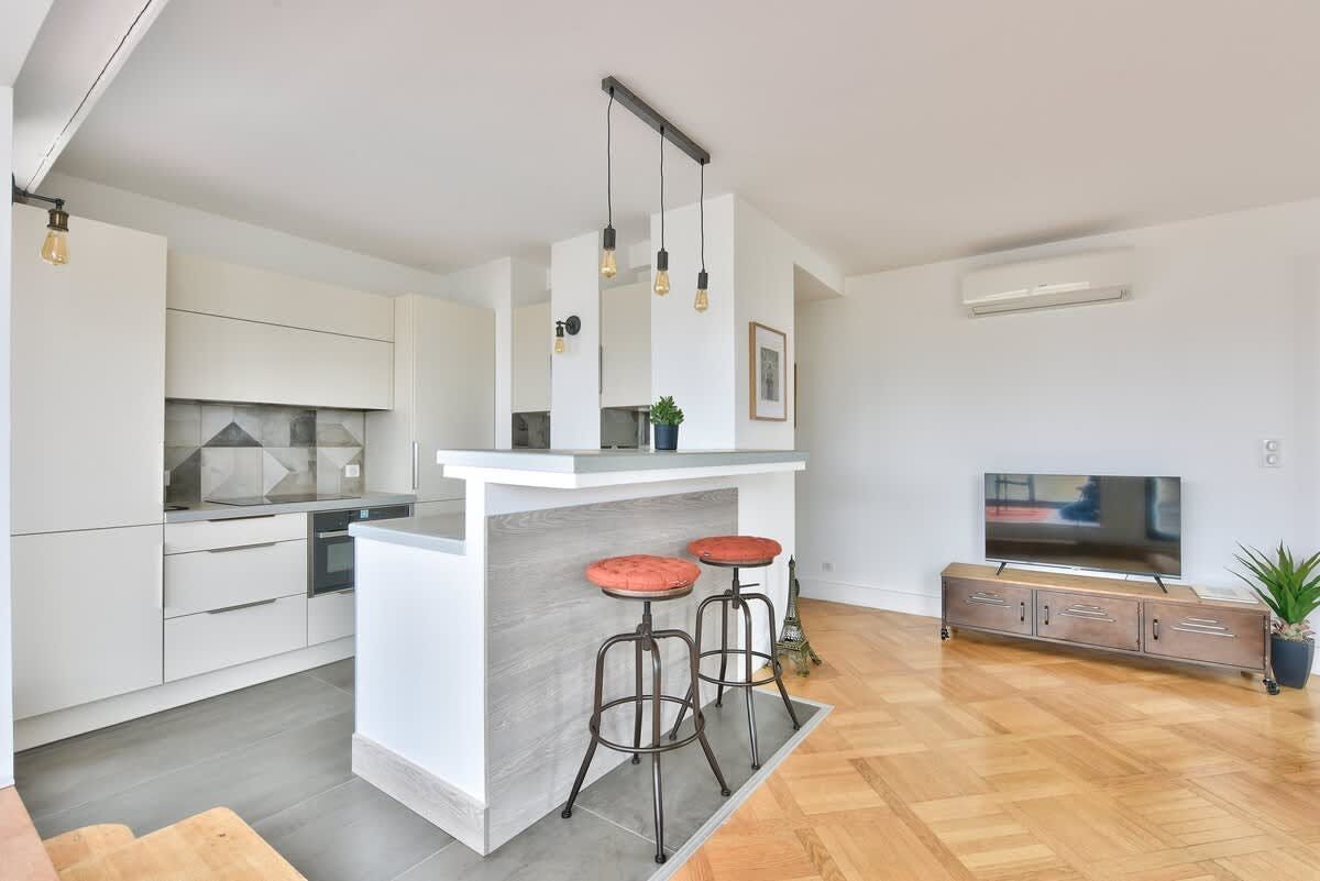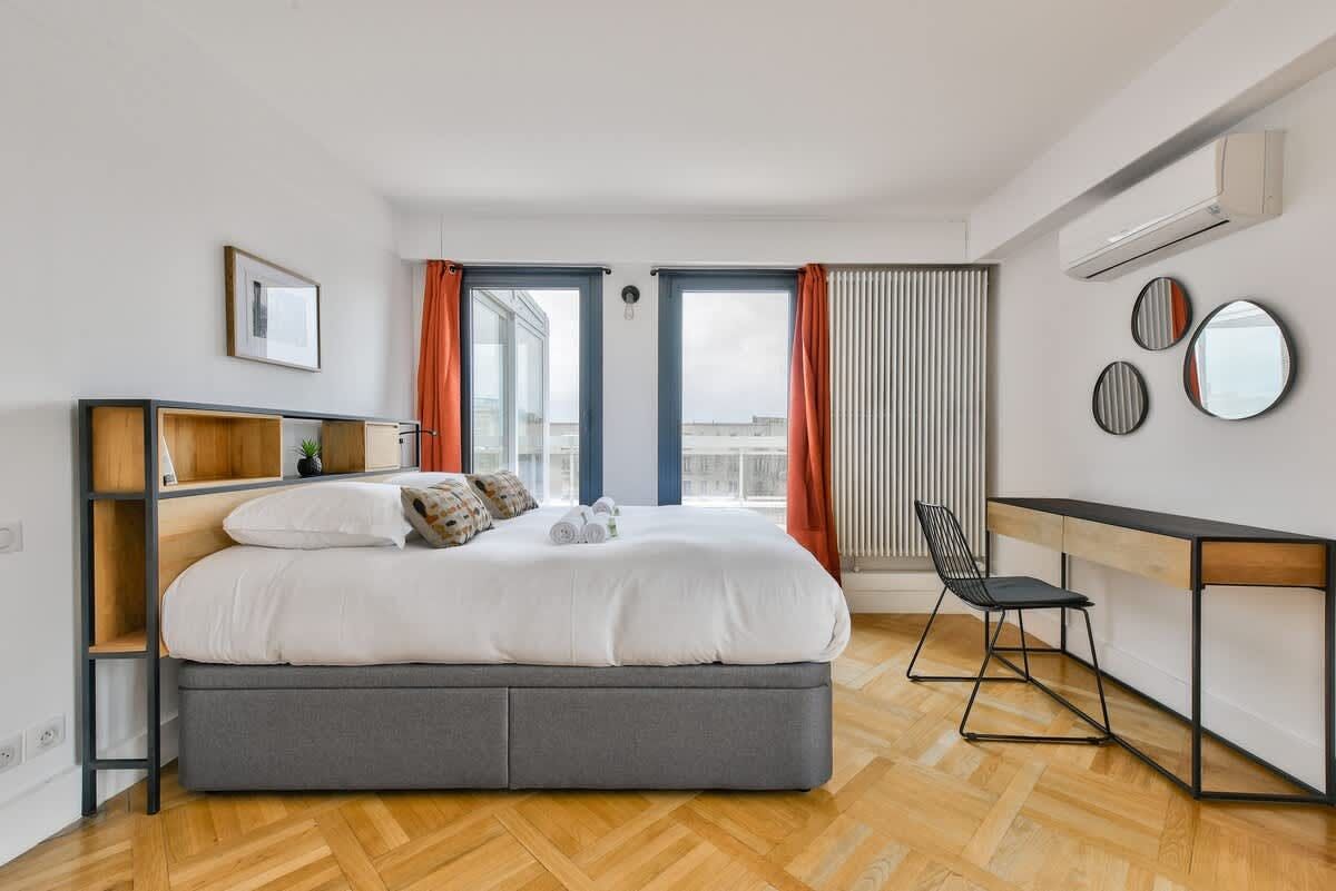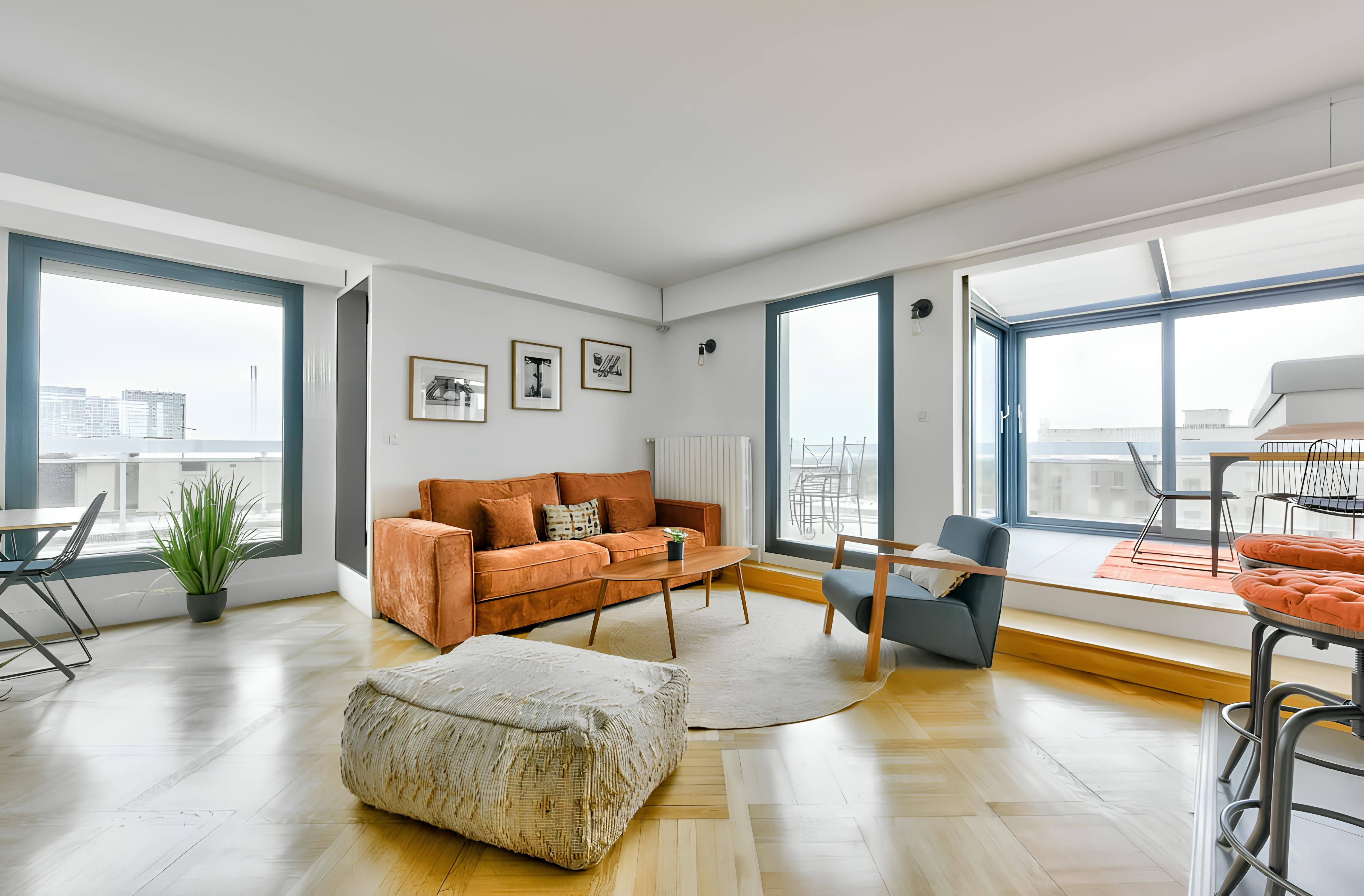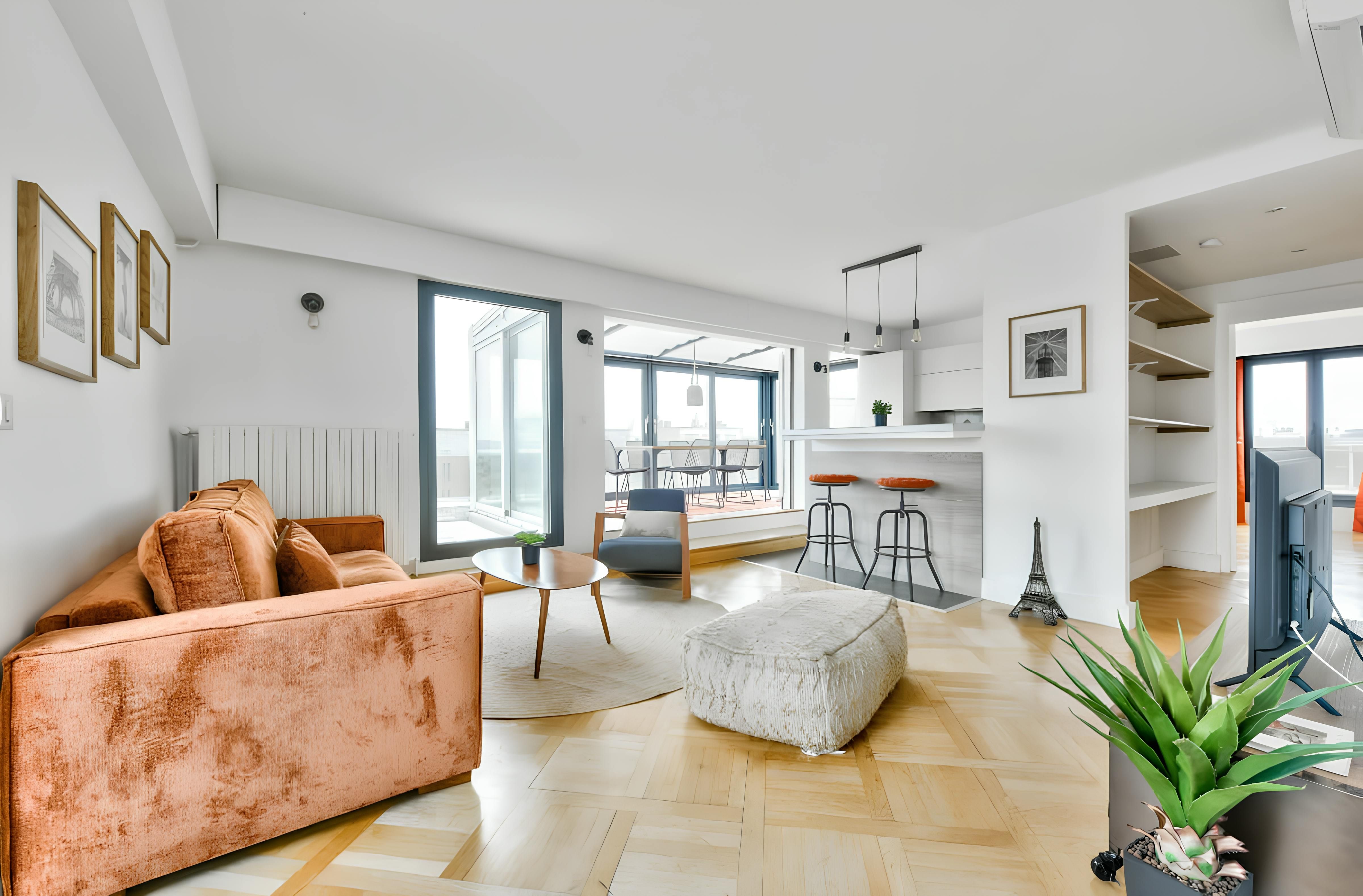 Does a stay in Paris get any better than waking up to views of the Eiffel Tower? This apartment comes with terraces and sweeping 360-degree views of the city, so you can watch the sunrise with your coffee and toast the evening as the tower sparkles after dark. Inside, there’s an open-plan kitchen and living area, a bright dining space wrapped in glass windows, and even a desk corner for catching up on emails. And when you’re ready to explore, you’re perfectly placed – the Seine, Trocadéro, and metro stops that whisk you across the city are all just a short stroll away.