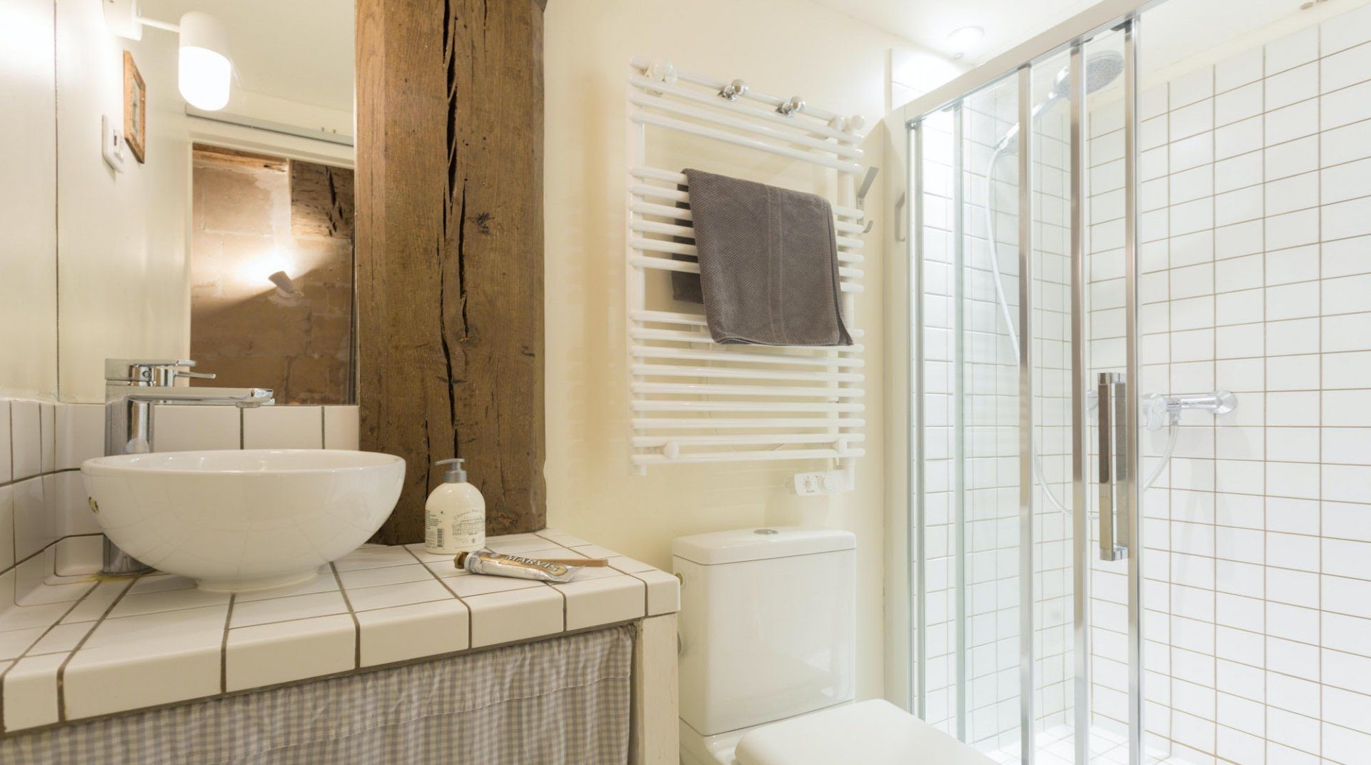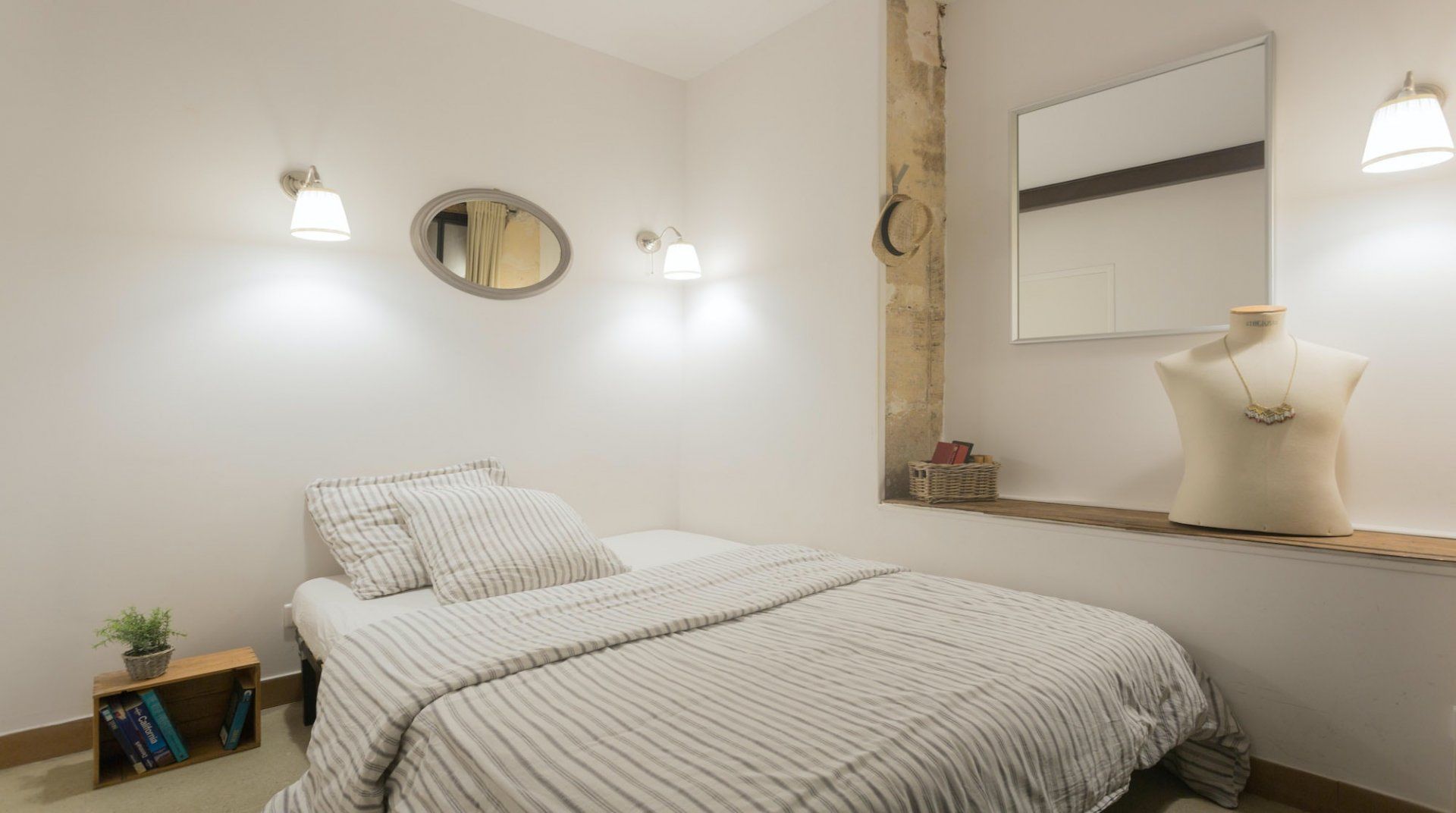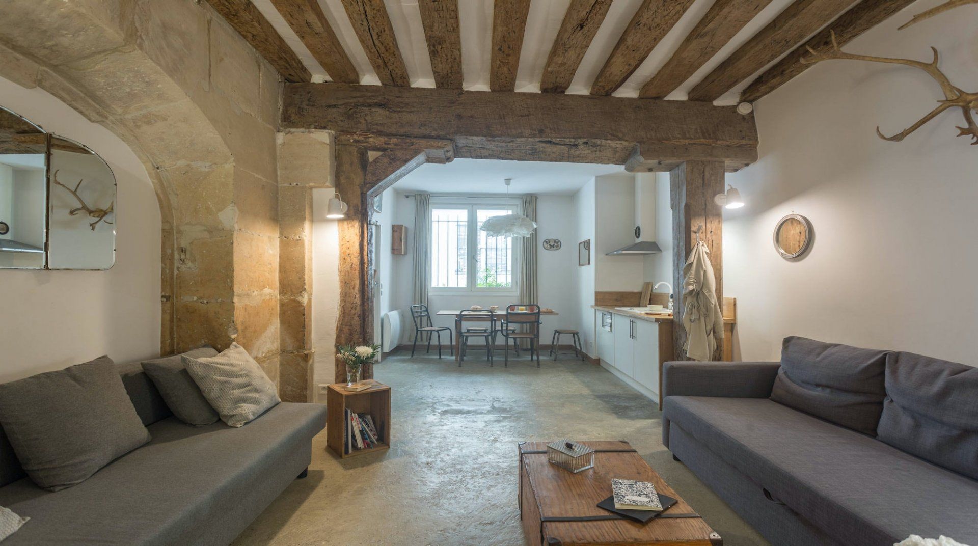 Nestled at the bottom of a private cul-de-sac, sits this authentic little home – and this one's a real charmer. Stepping in to look around, you'll be struck by the rustic interiors that make the space feel homely and warming, with its exposed wooden beams and an impressive stone archway. Whip up a croque madame in the country-house style kitchen – complete with a light-filled dining area that we really loved. With the bedroom at the back of the apartment through an industrial-esque sliding door, the area is quiet and cosy – the modern panelled windows divide the space up in elegant fashion. Inside, there's plenty of characterful touches, including a glamorous feature necklace. Beyond this traditional treasure, you'll find a friendly locale and neighbourhood that's within a twenty-minute stroll from the historic Notre Dame Cathedral. Inside and out, this spot is a natural beauty.