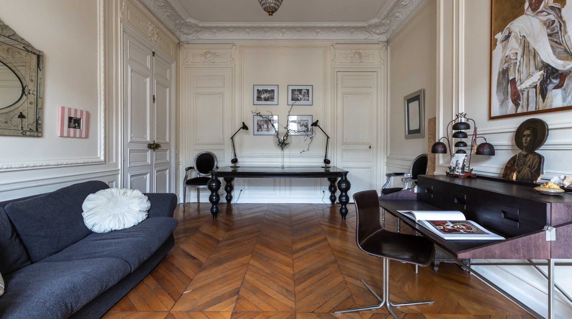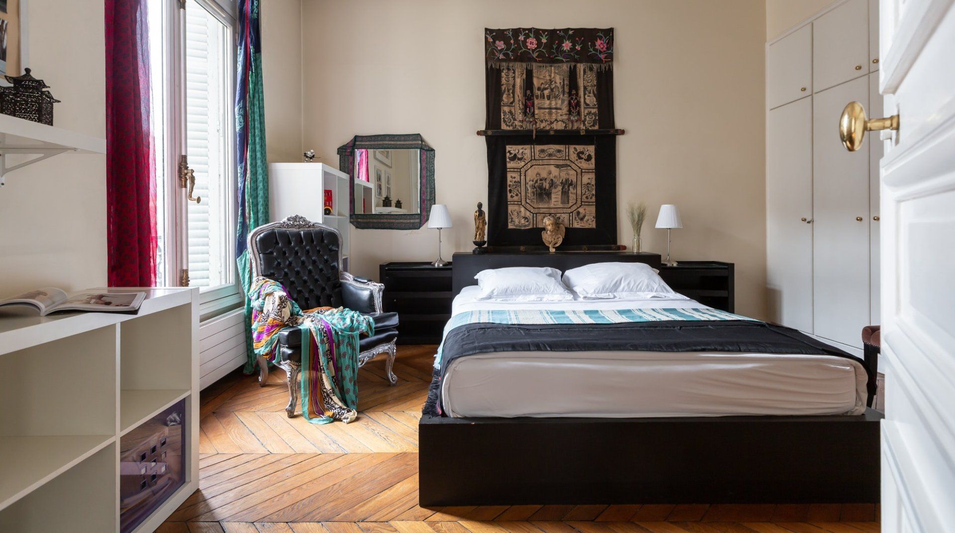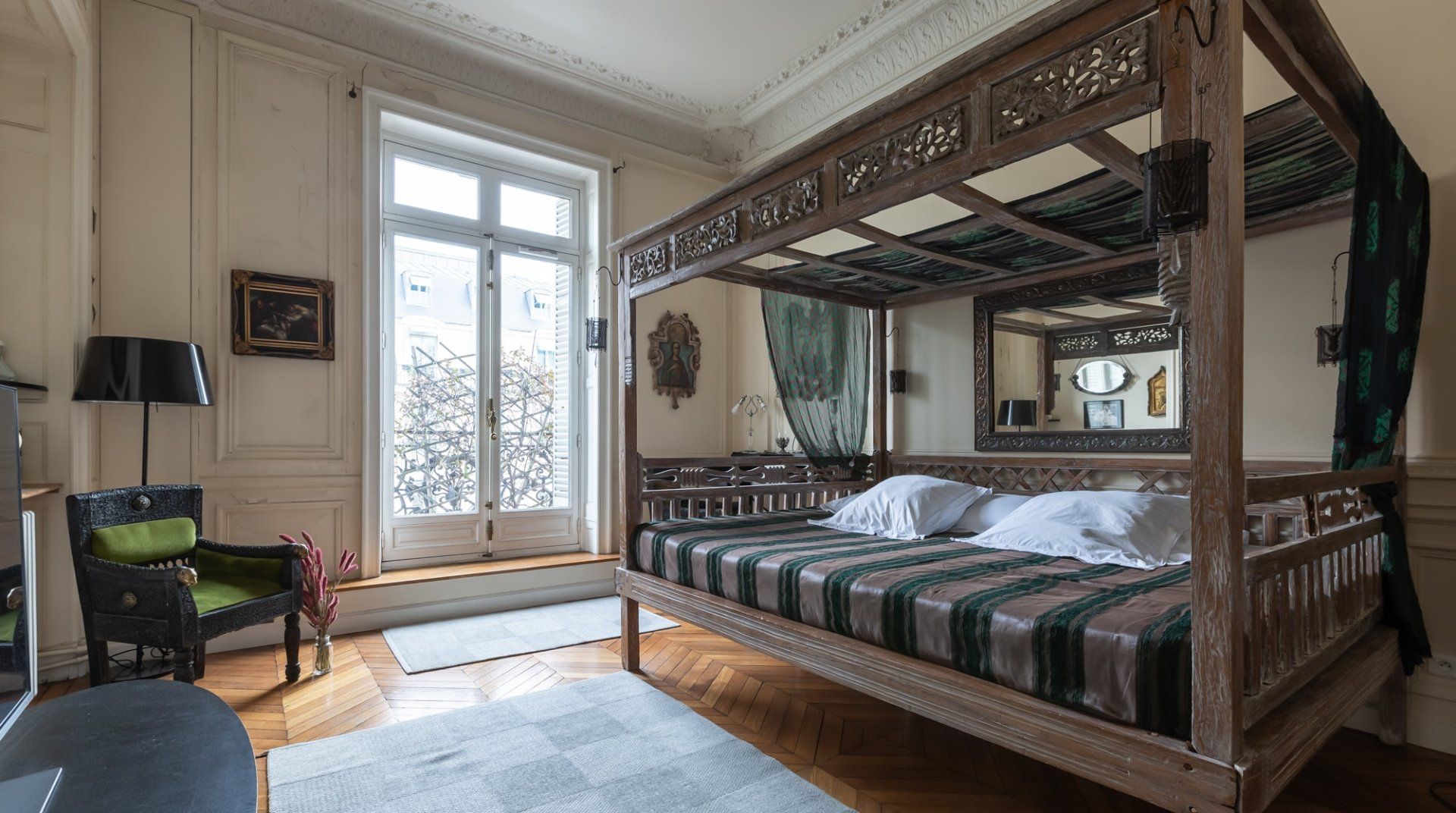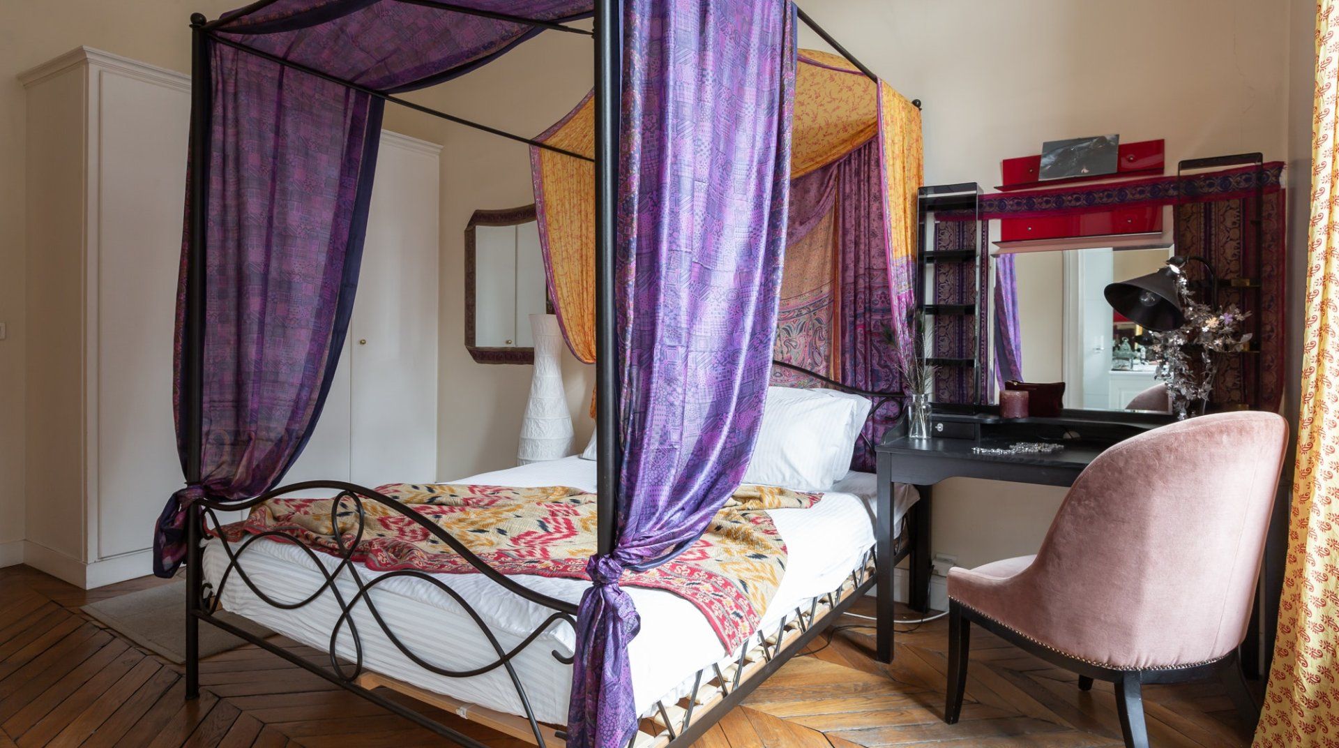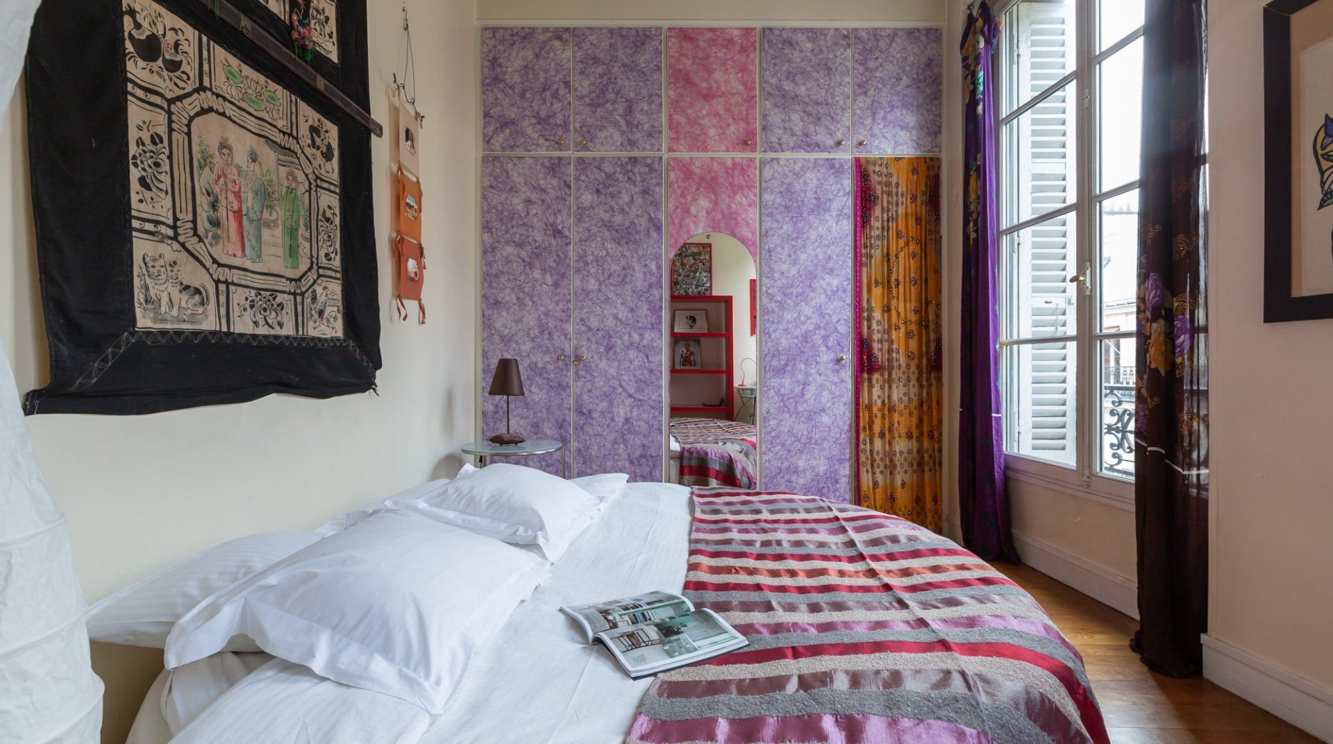 Parquet flooring, ornate wainscotting, and Juliet balconies at every window – this apartment is the epitome of Parisian chic. Brimming with worldly antiques (including a Buddha statue) as well as striking artwork, the atmosphere here is eclectic and grand. Frankly, we can't get enough of this place – imagine waking up to the sunlight streaming through the sash windows, enjoying a luxurious breakfast in the breezy kitchen and sipping coffee as you overlook the city streets. There are two impressive living areas (one doubles as a study), so there's more than enough space for even large groups to spread out. And the bedrooms are a dream, particularly the four-posters draped in vibrant curtains and the unique round bed in the fourth bedroom. You couldn't ask for a better spot to take in the magic of Paris. This home is in the heart of the city, halfway between the Opéra Garnier and the Palais Royal, overlooking the bustling Avenue de l'Opéra. Pyramides Station is right next to the building, while sights like the Louvre and the Tuileries Gardens are less than a ten-minute stroll away.
