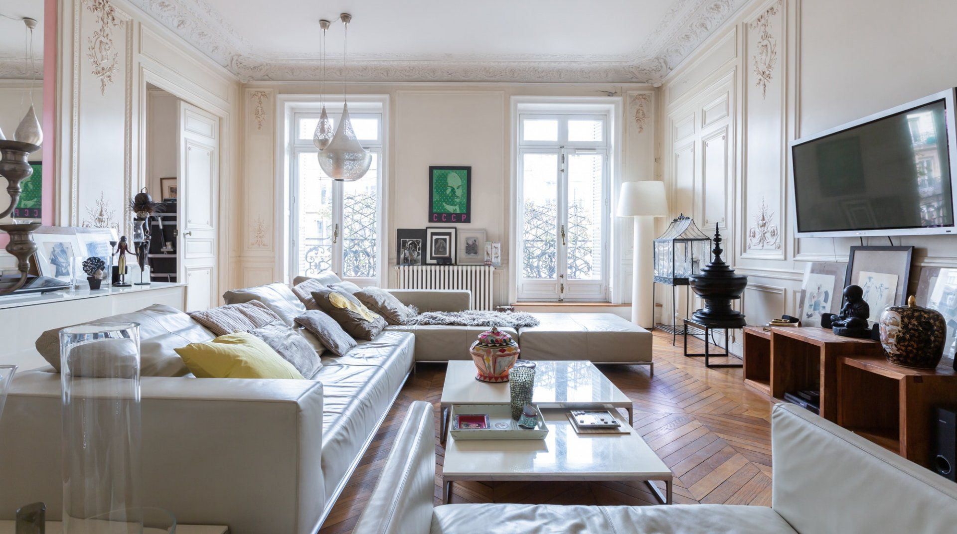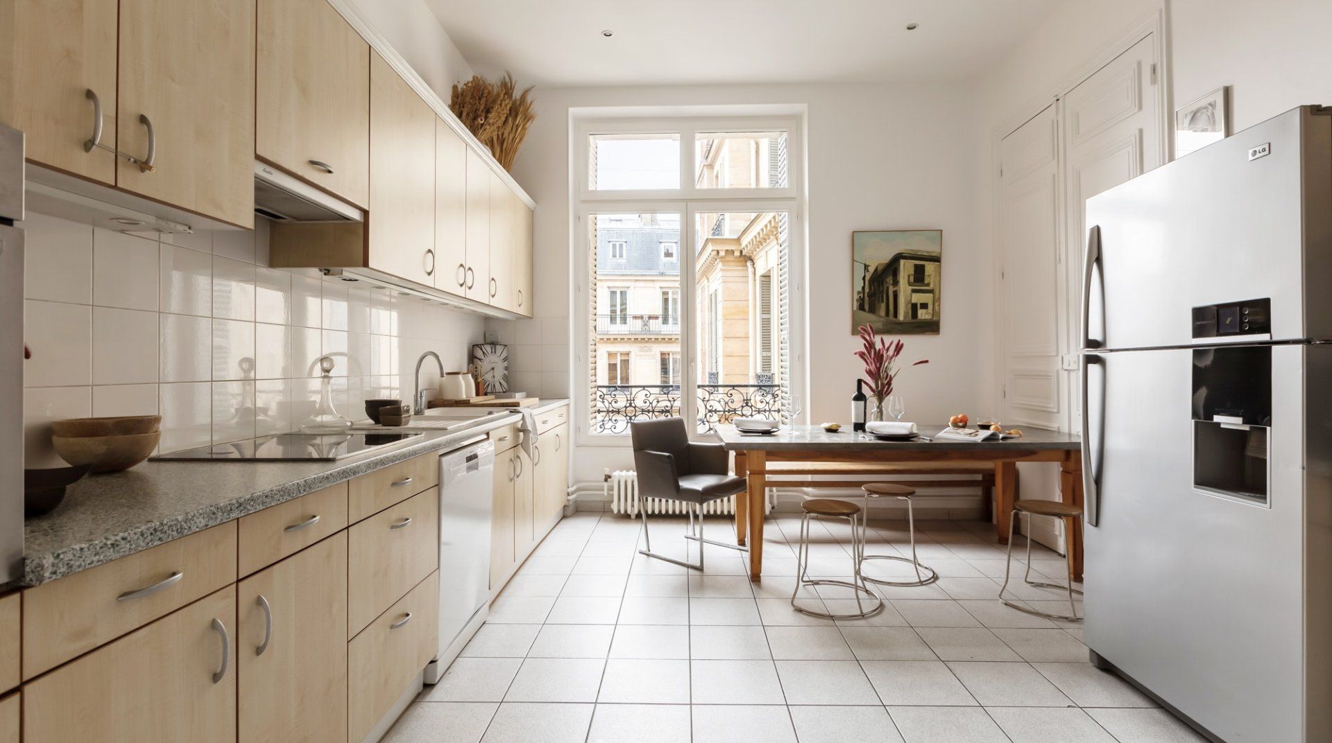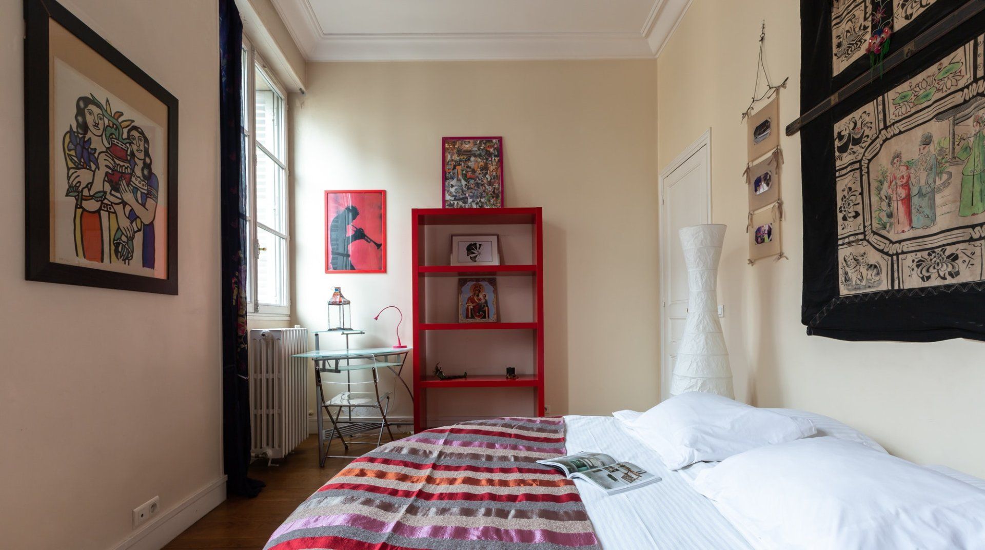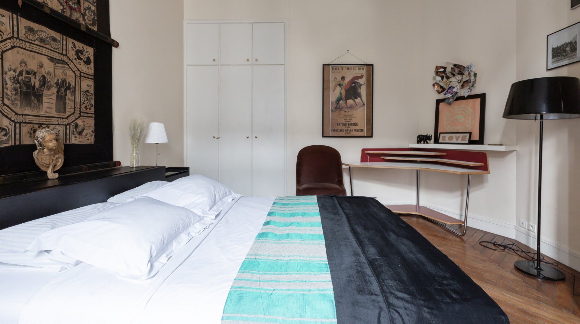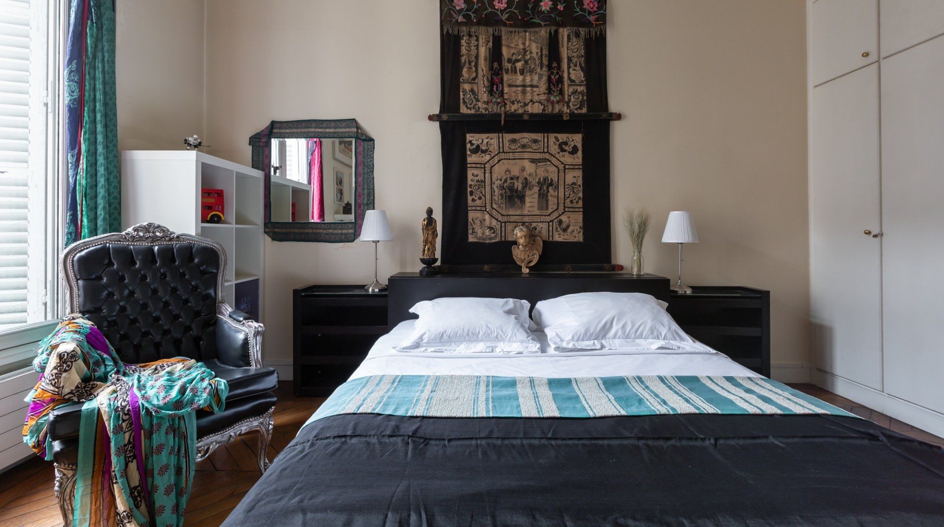 Parquet flooring, ornate wainscotting, and Juliet balconies at every window – this apartment is the epitome of Parisian chic. Brimming with worldly antiques (including a Buddha statue) as well as striking artwork, the atmosphere here is eclectic and grand. Frankly, we can't get enough of this place – imagine waking up to the sunlight streaming through the sash windows, enjoying a luxurious breakfast in the breezy kitchen and sipping coffee as you overlook the city streets. There are two impressive living areas (one doubles as a study), so there's more than enough space for even large groups to spread out. And the bedrooms are a dream, particularly the four-posters draped in vibrant curtains and the unique round bed in the fourth bedroom. You couldn't ask for a better spot to take in the magic of Paris. This home is in the heart of the city, halfway between the Opéra Garnier and the Palais Royal, overlooking the bustling Avenue de l'Opéra. Pyramides Station is right next to the building, while sights like the Louvre and the Tuileries Gardens are less than a ten-minute stroll away.