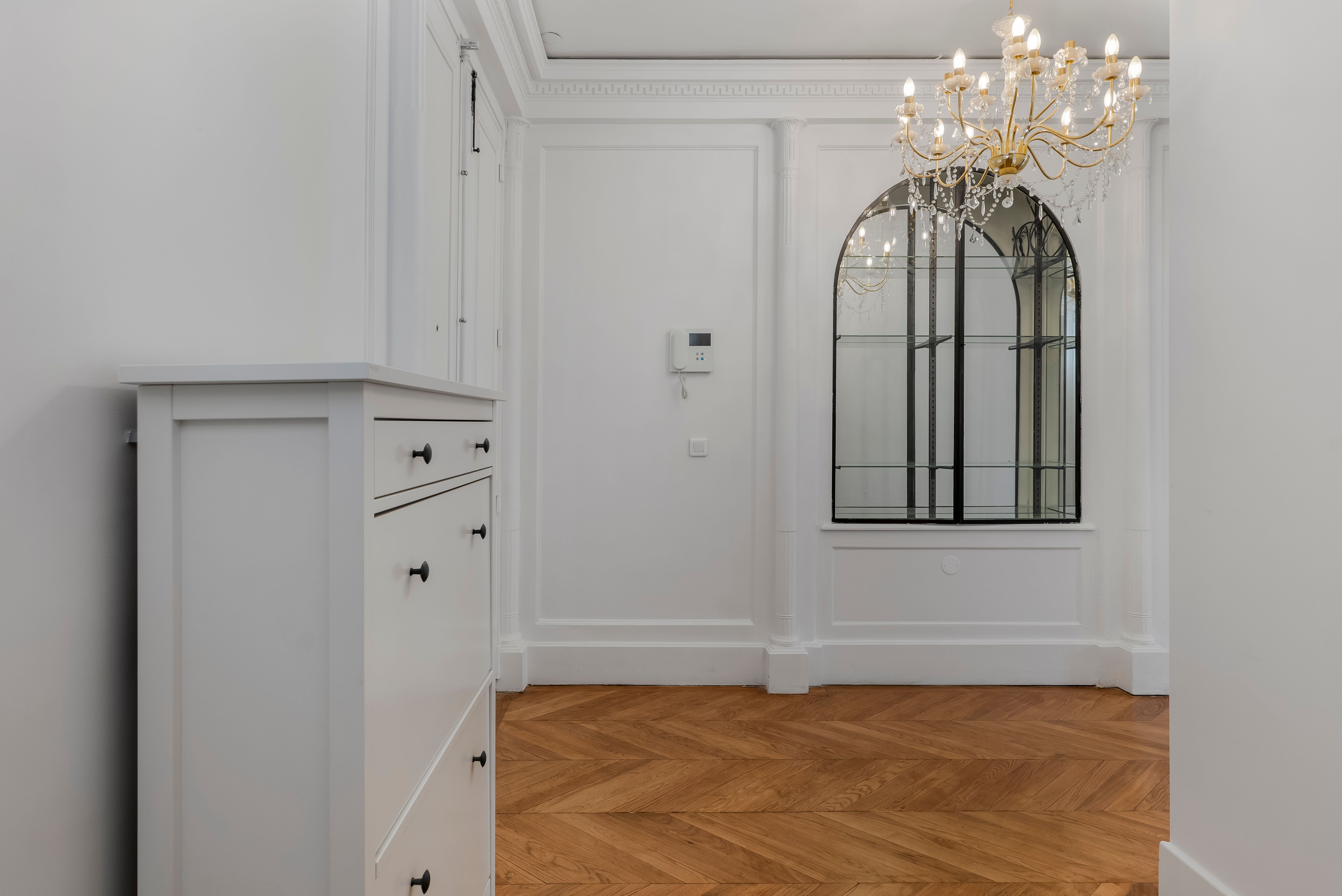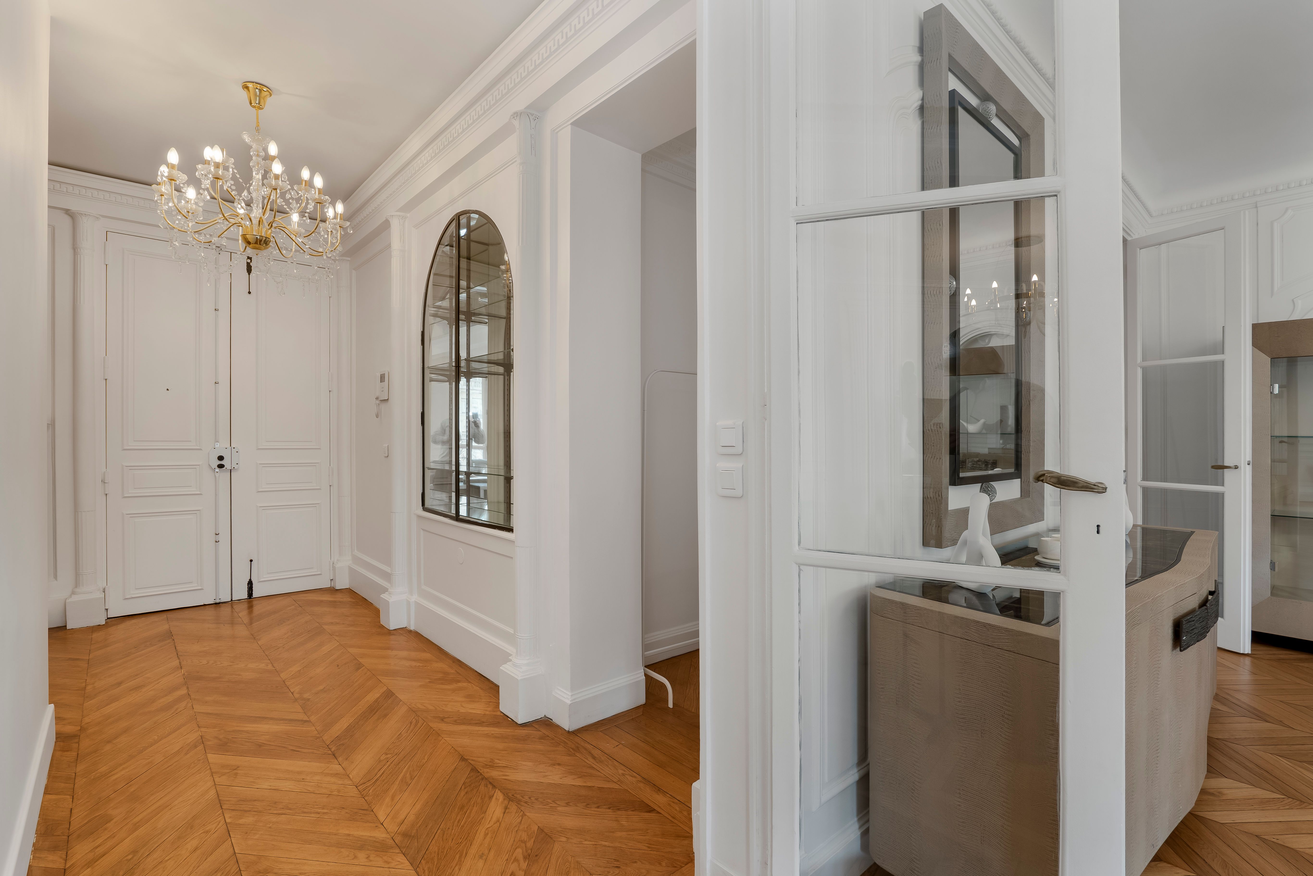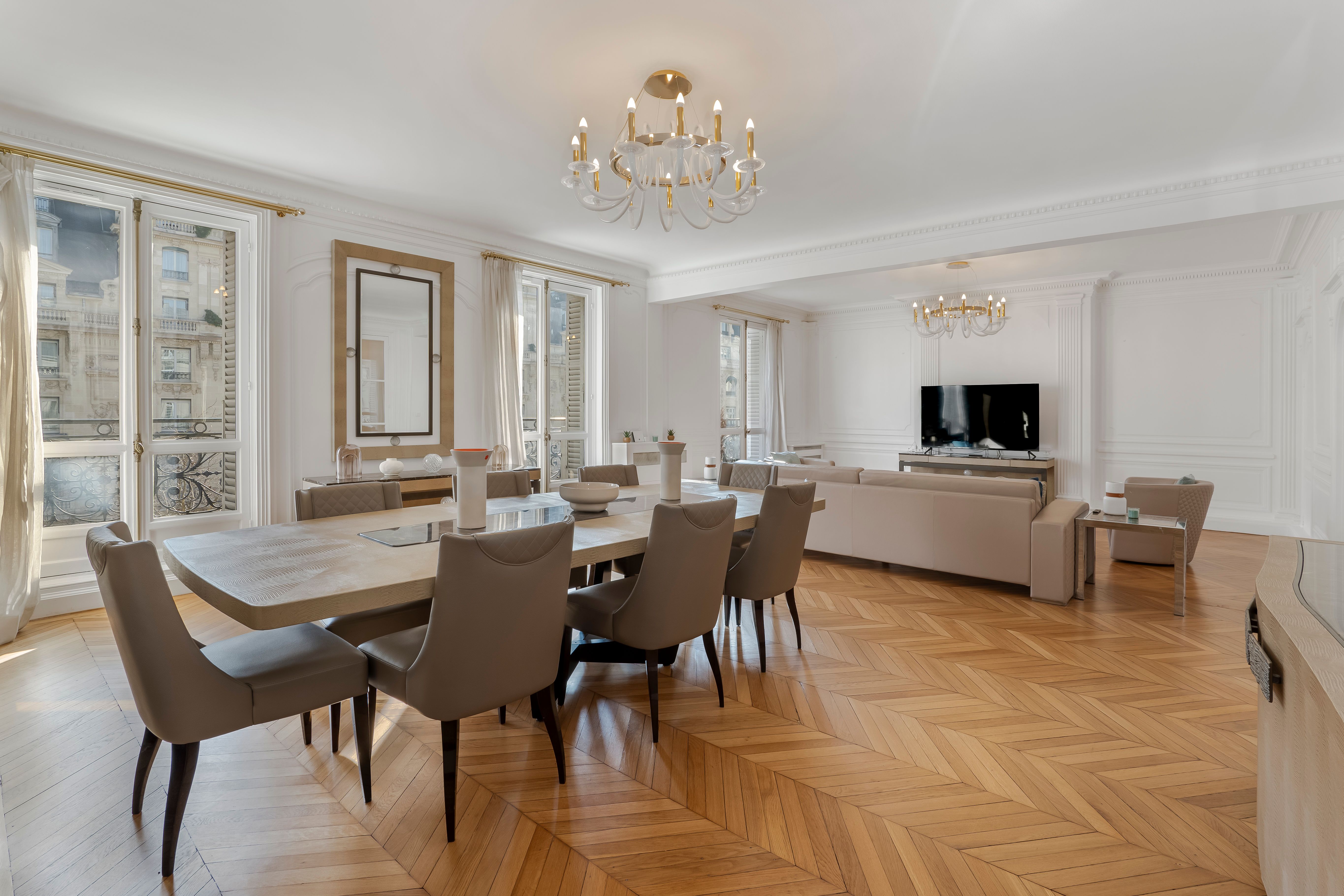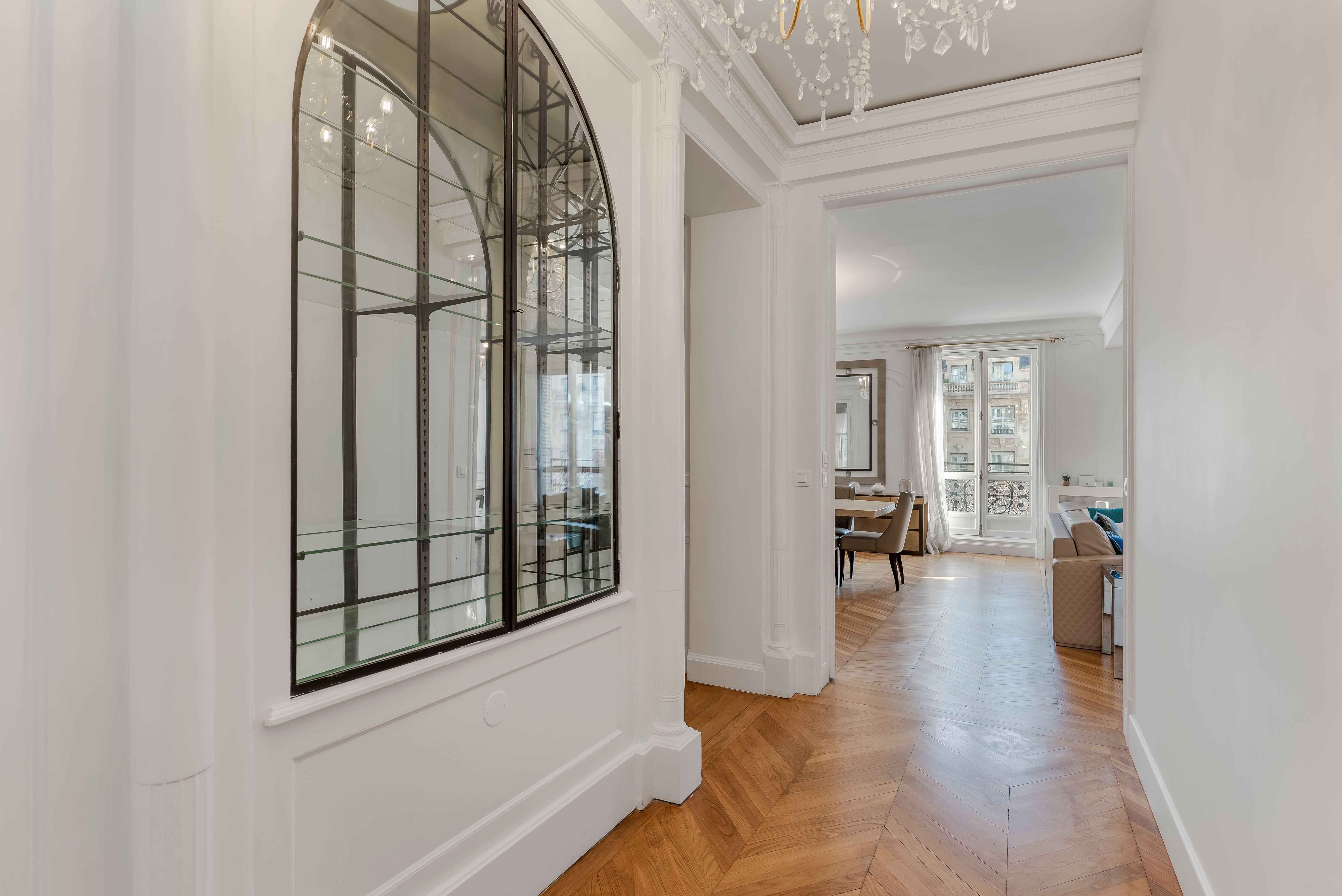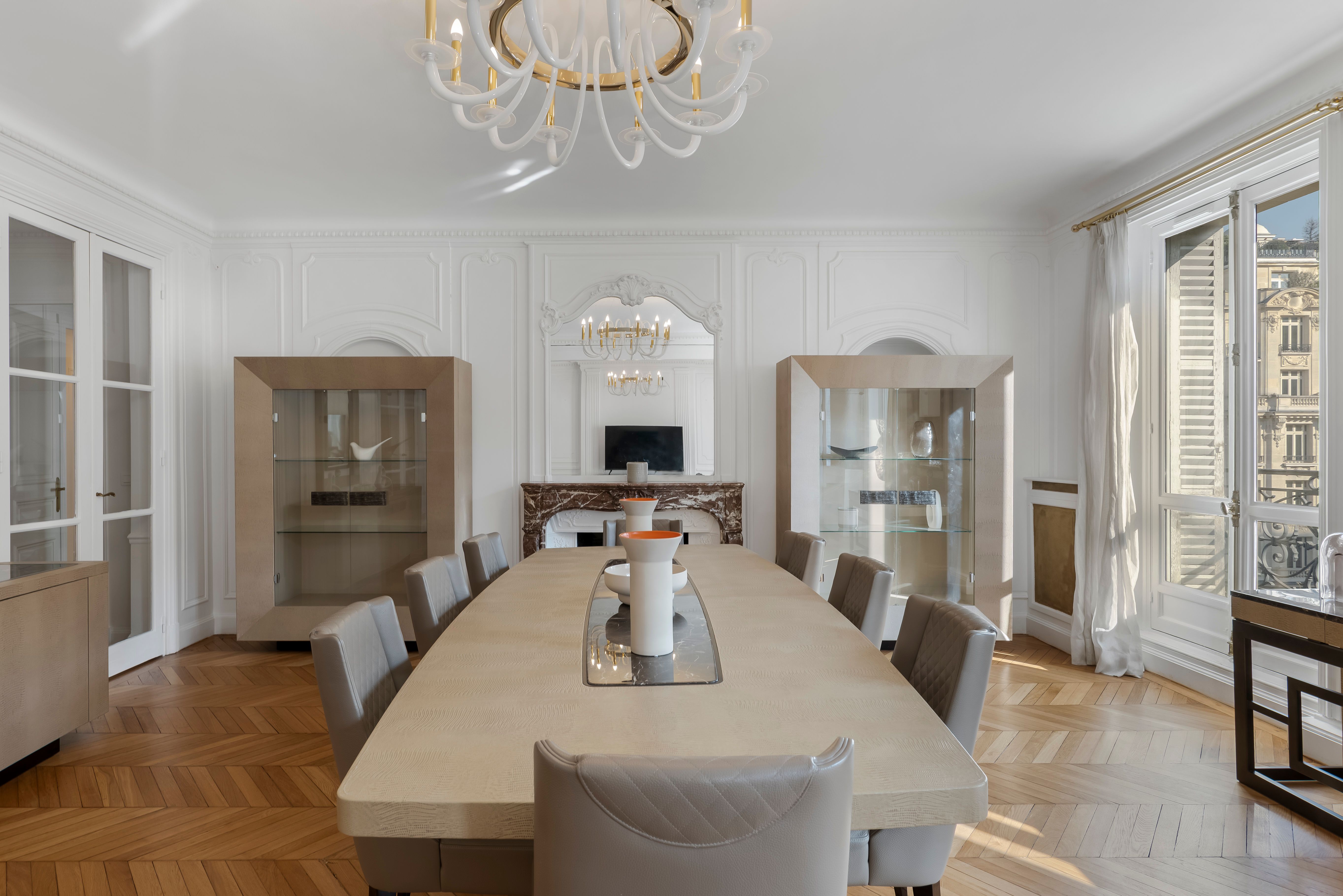 Step into a world of unparalleled Parisian opulence in this extraordinary apartment. Offering a blend of timeless grandeur and modern refinement, this apartment boasts soaring ceilings with intricate moldings and plasterwork, and majestic floor-to-ceiling windows that look out onto Avenue Kléber. From this prestigious 16th arrondissement, it’s a short stroll to the Arc de Triomphe and the Champs-Élysées. You’ll also be within easy reach of the Eiffel Tower and the Trocadéro. When you’re not exploring Paris, you’ll delight in the regal style of this beautiful home, with its formal dining room, grand living room, and world-class amenities.