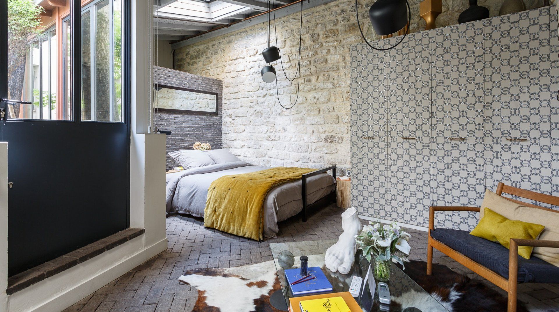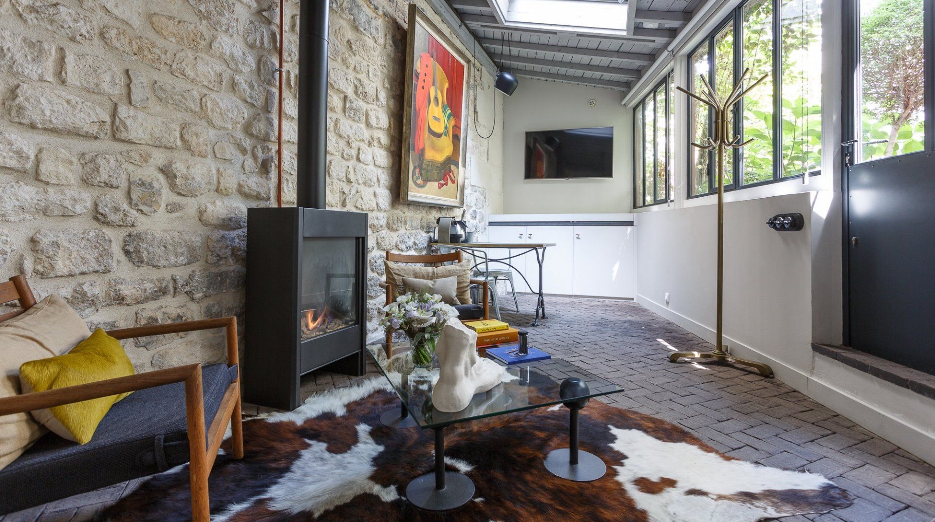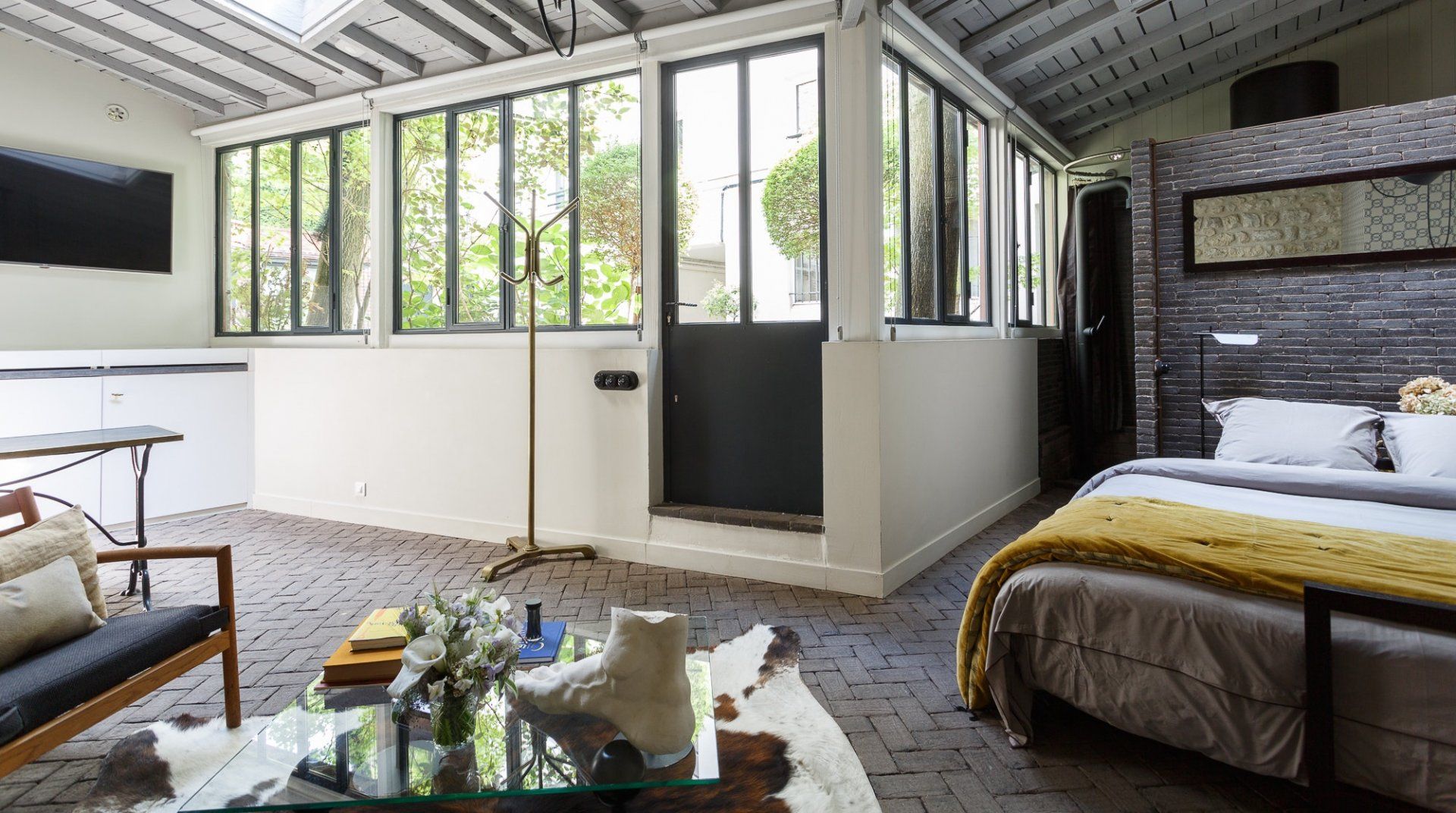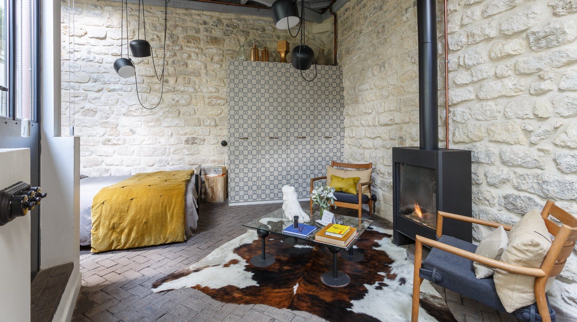 Industrial chic meets chalet style in this truly unique loft-inspired cottage in the heart of Paris’ 6th arrondissement. Located in a peaceful courtyard framed by trees dating back to the 17th century, this home is ideal for a couple or solo traveller looking for a quiet slice of country living in the middle of the city. Large windows along the length of the walls and skylights on the sloped ceiling allow plenty of natural light to shine through, while the stone walls and floors create an instant feeling of cottage cosiness. We love how the soft textures of the cowhide rug and colourful cushions contrast with the industrial-looking gas fireplace in the living area, where mid-century modern chairs invite you to sit back with a glass of wine. The comfortable bedroom nook framed by a brick wall offers an endlessly peaceful night’s sleep in this quiet corner of the city, while the New York-style bathroom with its industrial shower is a treat to wake up to each morning. Head out to the courtyard to enjoy a cup of coffee by the fountain and luxuriate in the stillness of your cottage hideaway. When you’re ready to explore, you’ve got plenty of sights within easy walking distance, including the beautiful Luxembourg Gardens (six minutes away), the Musée d'Orsay (twenty minutes away) and the Eiffel Tower (a thirty-five-minute stroll from your door).