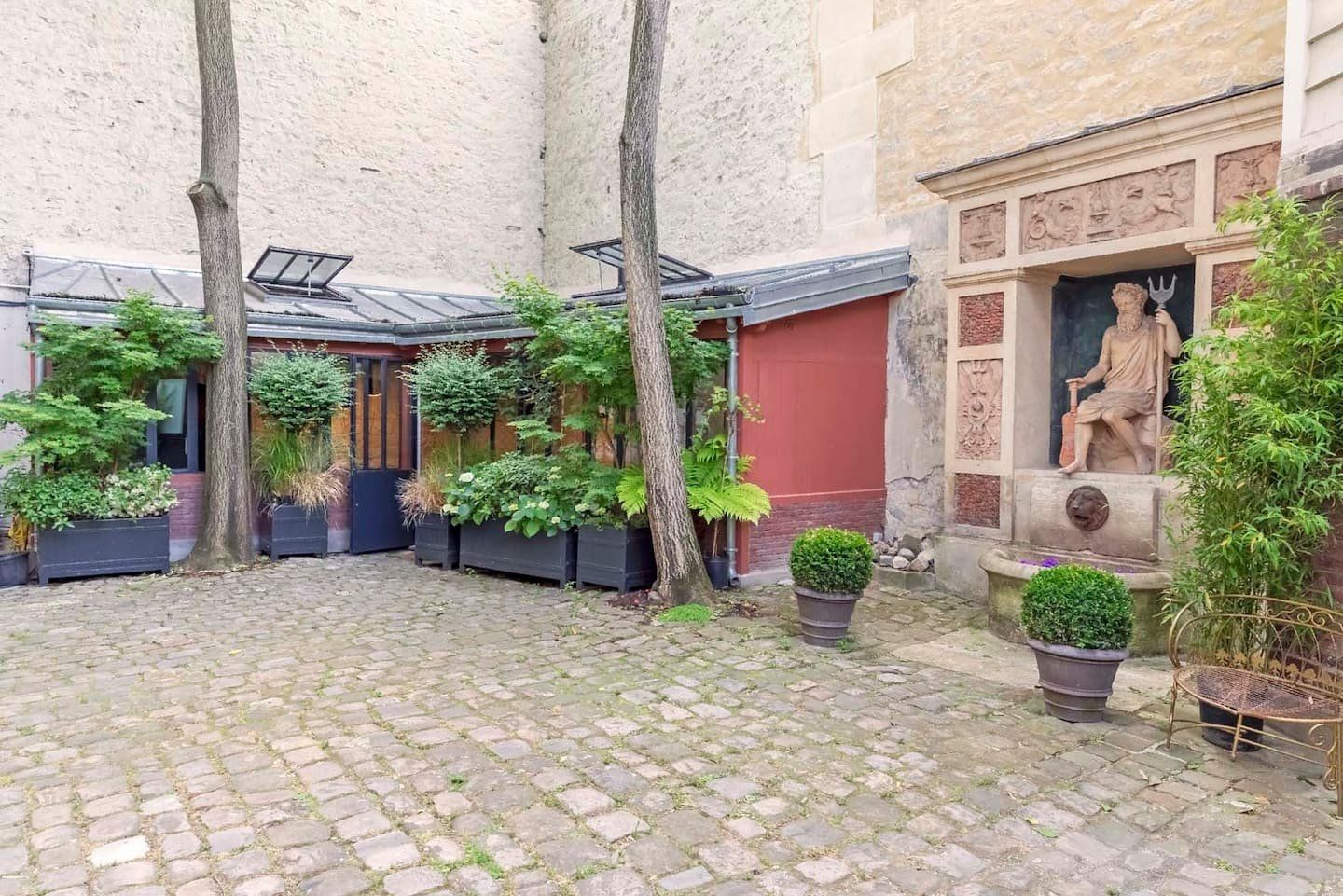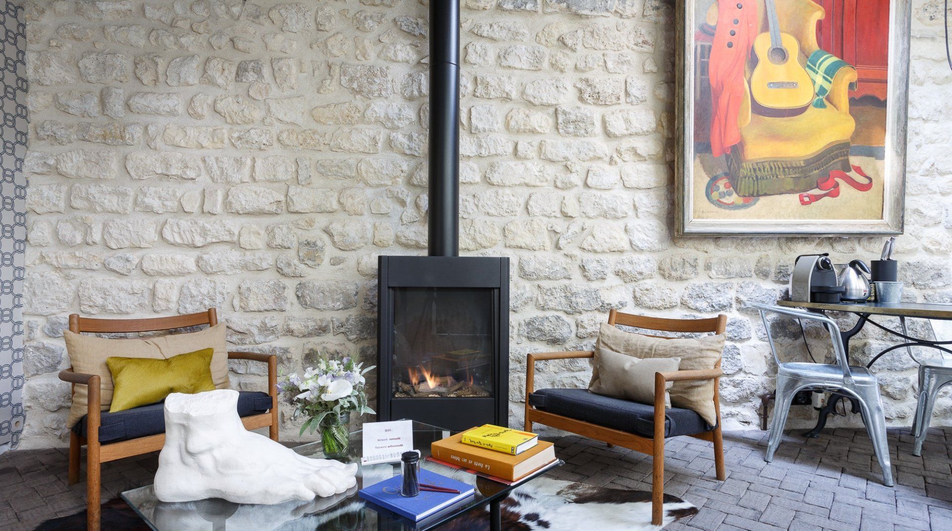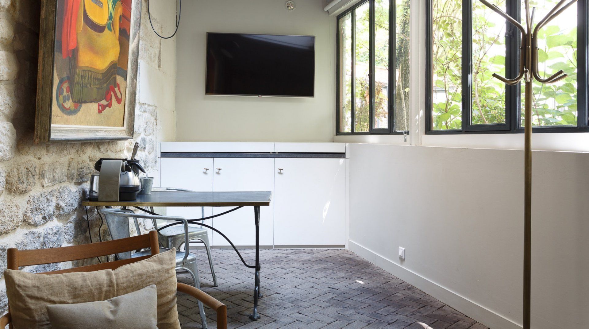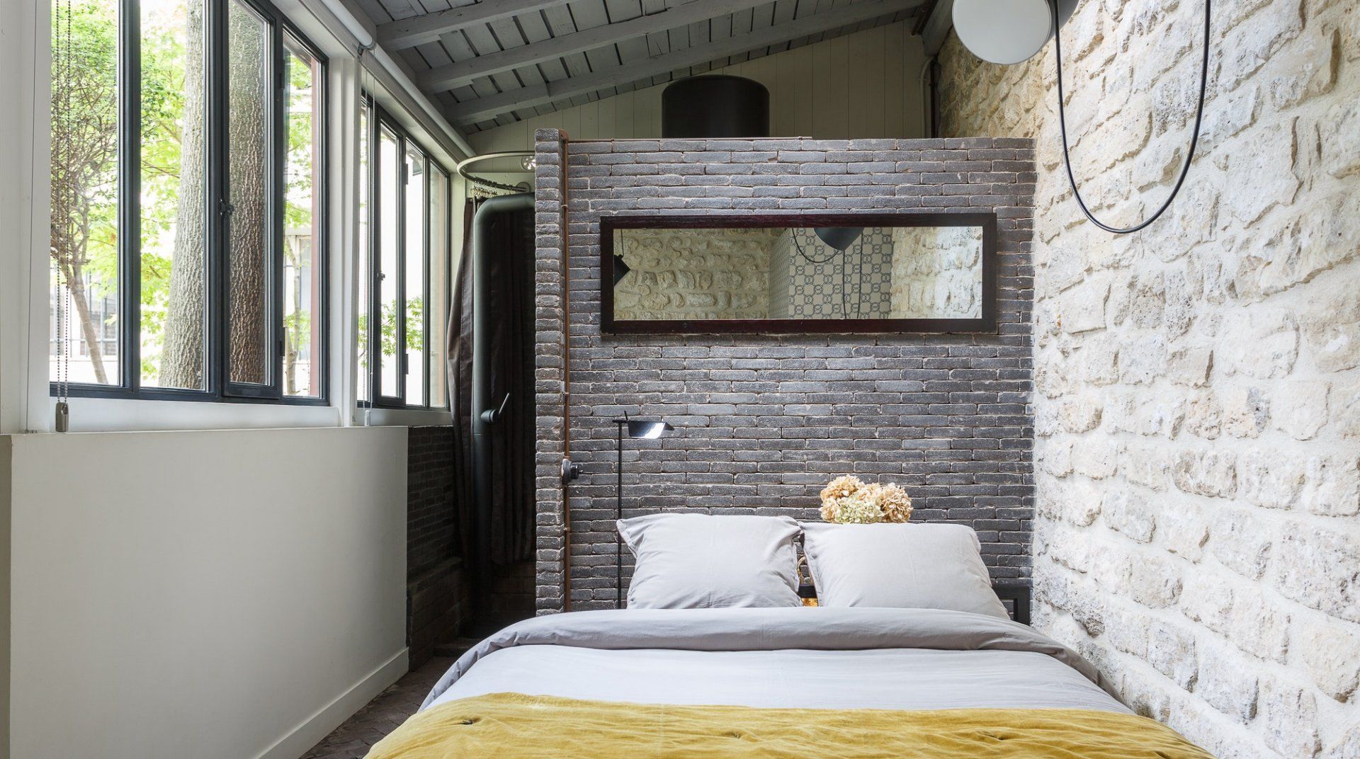 Industrial chic meets chalet style in this truly unique loft-inspired cottage in the heart of Paris’ 6th arrondissement. Located in a peaceful courtyard framed by trees dating back to the 17th century, this home is ideal for a couple or solo traveller looking for a quiet slice of country living in the middle of the city. Large windows along the length of the walls and skylights on the sloped ceiling allow plenty of natural light to shine through, while the stone walls and floors create an instant feeling of cottage cosiness. We love how the soft textures of the cowhide rug and colourful cushions contrast with the industrial-looking gas fireplace in the living area, where mid-century modern chairs invite you to sit back with a glass of wine. The comfortable bedroom nook framed by a brick wall offers an endlessly peaceful night’s sleep in this quiet corner of the city, while the New York-style bathroom with its industrial shower is a treat to wake up to each morning. Head out to the courtyard to enjoy a cup of coffee by the fountain and luxuriate in the stillness of your cottage hideaway. When you’re ready to explore, you’ve got plenty of sights within easy walking distance, including the beautiful Luxembourg Gardens (six minutes away), the Musée d'Orsay (twenty minutes away) and the Eiffel Tower (a thirty-five-minute stroll from your door).