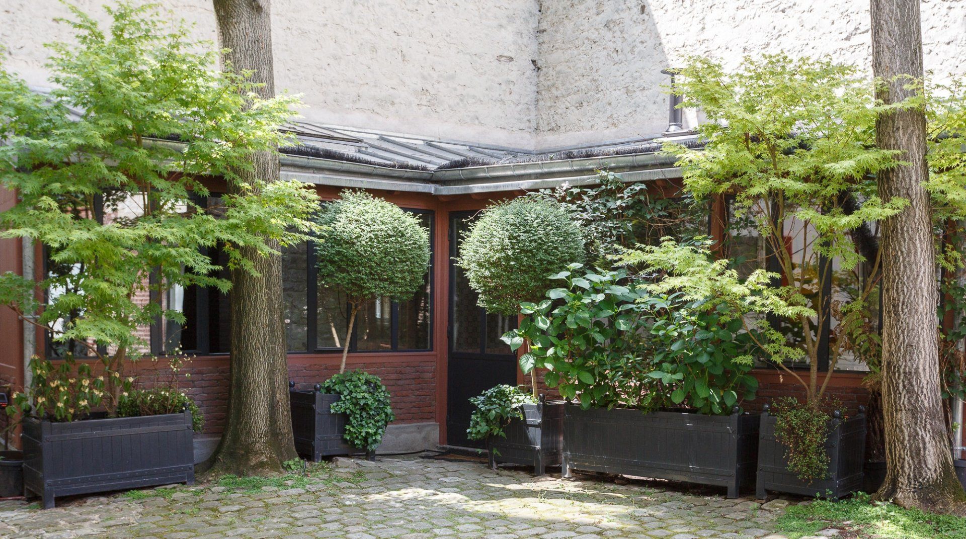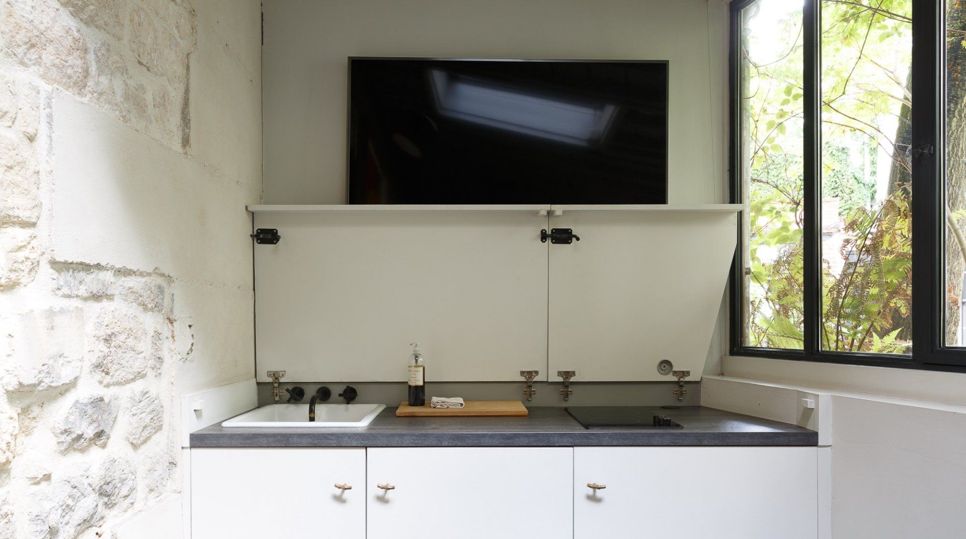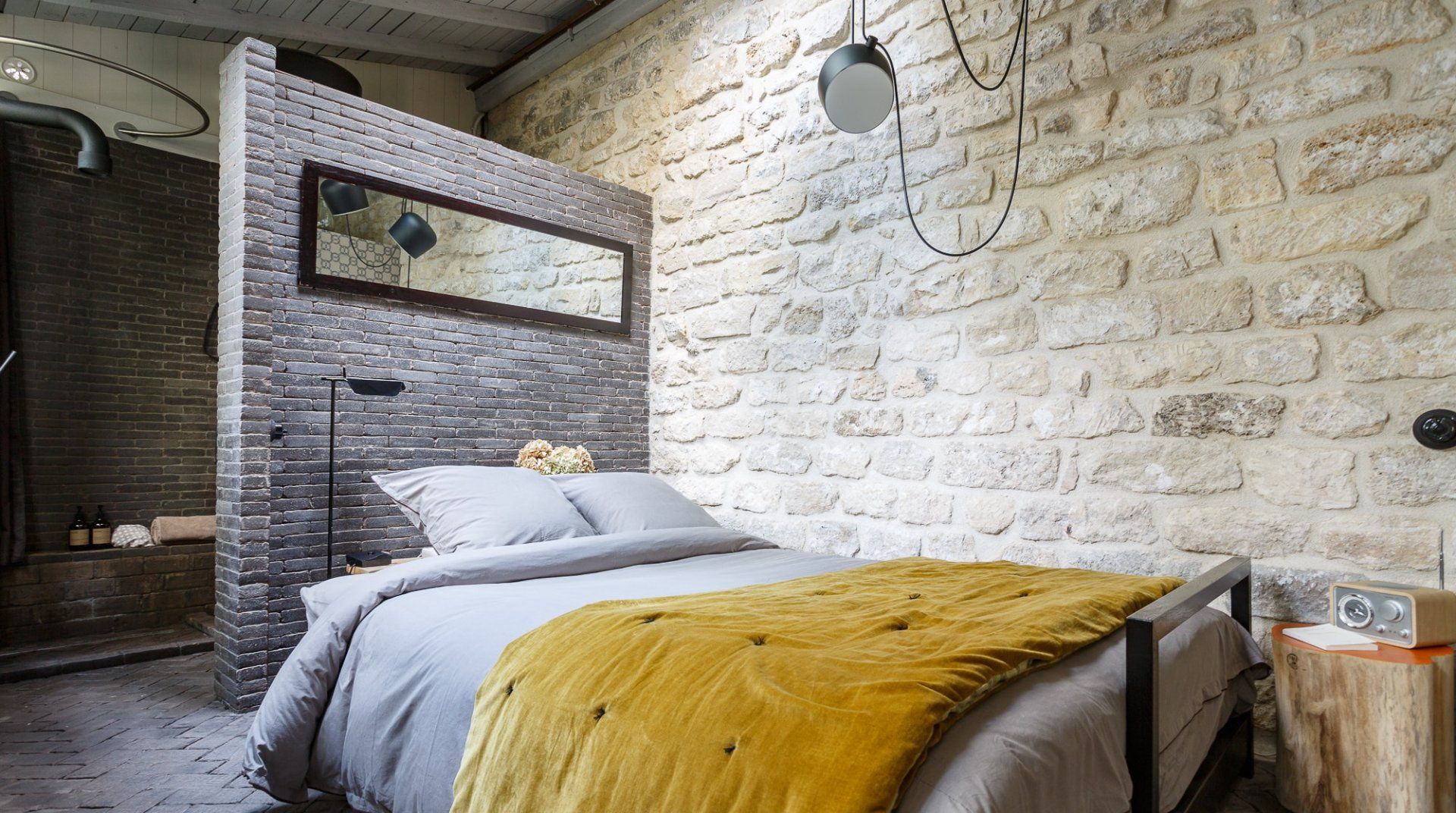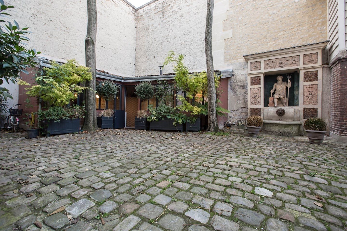 Industrial chic meets chalet style in this truly unique loft-inspired cottage in the heart of Paris’ 6th arrondissement. Located in a peaceful courtyard framed by trees dating back to the 17th century, this home is ideal for a couple or solo traveller looking for a quiet slice of country living in the middle of the city. Large windows along the length of the walls and skylights on the sloped ceiling allow plenty of natural light to shine through, while the stone walls and floors create an instant feeling of cottage cosiness. We love how the soft textures of the cowhide rug and colourful cushions contrast with the industrial-looking gas fireplace in the living area, where mid-century modern chairs invite you to sit back with a glass of wine. The comfortable bedroom nook framed by a brick wall offers an endlessly peaceful night’s sleep in this quiet corner of the city, while the New York-style bathroom with its industrial shower is a treat to wake up to each morning. Head out to the courtyard to enjoy a cup of coffee by the fountain and luxuriate in the stillness of your cottage hideaway. When you’re ready to explore, you’ve got plenty of sights within easy walking distance, including the beautiful Luxembourg Gardens (six minutes away), the Musée d'Orsay (twenty minutes away) and the Eiffel Tower (a thirty-five-minute stroll from your door).