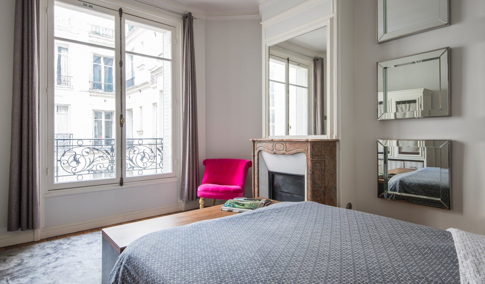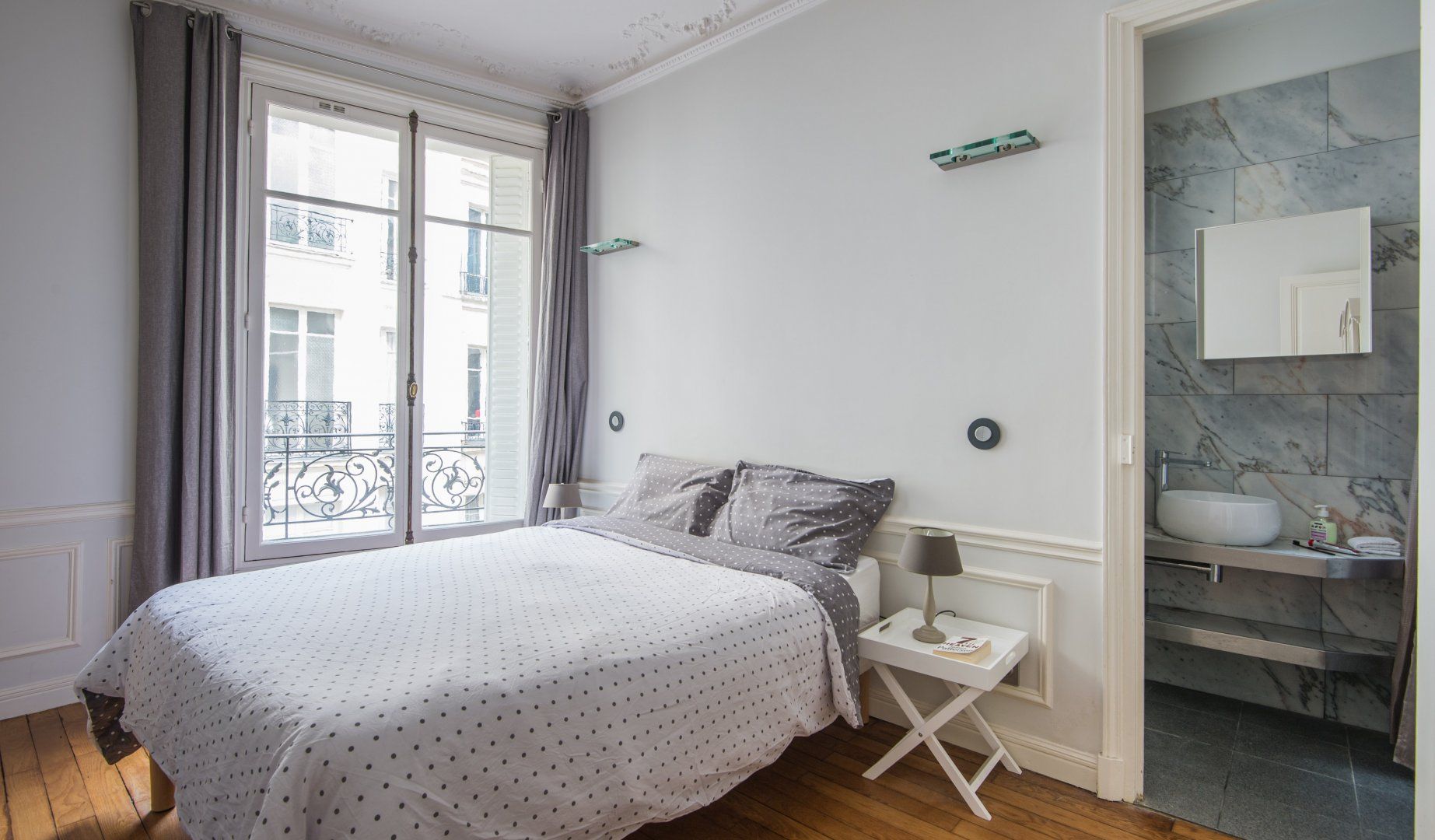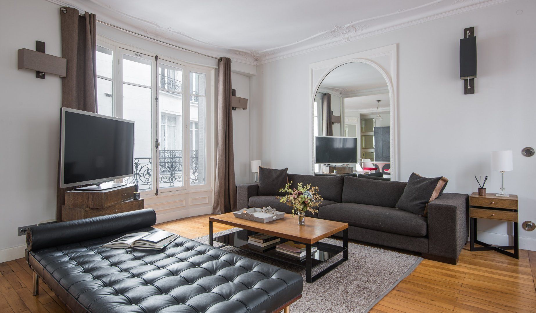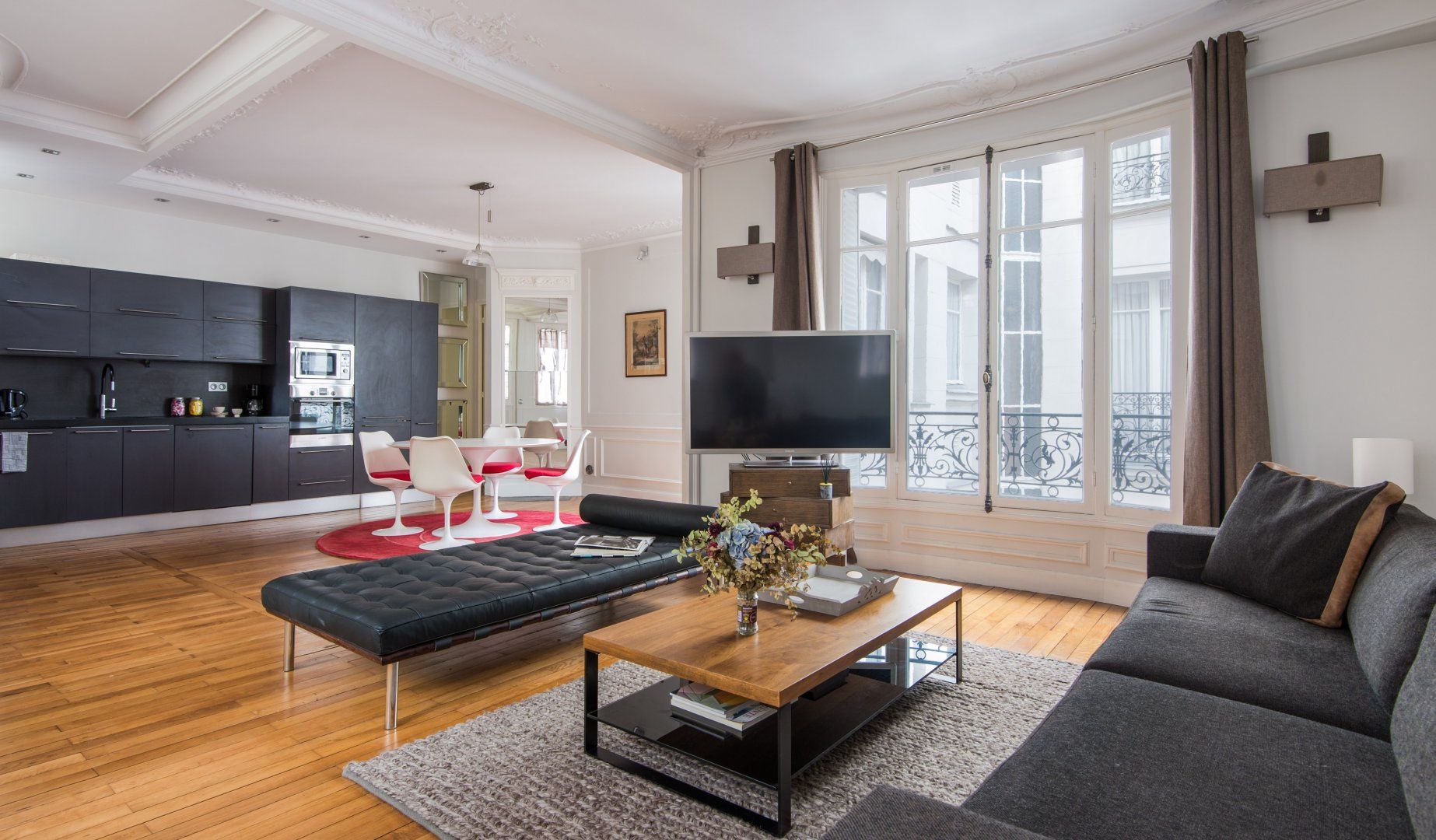 A prime example of Haussmannian elegance, this apartment's period features coexist with modern interiors that are a nod towards mid-century minimalism. What makes it even more attractive is how the lounge blends effortlessly into the kitchen and dining area to really make the most of the living space. We can see ourselves taking an easy stroll between the coffee maker and couch to continue reading Proust with the windows thrown wide open.