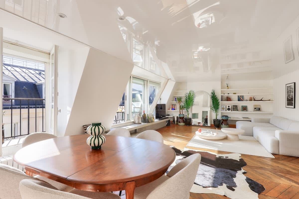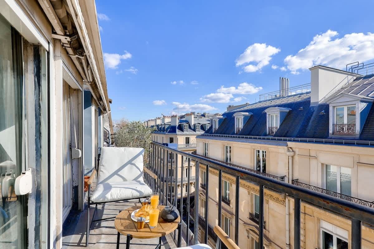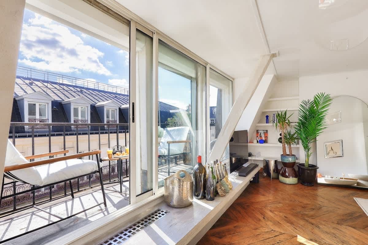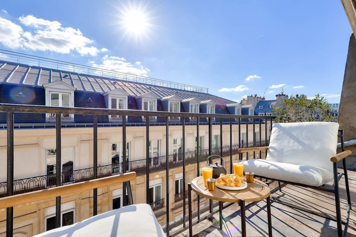You could never tire of returning home to this oh-so-central Parisian home. The south-facing living room, which leads out onto a lengthy balcony with rooftop views, is a knockout. And you’ll be in for a good night’s sleep here. Perched on the top floor, the bedroom overlooks a peaceful internal courtyard. When you’re ready to explore, the bustle of the iconic Boulevard Haussmann is just around the corner. Or take a twenty-minute stroll over to the Louvre and the banks of the Seine. Need to be someplace fast? The Metro is just three minutes from your door.