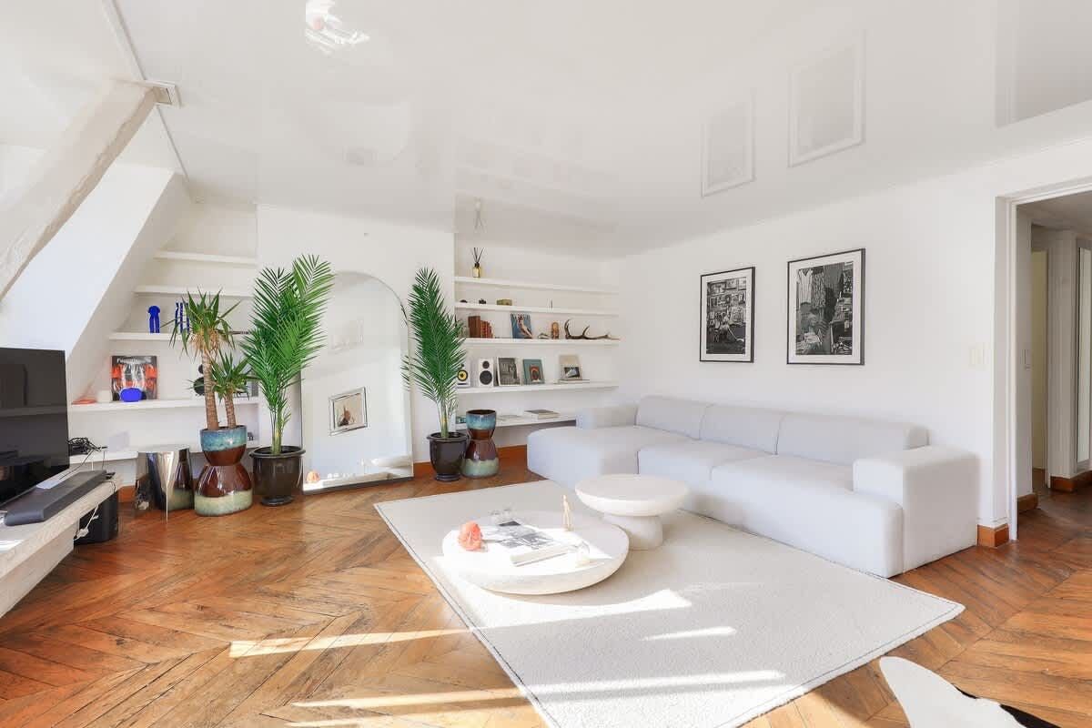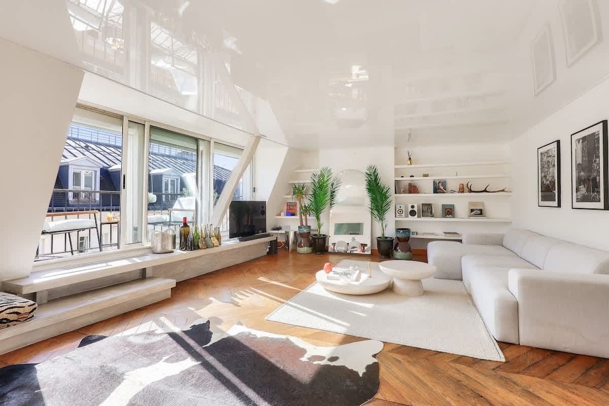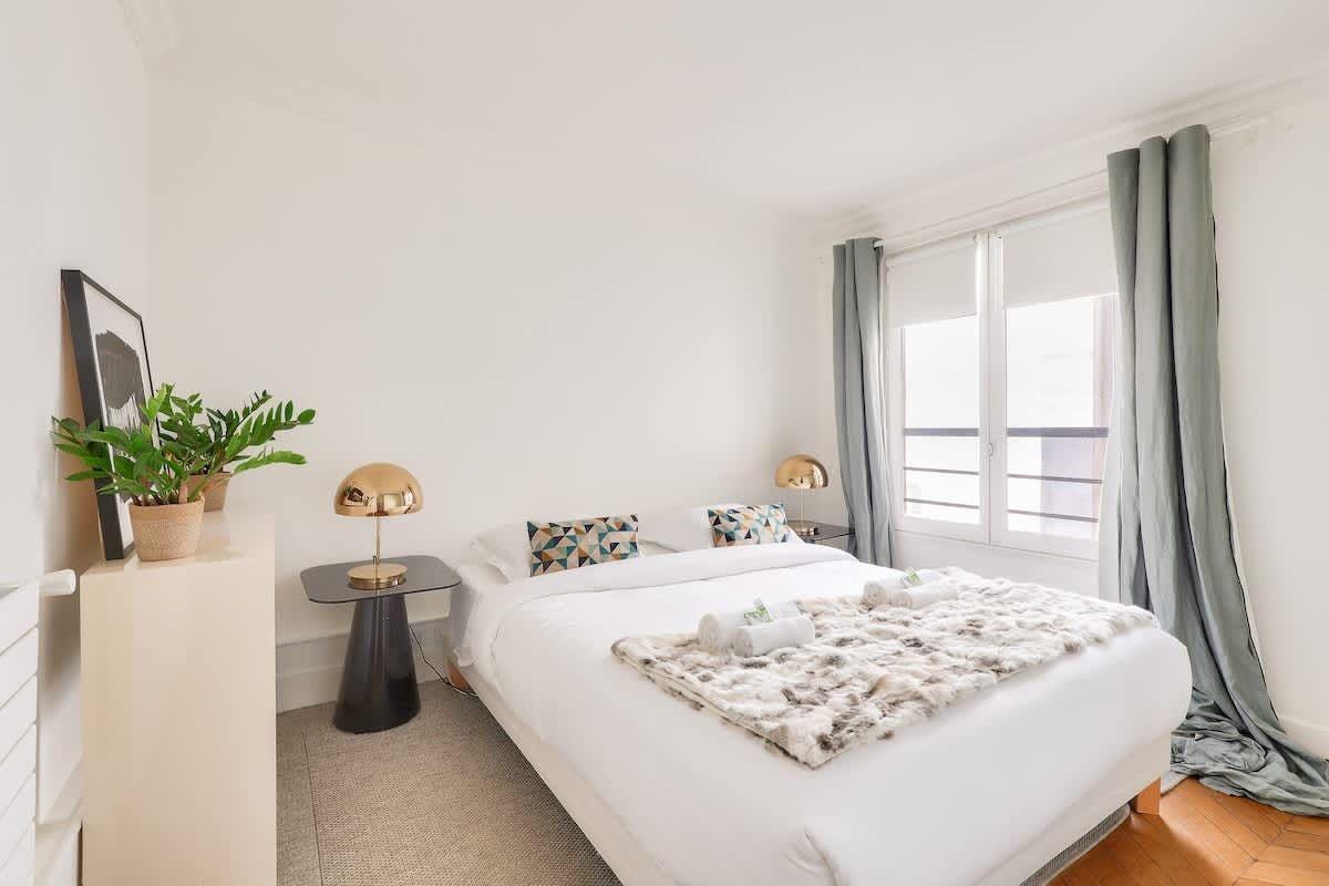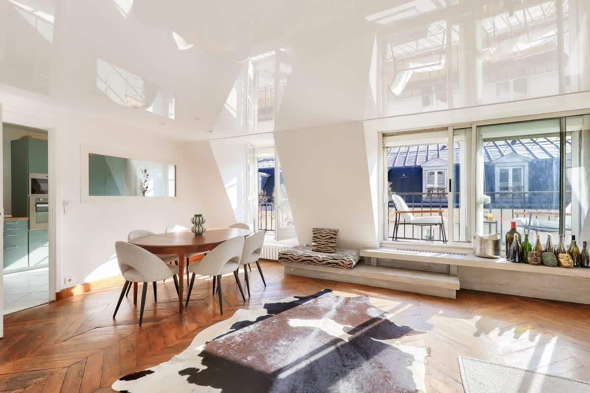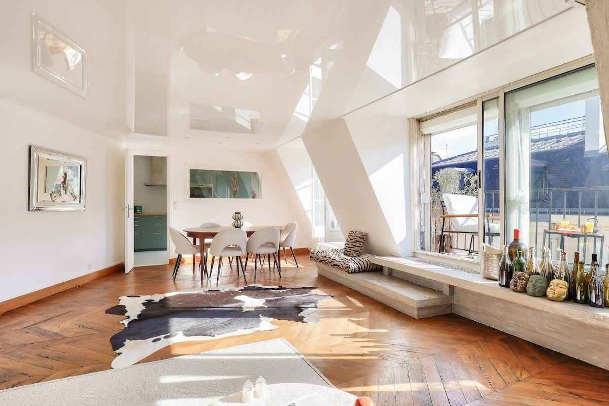 You could never tire of returning home to this oh-so-central Parisian home. The south-facing living room, which leads out onto a lengthy balcony with rooftop views, is a knockout. And you’ll be in for a good night’s sleep here. Perched on the top floor, the bedroom overlooks a peaceful internal courtyard. When you’re ready to explore, the bustle of the iconic Boulevard Haussmann is just around the corner. Or take a twenty-minute stroll over to the Louvre and the banks of the Seine. Need to be someplace fast? The Metro is just three minutes from your door.