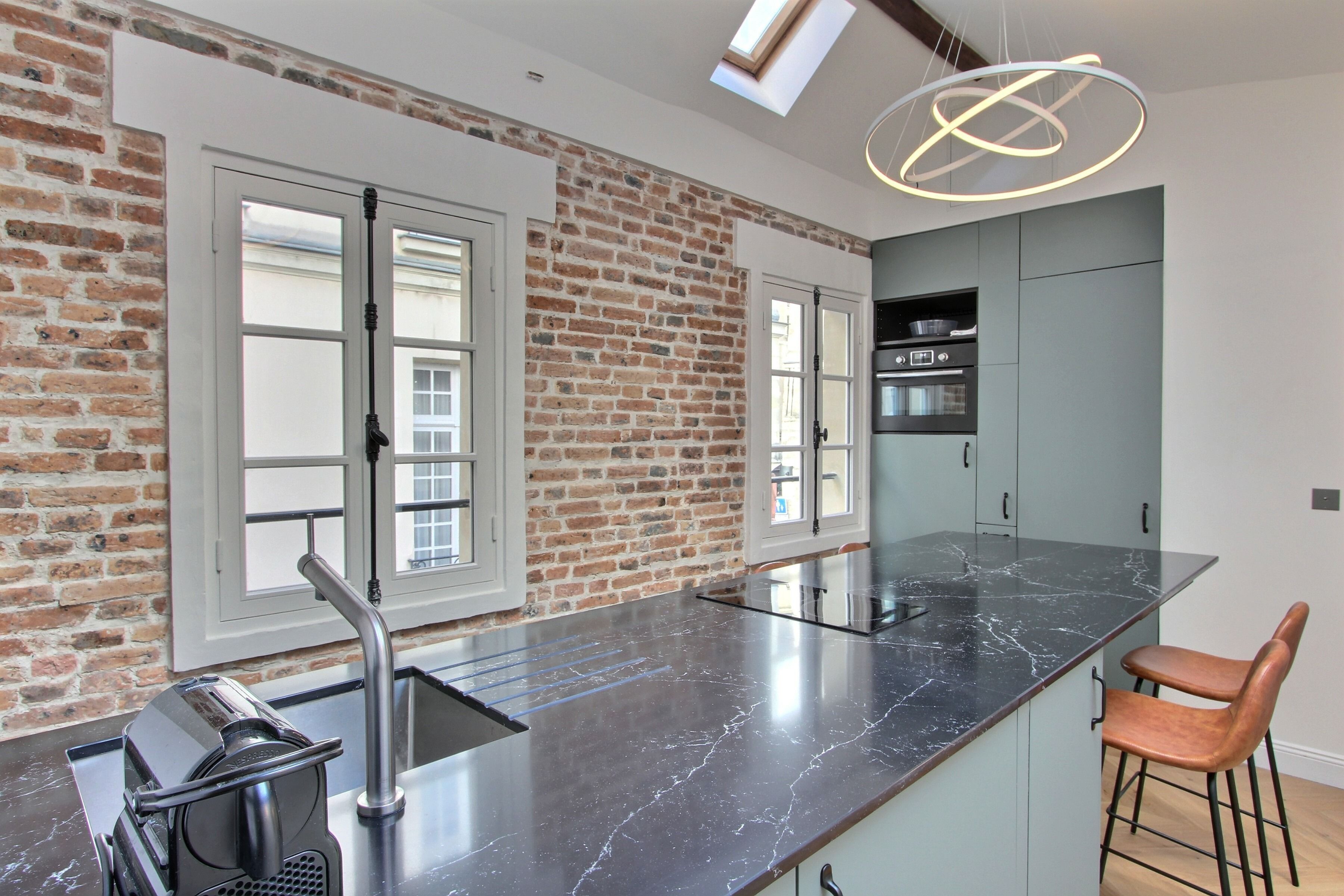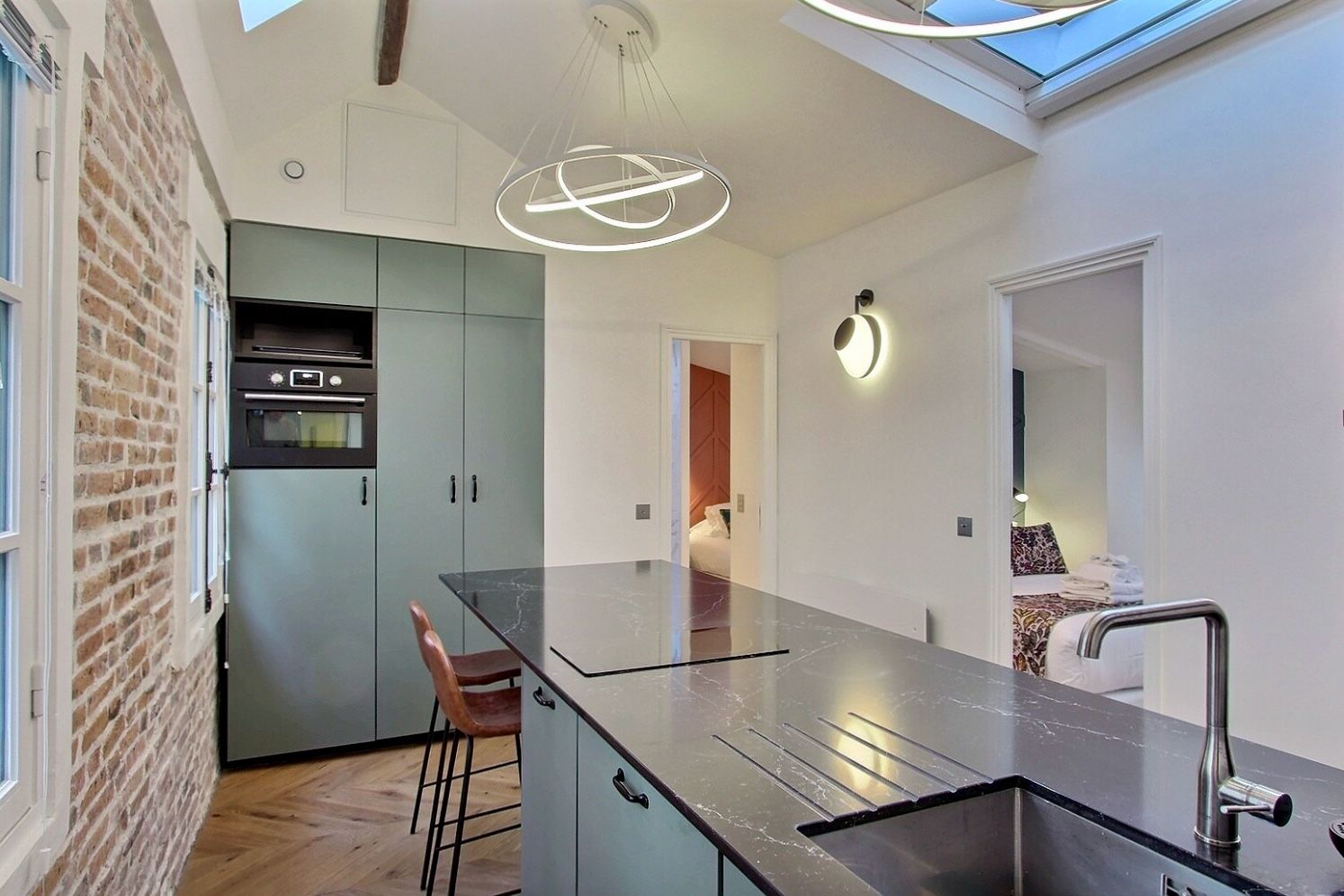 Welcome to Le Marais, where you’ll find this apartment in the 4th arrondissement. This is one of the most sought-after neighbourhoods – home to chic boutiques and cosy cafes, and close to Notre-Dame. Whether you’re in Paris for work or play, the location makes this a great option. The living room is part of the original 16th-century building, with high ceilings that make the space feel more open, and the skylights mean there’s plenty of natural light. The kitchen is handy too, especially at breakfast time. And if you prefer not to cook, in the evenings you can take your pick of the city's elegant eateries.