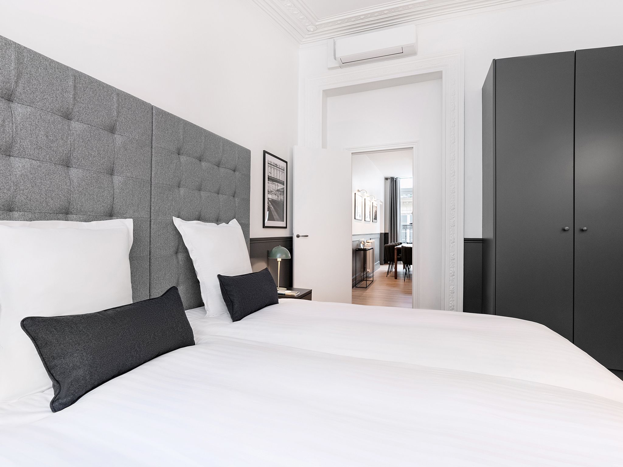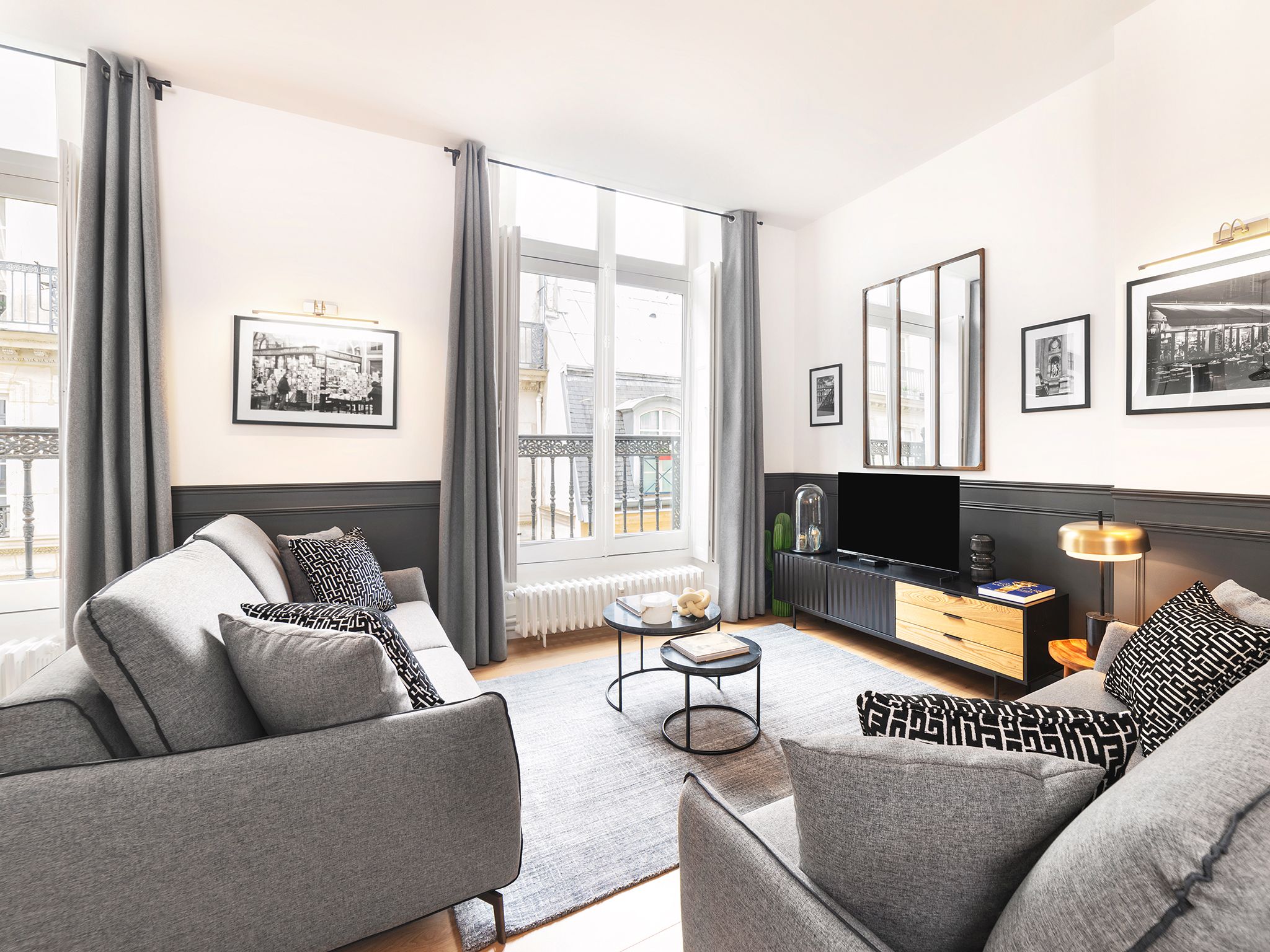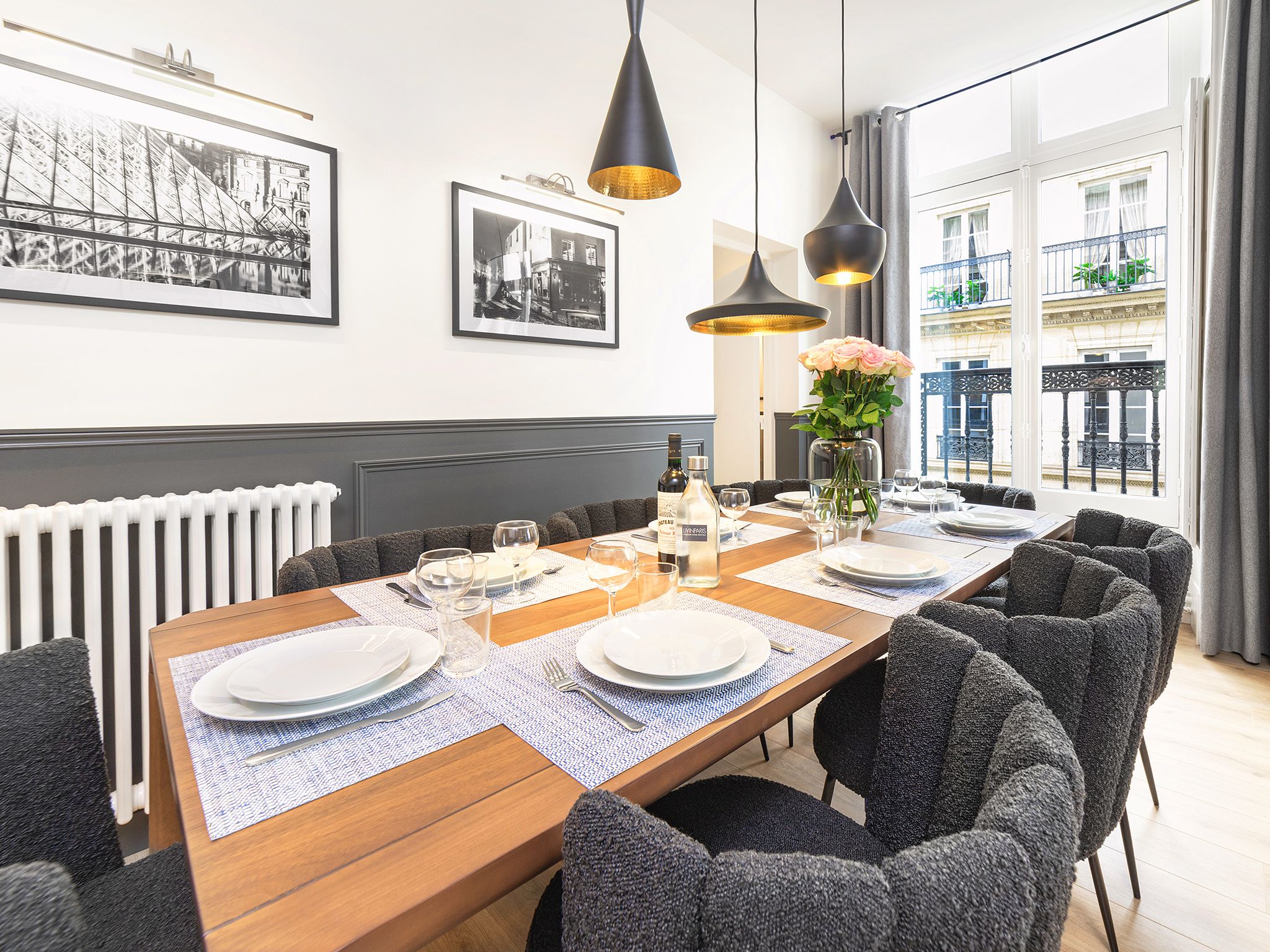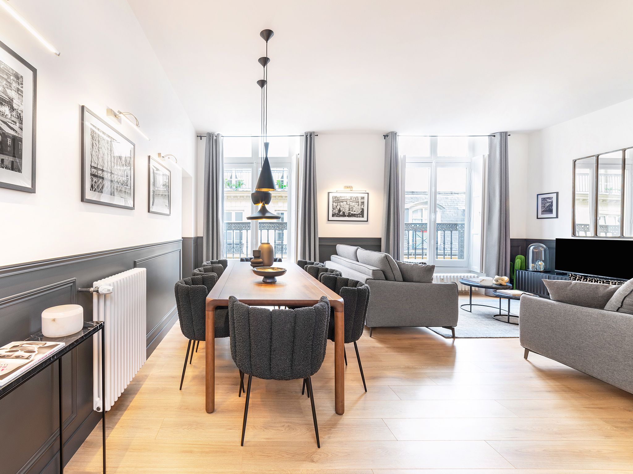 Locations rarely get better than this. You'll find this apartment in the heart of Paris, only a short stroll away from landmarks, eateries, and metro stations. A day at the Louvre, an afternoon of shopping along the Grands Boulevards, or an evening show at the Palais Garnier are all within easy reach. Back home, the open-plan layout makes socialising a breeze, whether you’re unwinding on the sofa or cooking up a storm in the kitchen. Each bedroom is as comfortable as it is chic – just note that two guests will sleep on a sofa bed in the living area.