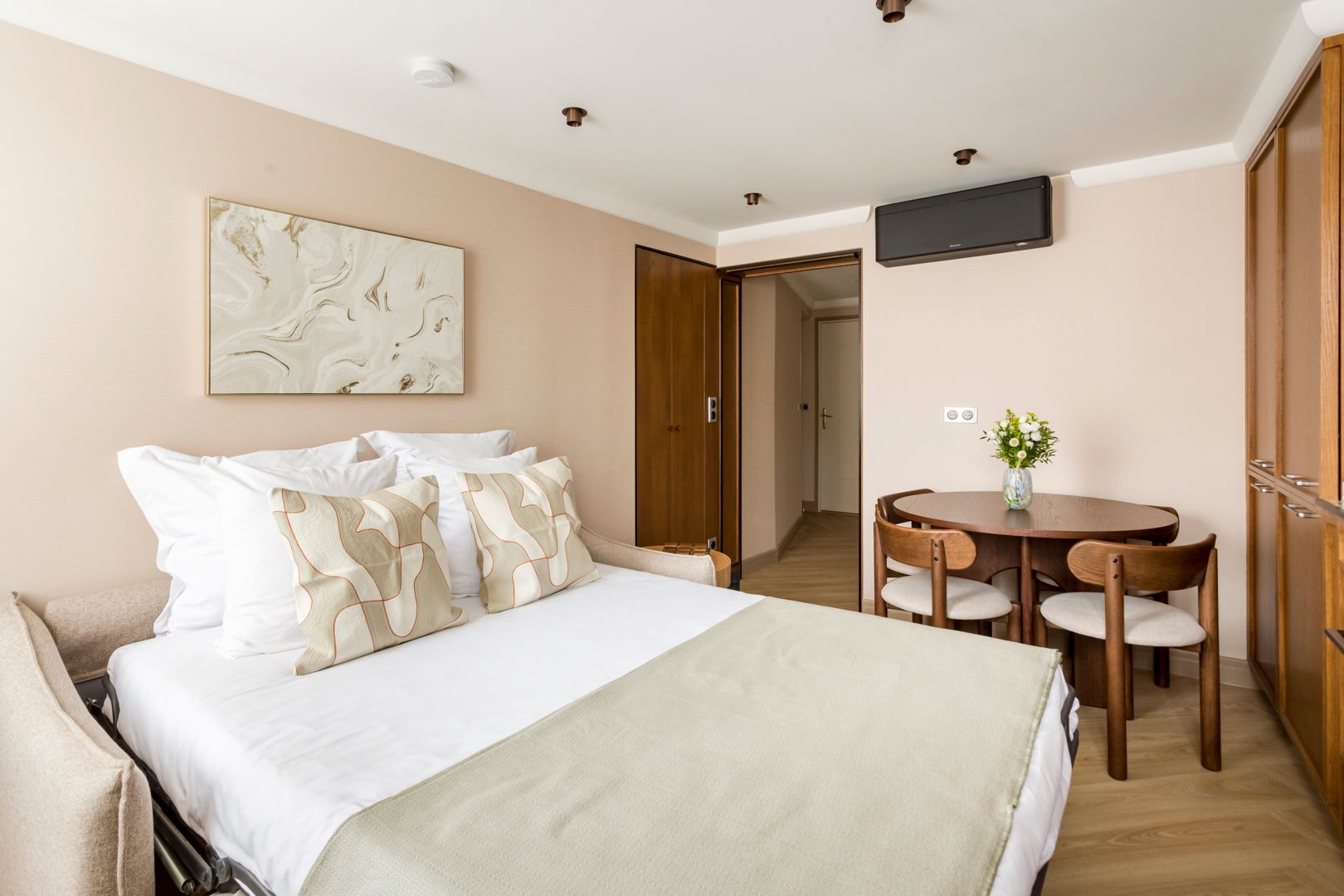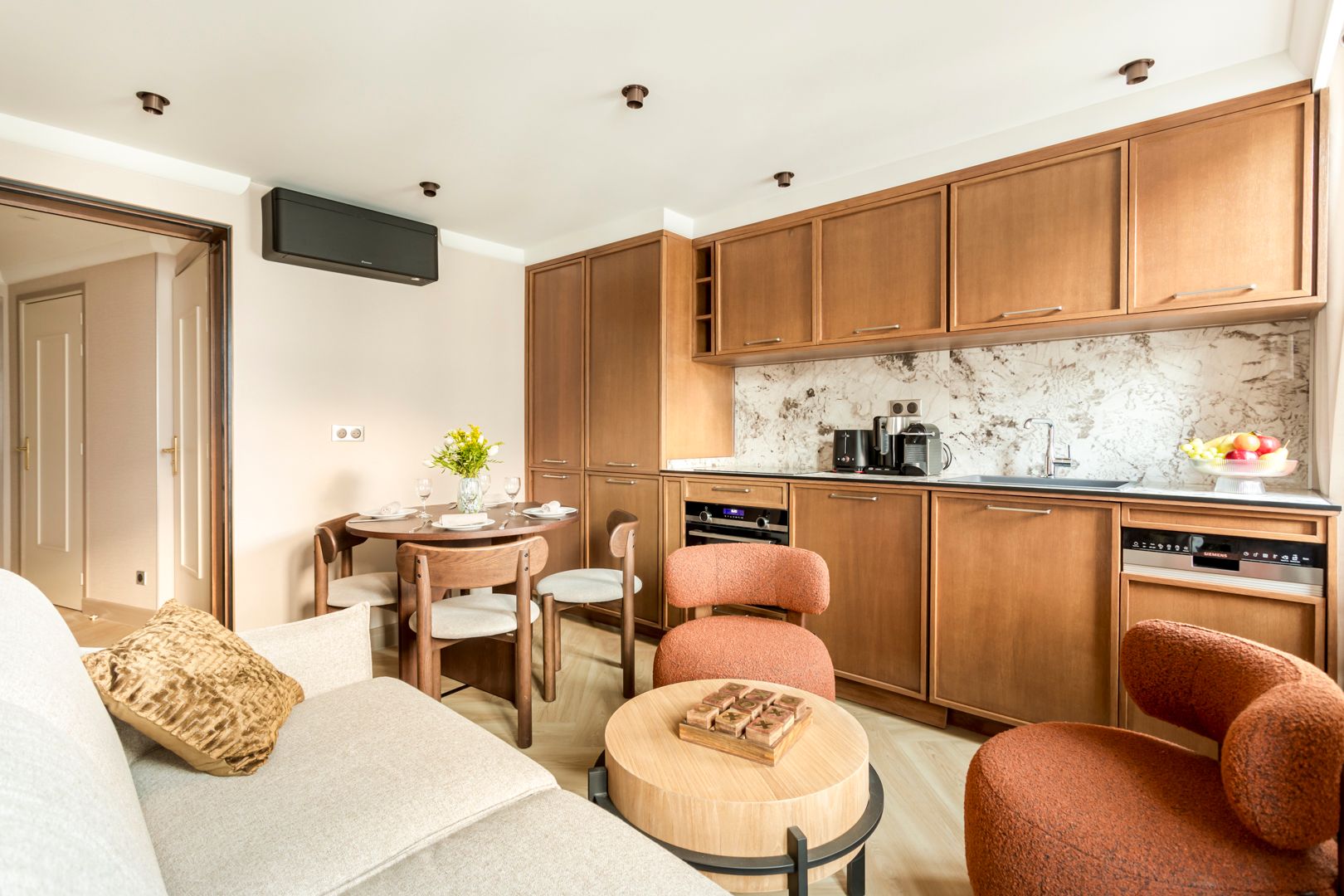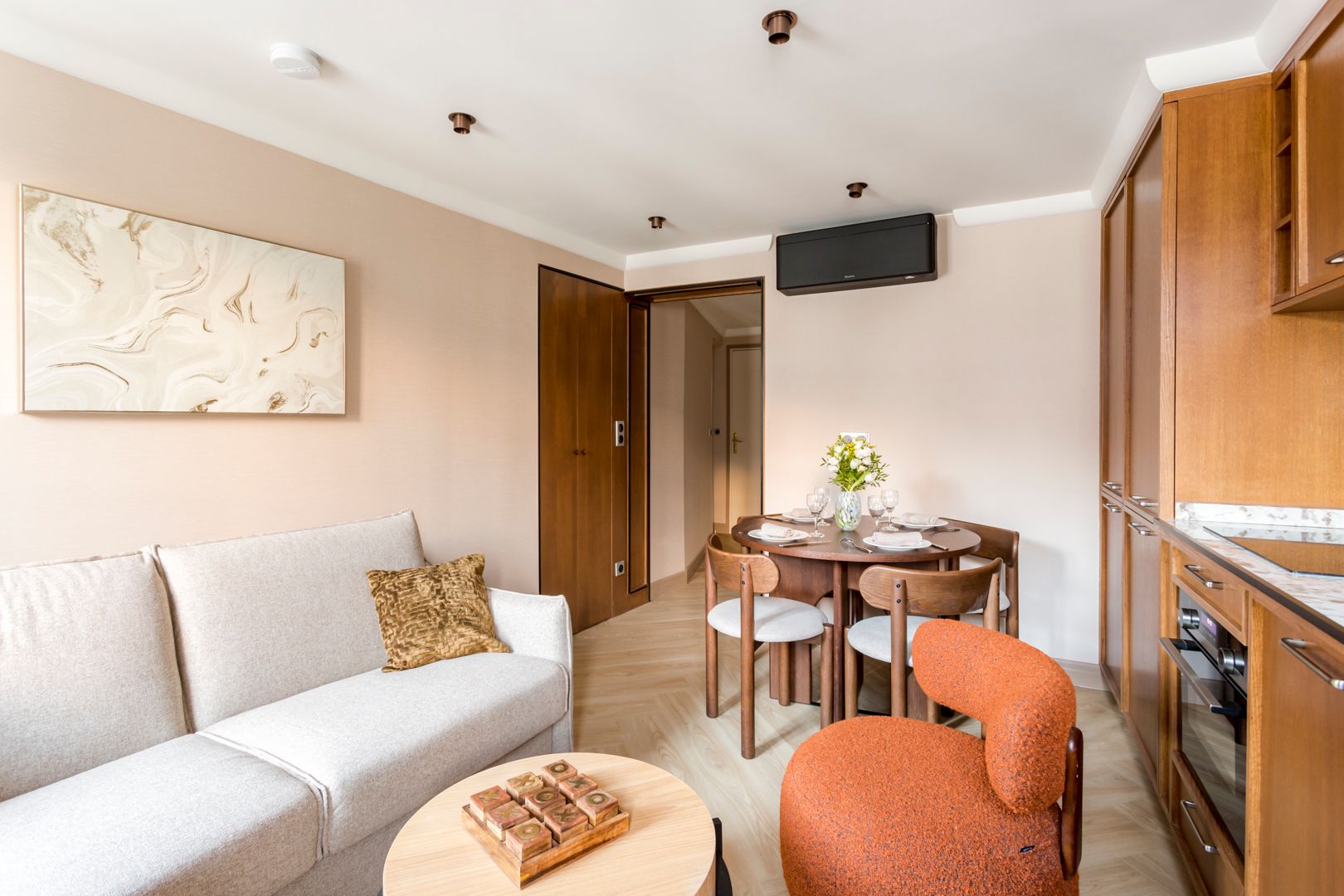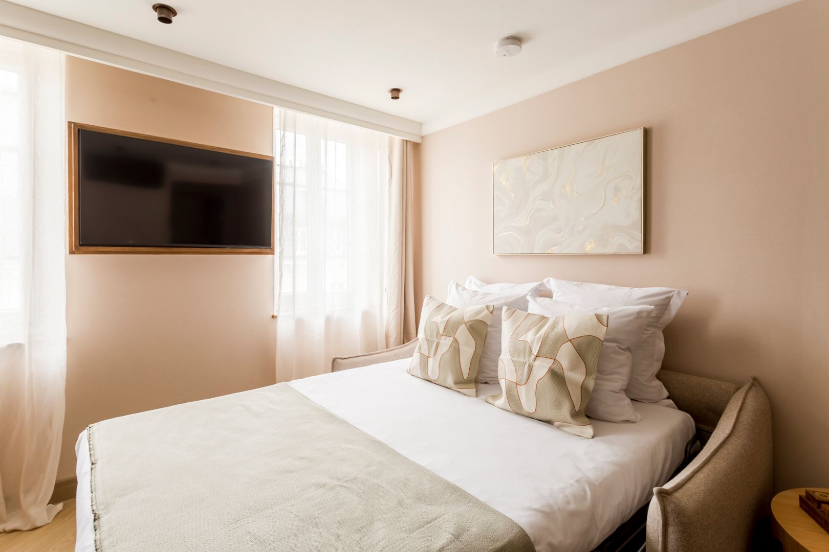 You'll find this apartment in the heart of Paris, close to the Louvre, Palais Garnier, and plenty of shops and restaurants. If you're keen to explore, you couldn't ask for a better spot for it – all you'll want to see and do is within walking distance, or an easy metro ride away. Back home, the design is stylish and sophisticated, fitting in nicely with the locale. There's a sofa bed for two – though the space will be slightly snug when it's in use – as well as a compact kitchen. It's the perfect base for a central stay.
