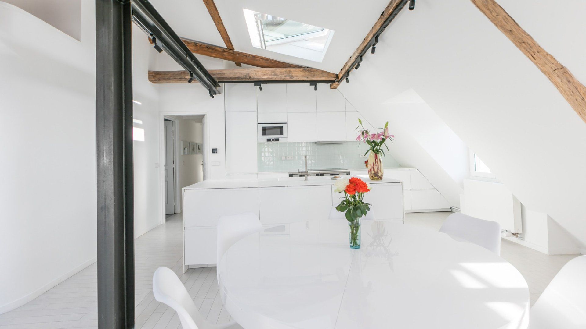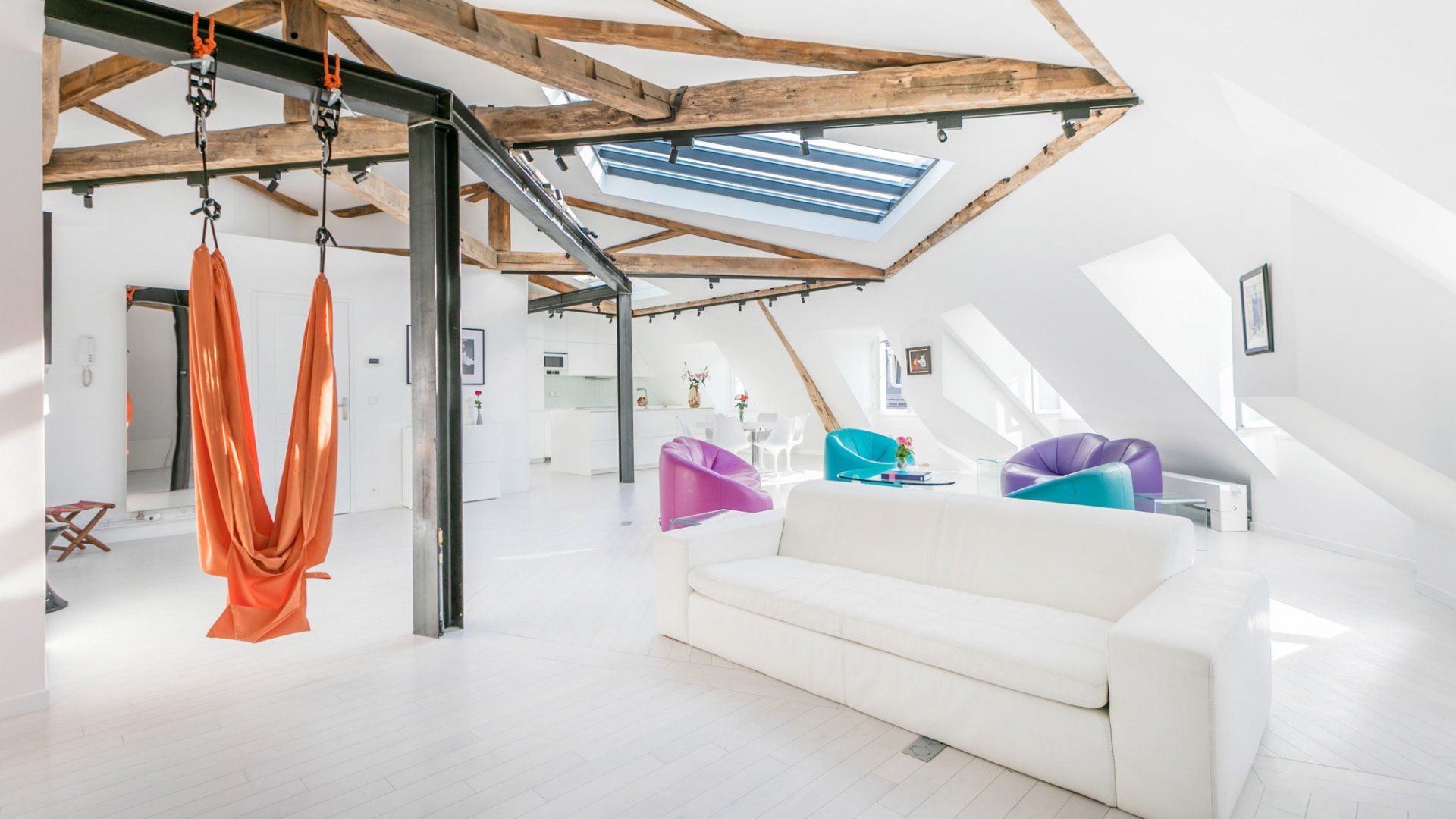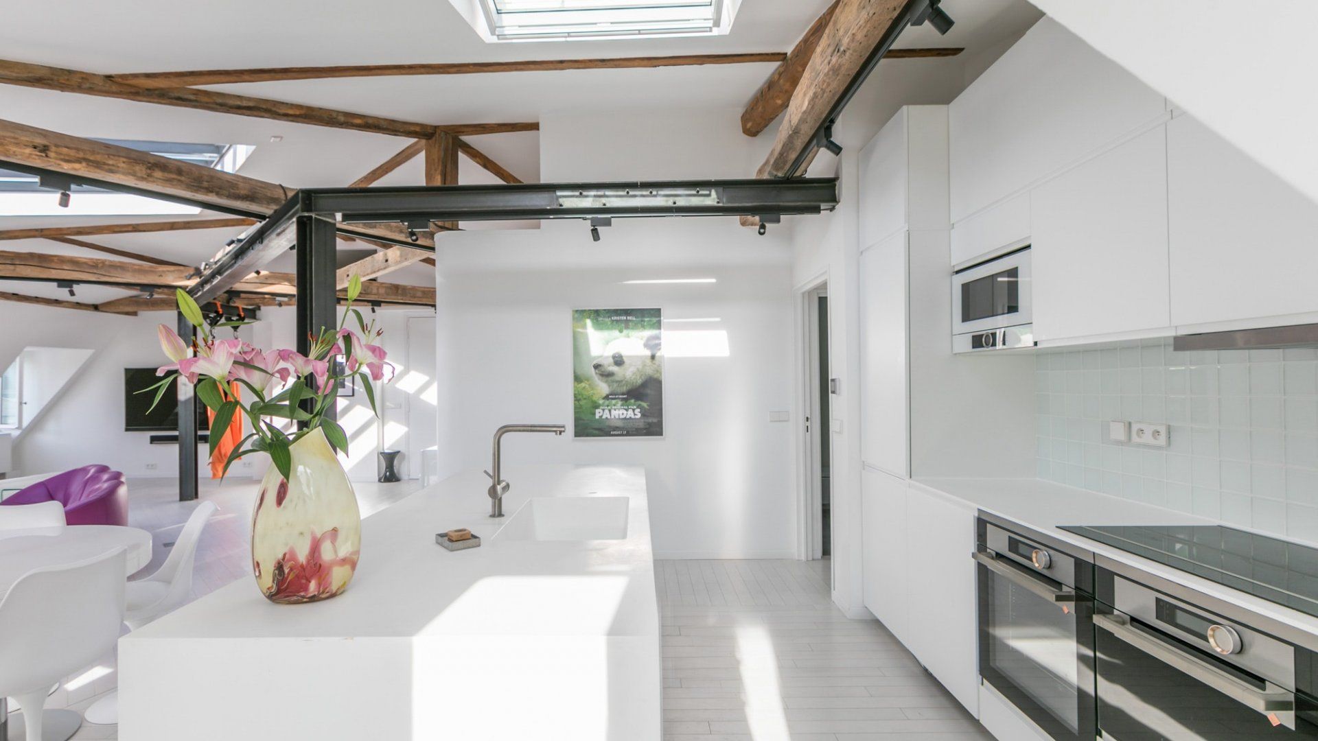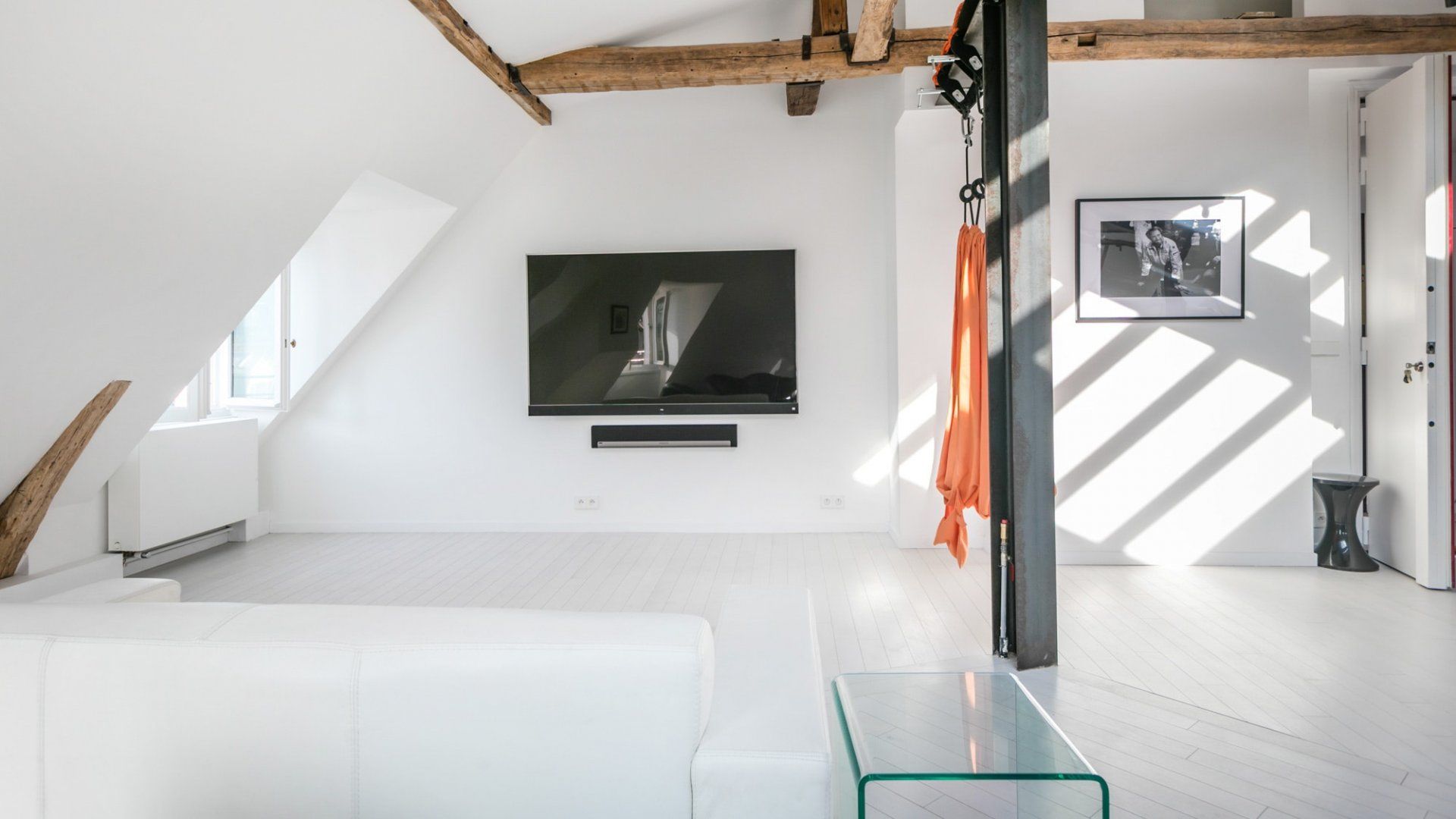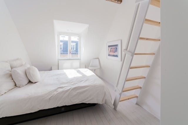 A beautiful large open space with so many skylights that sunshine floods in through to the living room and kitchen. You immediately feel refreshed and relaxed when you walk through the door. Packed full of designer furniture throughout with small touches like fresh flowers. Authentic sketches from films like "My Little Toaster" create a home full of character even when the colour palette throughout is pure white. There are three large bedrooms all set up with guest's comfort in mind and a unique loft space with a view of the Eiffel Tower that's pretty special at night.