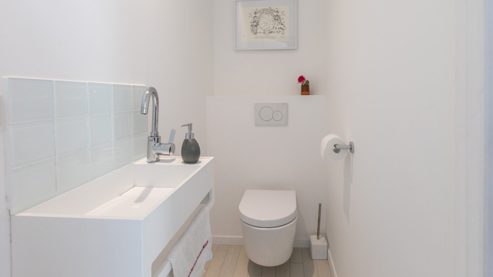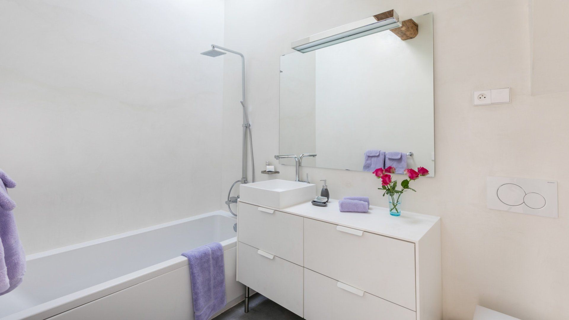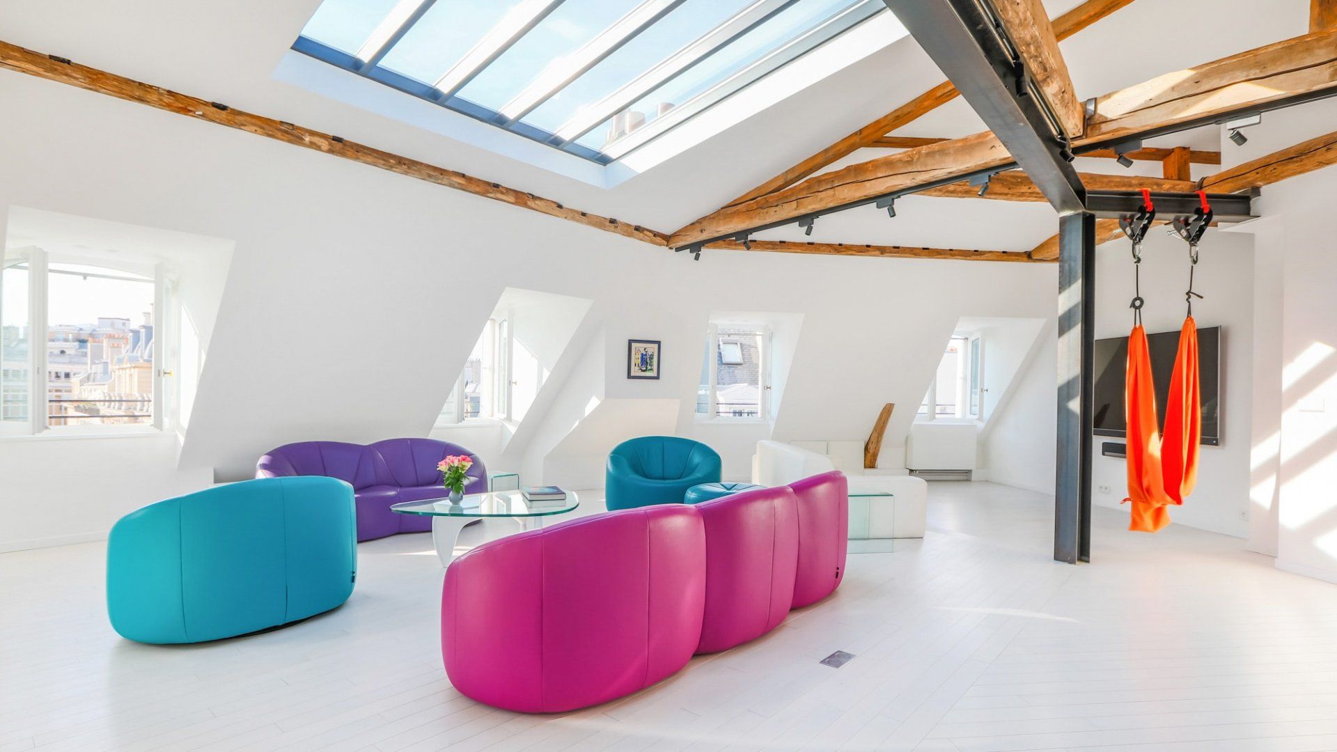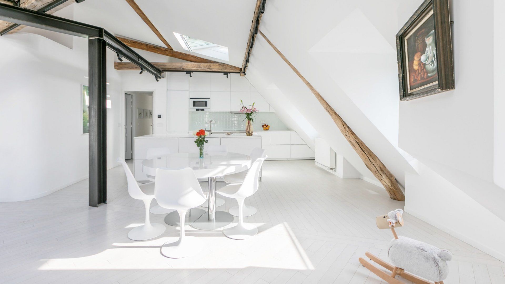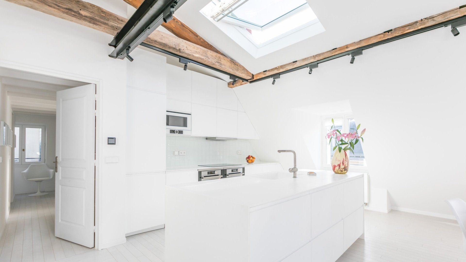 A beautiful large open space with so many skylights that sunshine floods in through to the living room and kitchen. You immediately feel refreshed and relaxed when you walk through the door. Packed full of designer furniture throughout with small touches like fresh flowers. Authentic sketches from films like "My Little Toaster" create a home full of character even when the colour palette throughout is pure white. There are three large bedrooms all set up with guest's comfort in mind and a unique loft space with a view of the Eiffel Tower that's pretty special at night.