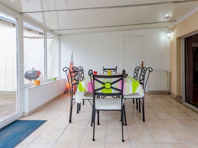 "Le Saint Vigor", 4-room house 150 m2. Practical furnishings: living/dining room with dining table, satellite TV, radio and wood-burning stove. Living/dining room with winter garden with dining table and satellite TV. Exit to the terrace. 2 rooms, each room with 1 french bed. 1 room with 2 beds.