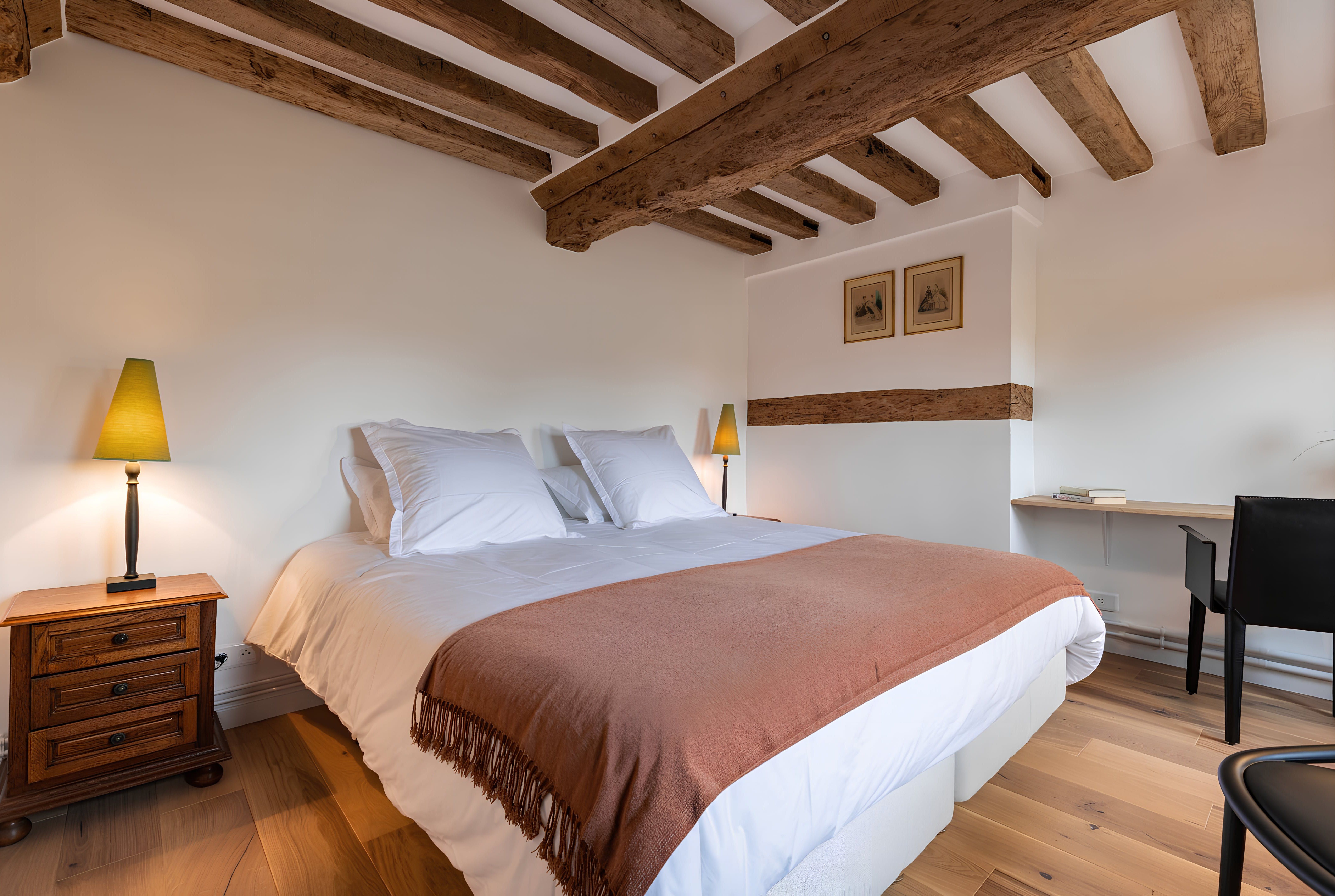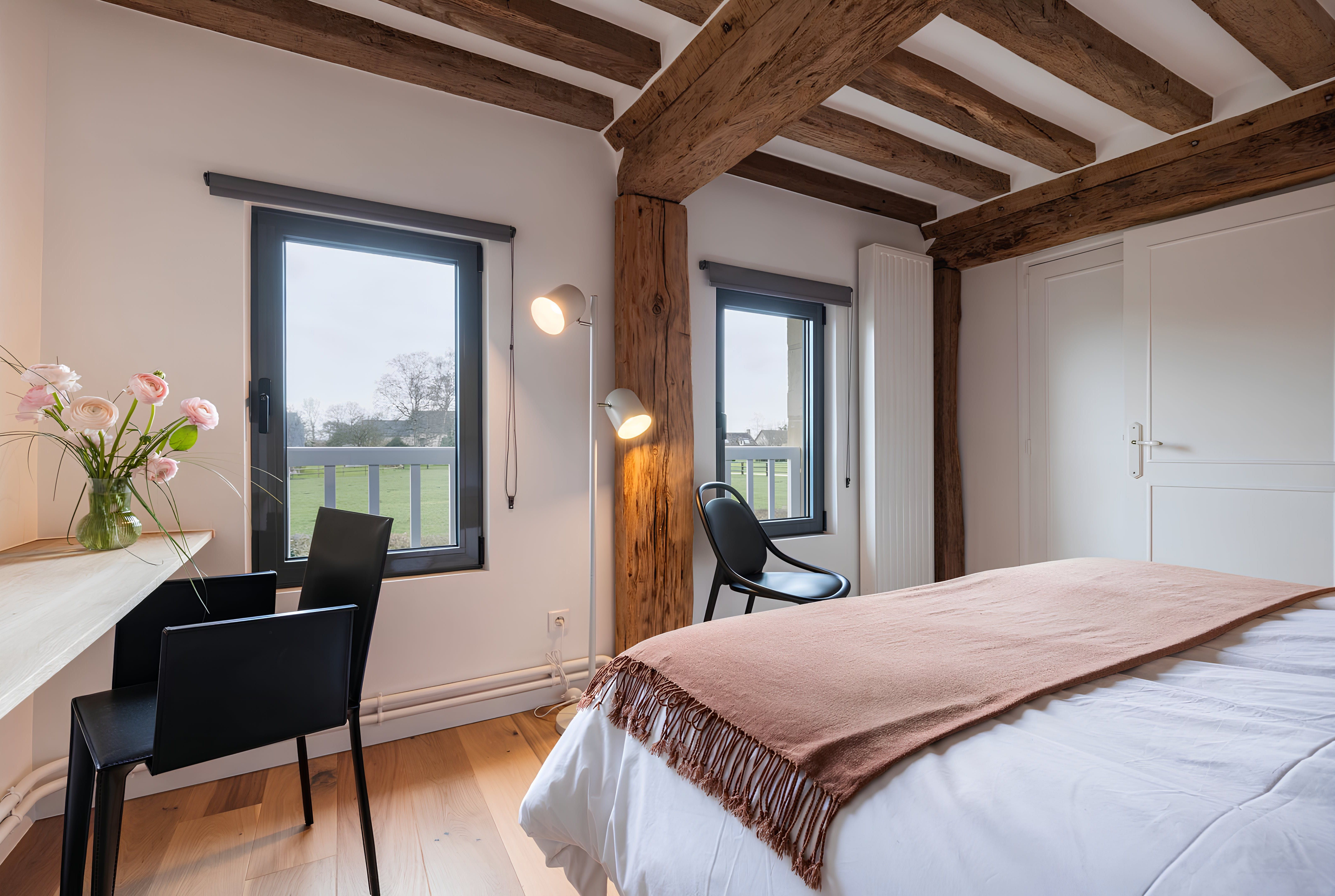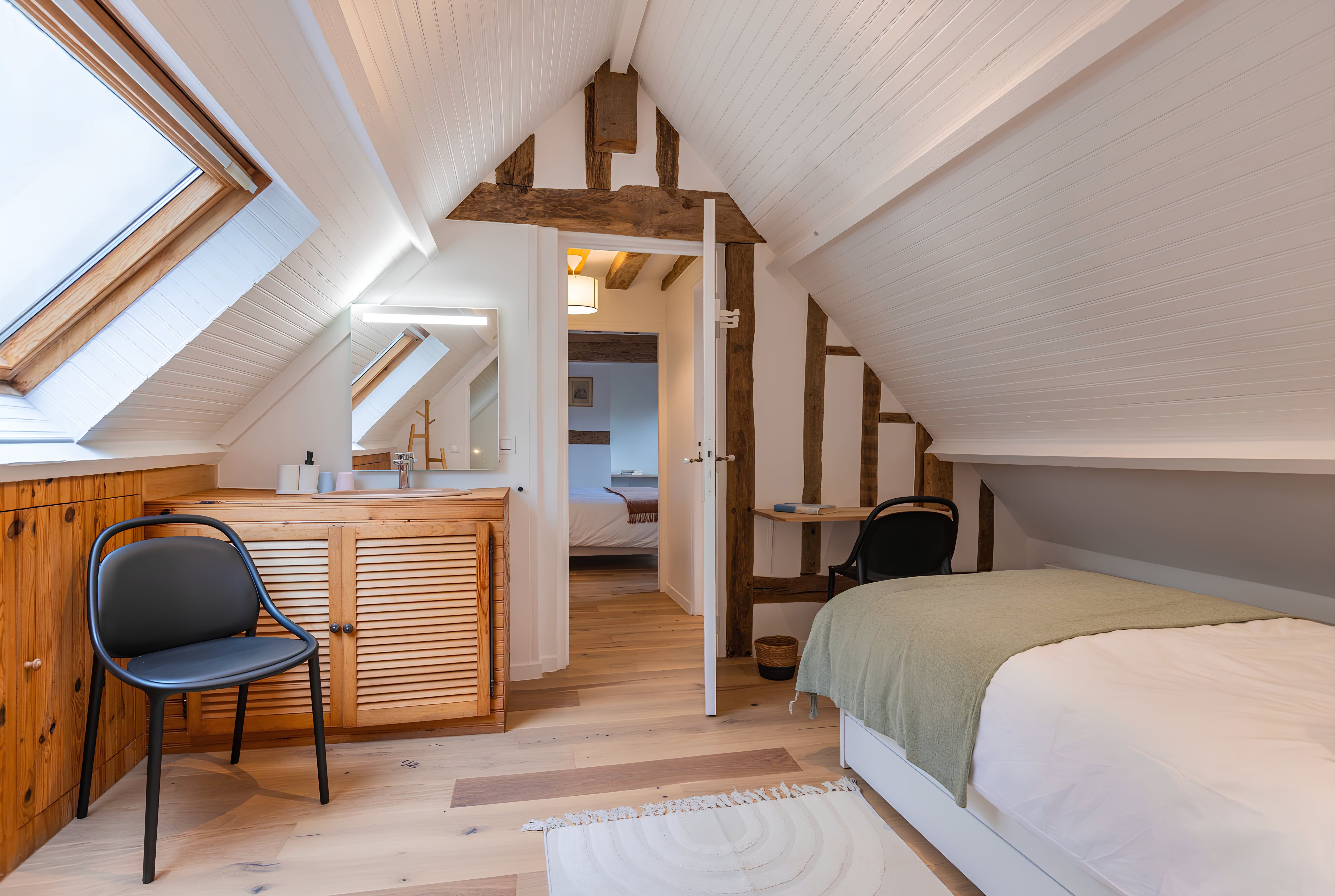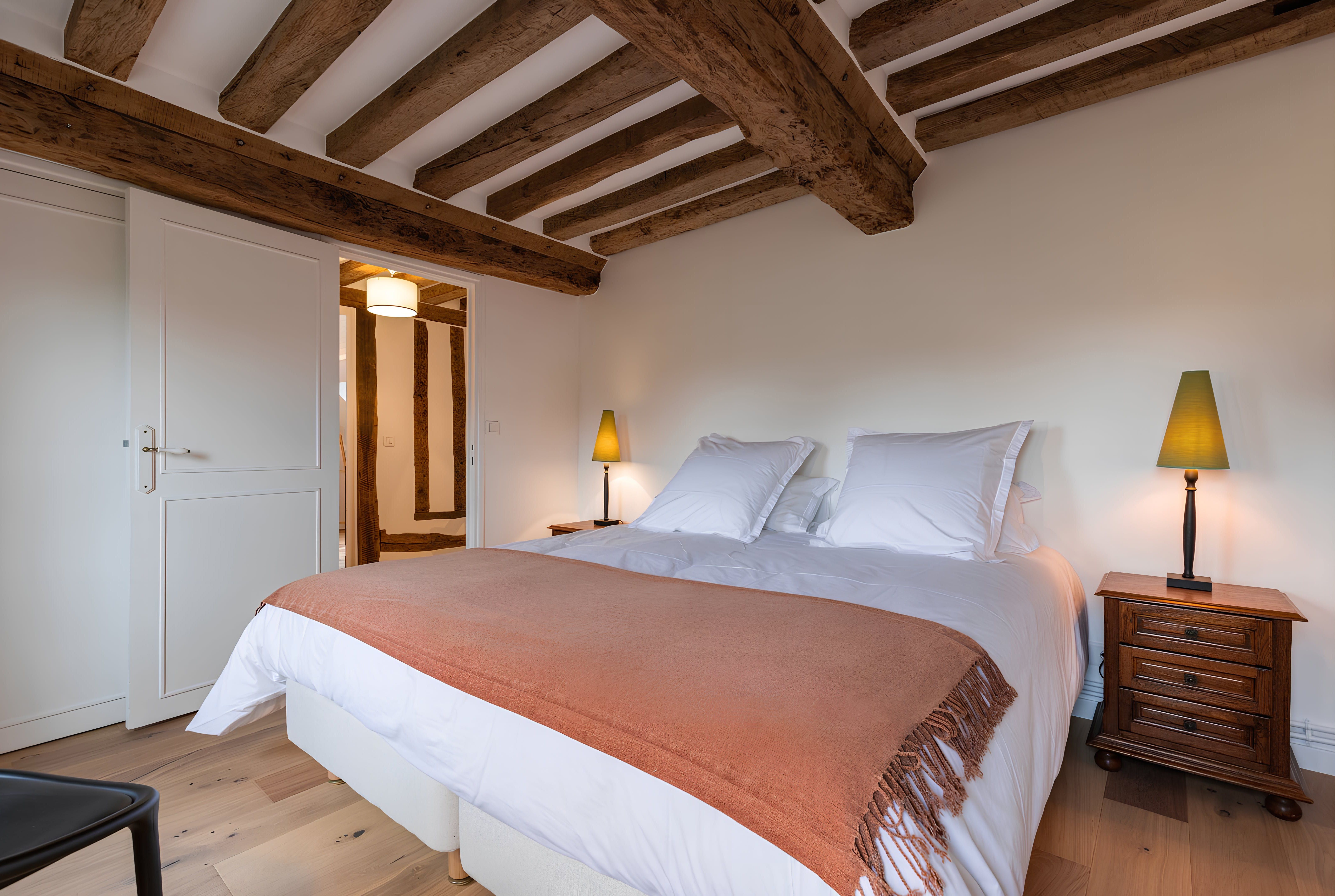 Nestled in the countryside of Normandy, this characterful home is a rural retreat with fireside armchairs, exposed wood beams, and a winding staircase. As well as the outdoor dining table, you'll have access to a shared swimming pool in the summer months. However, the sloped ceilings and connected bedrooms in the attic may be a better fit for kids than couples. Make sure you hire a car and plan a drive to Caen, thirty minutes away. Feel like a beach day instead? Take a road trip to the Plage de Cabourg, just twenty minutes by car.