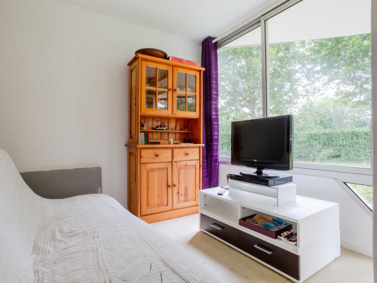 2-room apartment 43 m2, on the ground floor, south-west facing position. Living/dining room with TV (flat screen), DVD and electric heating. Exit to the terrace. 1 room with 1 pull-out bed (2 x 90 cm, length 190 cm). Sleeping alcove 6 m2 with 1 french bed (160 cm, length 200 cm). Open kitchen (3 hot plates, oven, kettle, microwave, freezer, electric coffee machine).