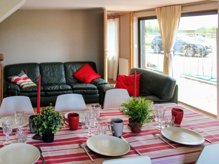 "L´Etang", 4-room house 80 m2 on 2 levels. Tasteful furnishings: living/dining room with sloping ceilings, ceiling height 207 cm with dining table and TV. Exit to the terrace. 1 room, ceiling height 207 cm with 1 french bed (160 cm), hand-basin, separate WC and shower. Kitchenette (oven, dishwasher, 4 gas rings, toaster, kettle, freezer, electric coffee machine).