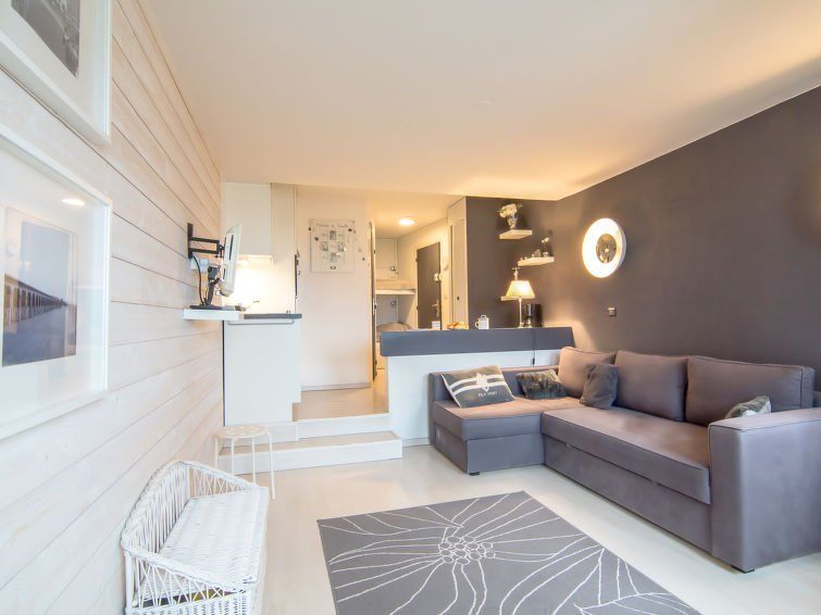 Panoramic view of bay, quay and city Trouville-sur-Mer from light(ful) studio/apartment in Deauville harbour. Mirror wall provides extra perspective, next to tilt window and balcony. Excellent layout and furnishing of house, nice wall lamps, full kitchen, gbath in bathroom. Good night's sleep. 2-person sofa bed + bunk bed 2 pers. Water sports centre 'downstairs' in marina. Quiet and centrally located, ideal as a home base to explore area. Welcome package Interhome with necessitiesTOP!