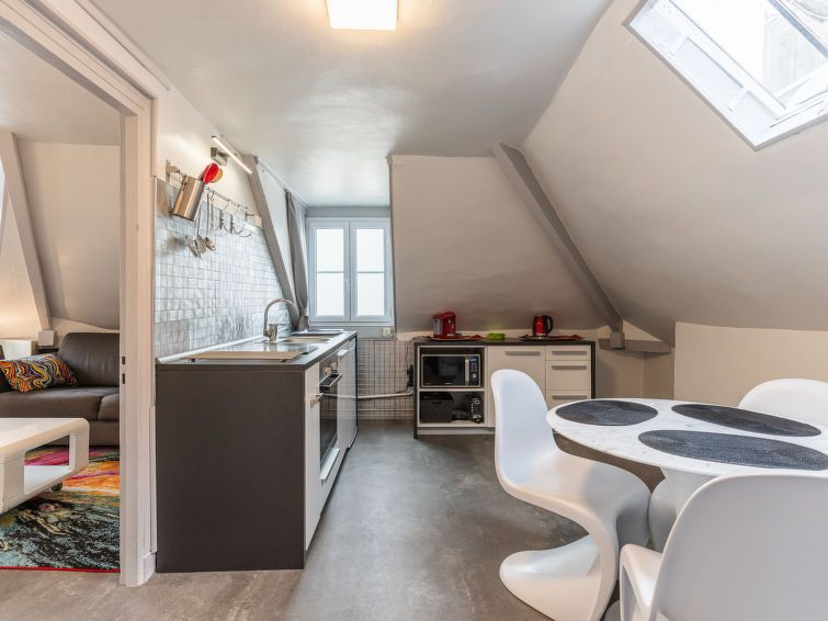 1-room penthouse 19 m2 on 3rd floor. Object suitable for 2 adults. Small living/sleeping room with 1 bed (140 cm, length 190 cm), TV (flat screen). Kitchenette (oven, 2 induction hot plates, toaster, kettle, microwave, electric coffee machine). Shower/WC. Electric heating. Beautiful view of the town.