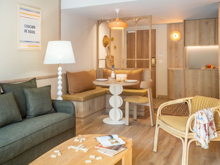 "La Résidence", 2-room apartment 41 to 55 m2. Modern furnishings: living/sleeping room with 1 double sofabed (160 cm, length 200 cm), dining table, satellite TV and air conditioning. Exit to the balcony. 1 room with 1 french bed (160 cm, length 200 cm), air conditioning. Open kitchen (dishwasher, 2 ceramic glass hob hotplates, kettle, microwave, electric coffee machine, Capsules for coffee machine (Nespresso) extra).