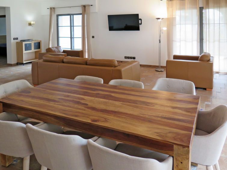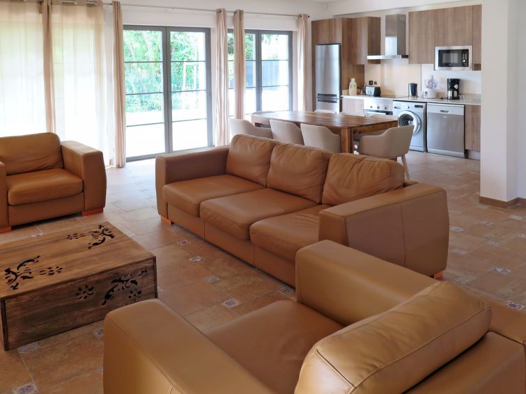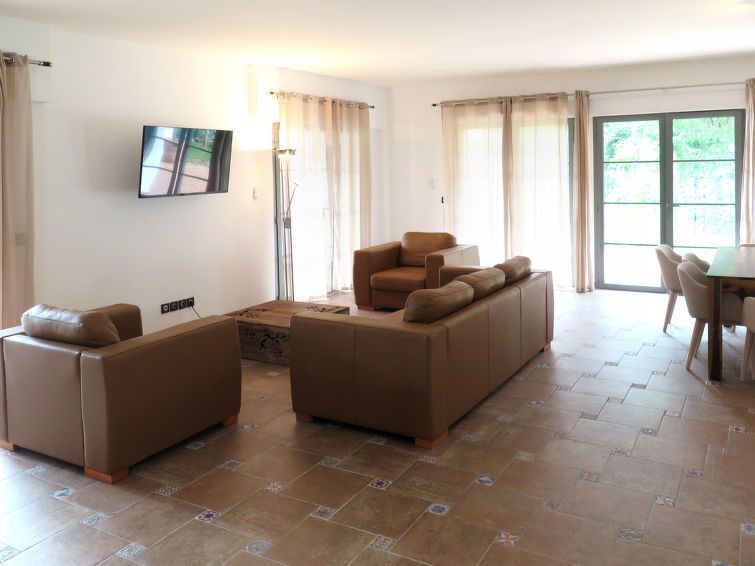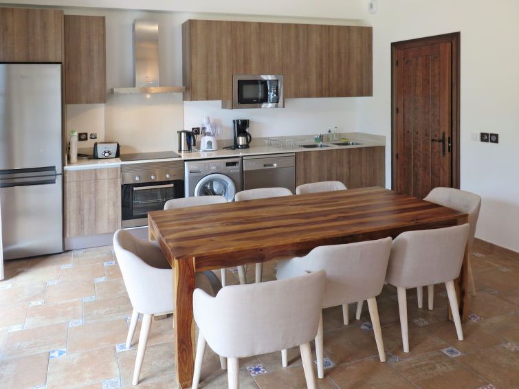 "Villas Odalys Collection Orée de Milady", 5-room semi-detached house 140 to 160 m2 on 2 levels. Beautiful and tasteful furnishings: living/dining room with dining table and TV. Exit to the terrace. 1 room with 1 french bed. Open kitchen (oven, dishwasher, 4 ceramic glass hob hotplates, toaster, kettle, microwave, freezer, electric coffee machine).