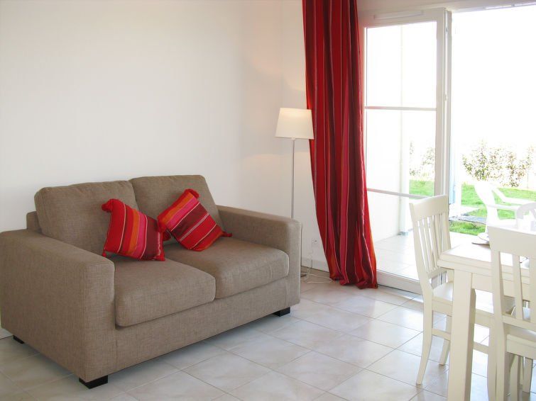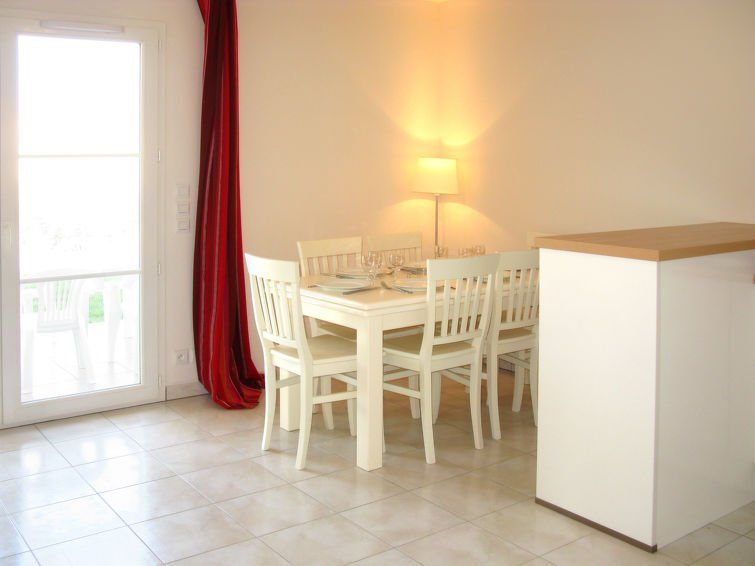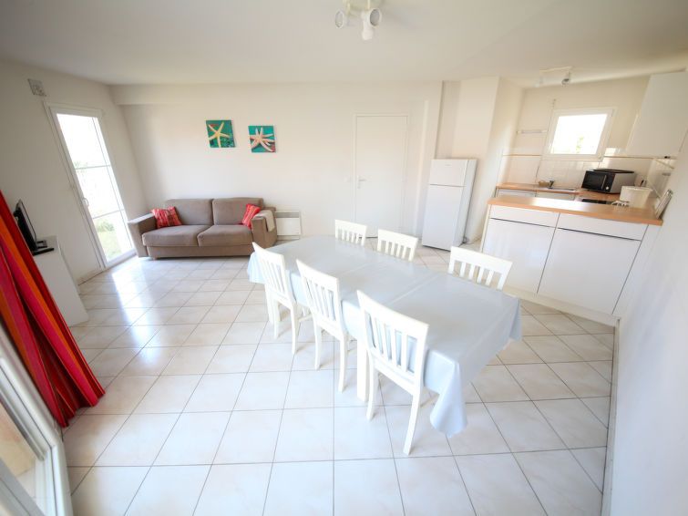 "Résidence Indigo II", 4-room semi-detached house 75 m2 on 2 levels. Bright, practical and cosy furnishings: living/dining room with dining table and TV (flat screen). Exit to the terrace. 1 small room with 1 pull-out bed (2 x 80 cm, length 190 cm). Kitchenette (dishwasher, 4 ceramic glass hob hotplates, toaster, kettle, microwave, freezer, electric coffee machine).