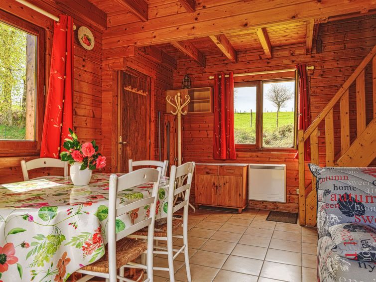 Cosy, small log cabin house. Very large garden. Swimming pond very close. All kinds of comfort available. Quite noisy. Dogs welcome.