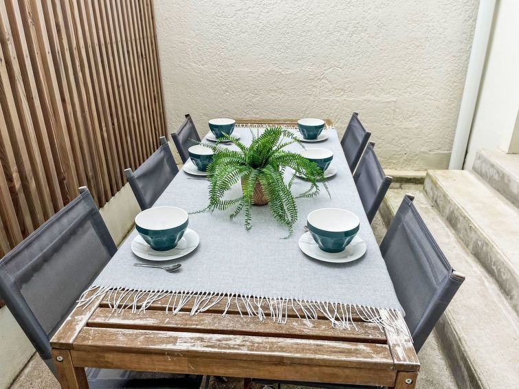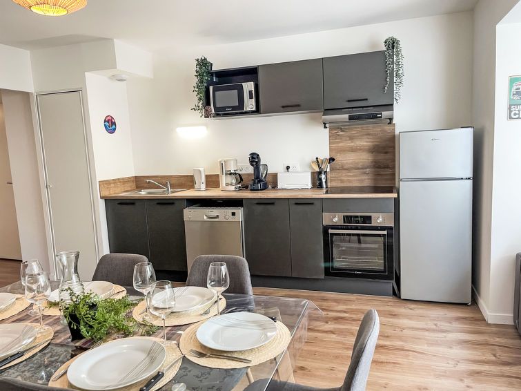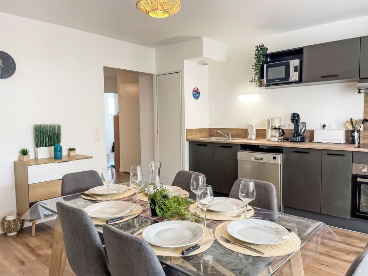 3-room apartment 65 m2, on the ground floor. Modern and cosy furnishings: living/dining room with TV (flat screen). Exit to the terrace. 2 rooms, each room with 1 french bed (140 cm, length 190 cm). Open kitchen (oven, dishwasher, 4 ceramic glass hob hotplates, toaster, kettle, microwave, freezer, electric coffee machine).