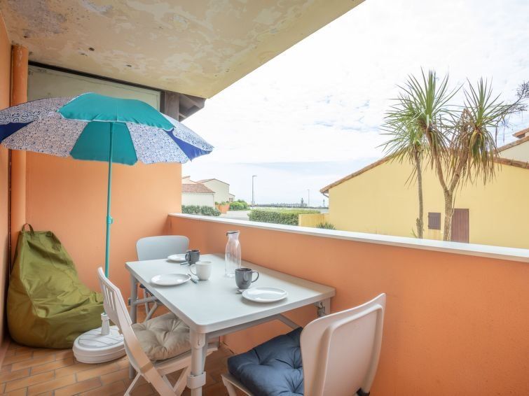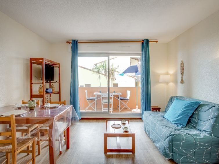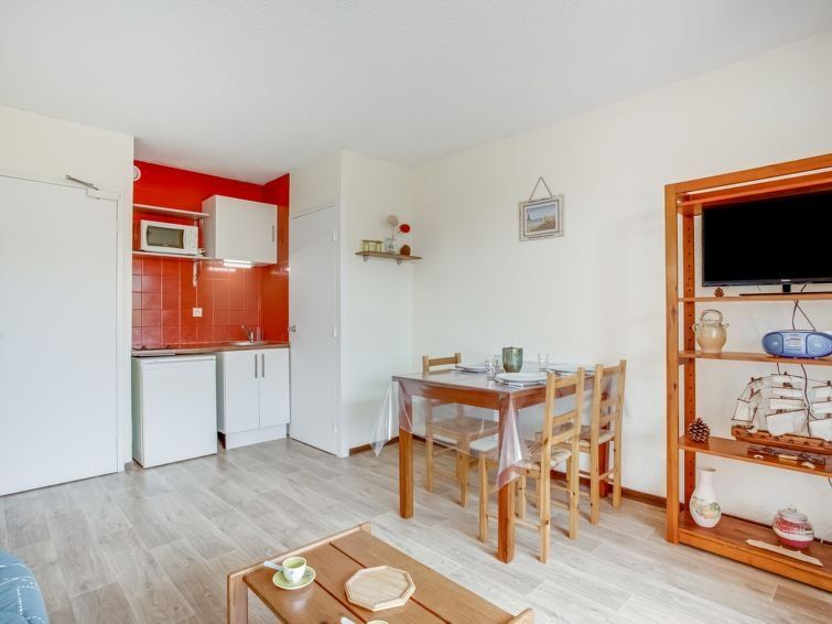 1-room studio 27 m2, on the upper ground floor. Practical furnishings: living/dining room with 1 sofabed (130 cm, length 190 cm), TV (flat screen). Exit to the terrace. Entrance hall with 1 x 2 bunk beds (70 cm, length 180 cm). Kitchenette (2 ceramic glass hob hotplates, microwave, electric coffee machine).