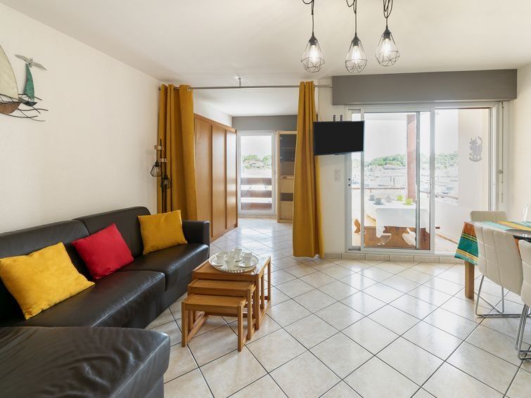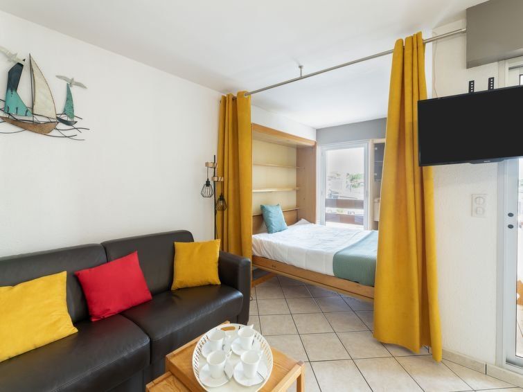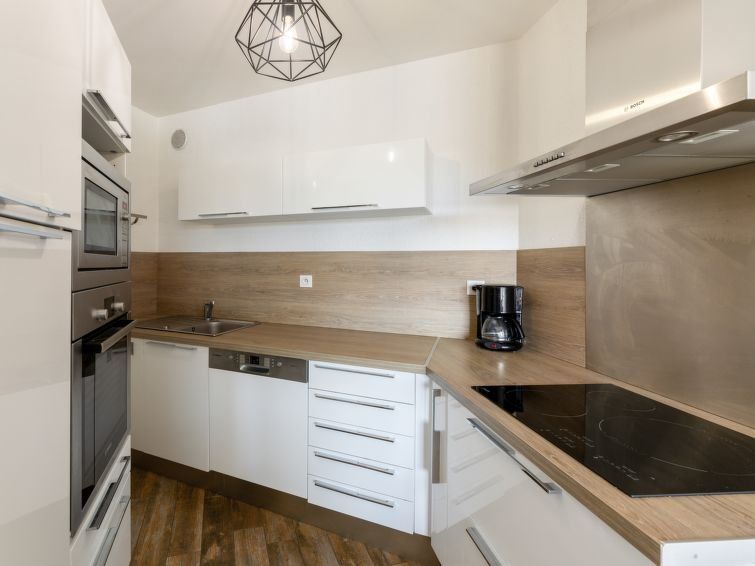 2-room apartment 56 m2 on 1st floor. Comfortable and beautiful furnishings: living/dining room 20 m2 with 1 double wall-trunk bed (2 x 80 cm, length 190 cm). Exit to the terrace. 1 room 10 m2 with 1 french bed (160 cm, length 190 cm). Open kitchen (oven, dishwasher, 3 induction hot plates, microwave, freezer, electric coffee machine).