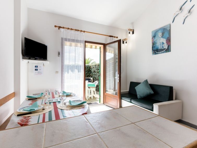 2-room terraced house 32 m2 on 2 levels. Living room with TV. Exit to the terrace. 1 room with 1 french bed (140 cm, length 190 cm). Kitchenette (2 hot plates, mini-oven, dishwasher, microwave). Bathroom, sep. WC. Electric heating. Upper floor: gallery with 1 x 2 bunk beds. Facilities: Internet (WiFi, extra).