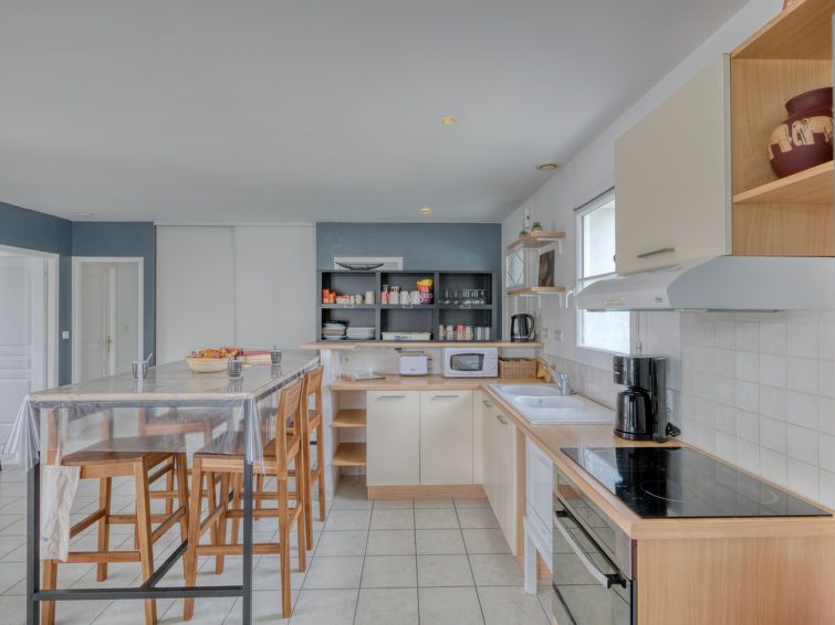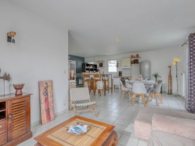 4-room house 80 m2. Living/dining room with TV (flat screen). Exit to the garden, to the terrace. 2 rooms, each room with 1 french bed (1 x 140 cm, length 190 cm). 1 room with 2 beds (90 cm, length 190 cm). Open kitchen (oven, dishwasher, 4 ceramic glass hob hotplates, toaster, microwave, freezer, electric coffee machine).