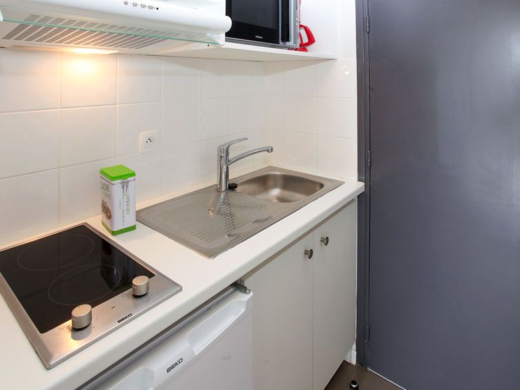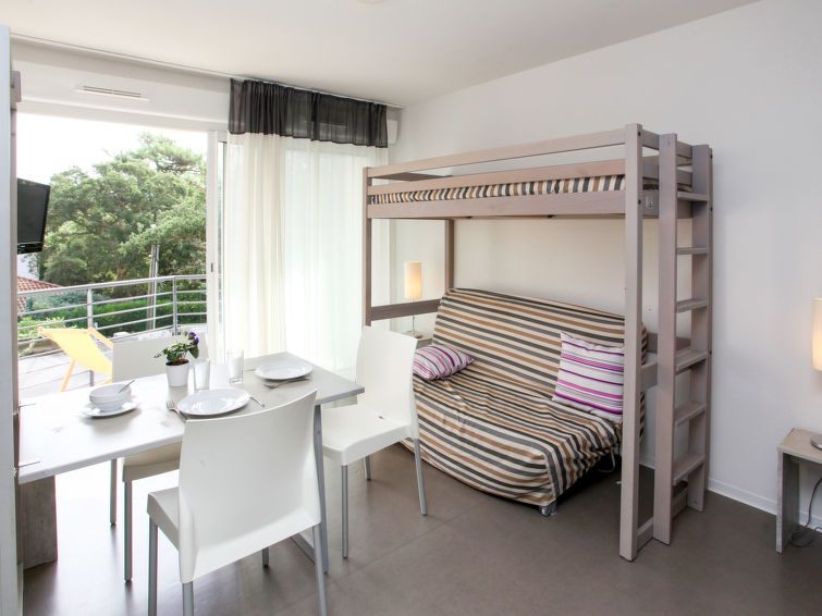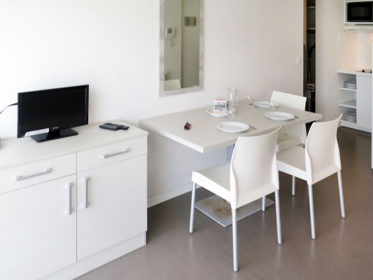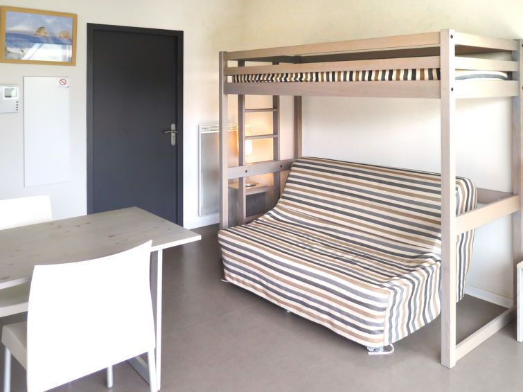 "Résidence Plage Centrale T2", 2-room apartment 34 m2. Object suitable for 2 adults + 1 child. Bright, practical furnishings: living/sleeping room with 1 double sofabed and 1 x 1 bunk beds (80 cm), dining table and TV. Exit to the balcony. 1 room with 1 french bed (160 cm). Open kitchen (2 ceramic glass hob hotplates, toaster, kettle, freezer, electric coffee machine, combination microwave).
