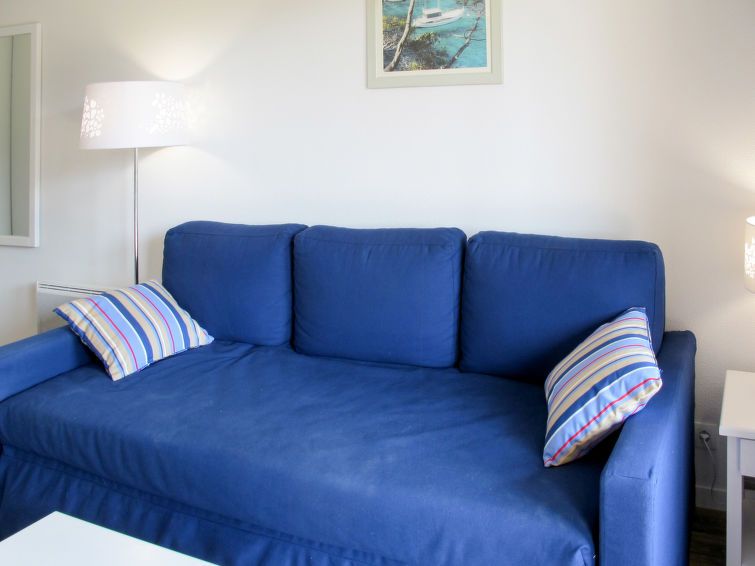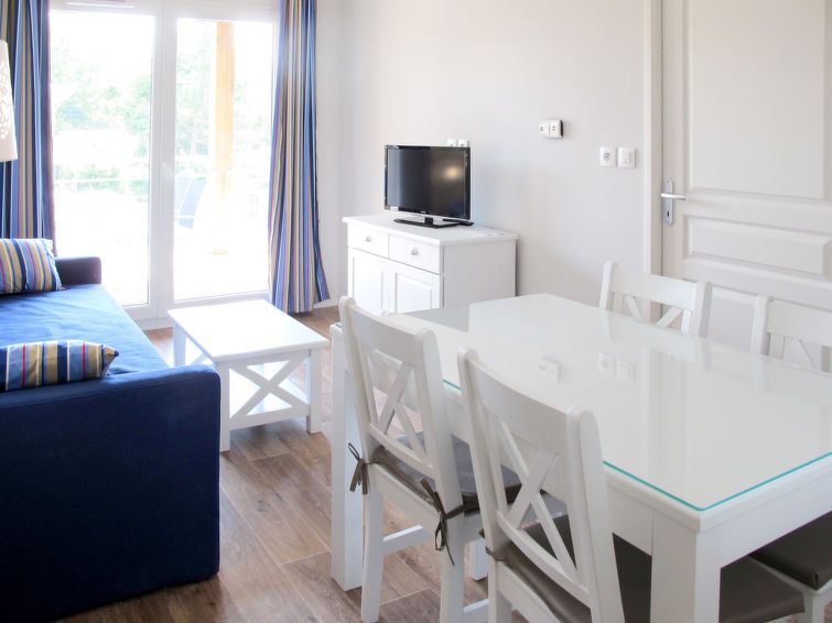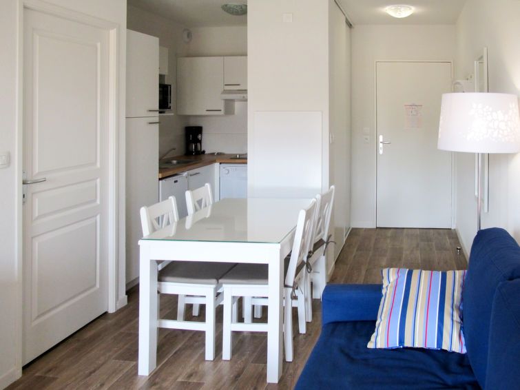 "Résidence Odalys Référence Le Petit Pont", 2-room apartment 31 to 36 m2. Practical furnishings: living/sleeping room with 1 pull-out bed (2 pers.), dining table and TV. Exit to the terrace. 1 room with 1 double bed (160 cm). Small, open kitchen (dishwasher, 2 ceramic glass hob hotplates, kettle, microwave, electric coffee machine).