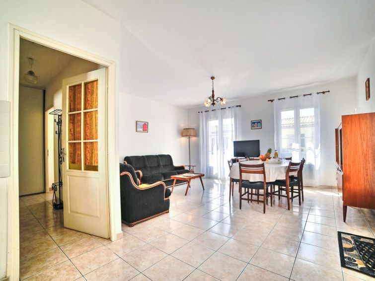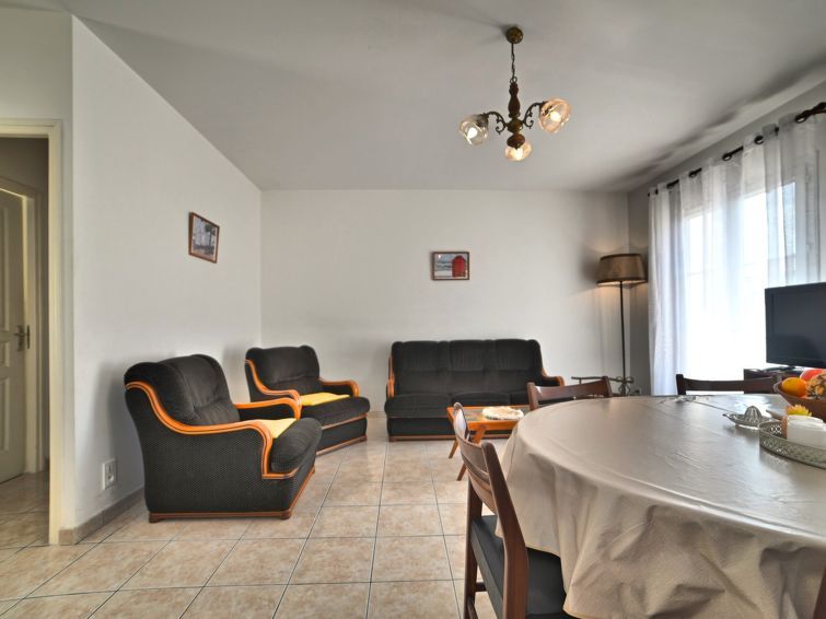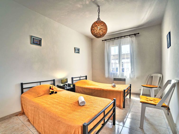 3-room house 60 m2. Simple furnishings: living/dining room with 1 sofabed (120 cm, length 190 cm), TV (flat screen). Exit to the terrace. 1 room with 1 french bed (1 x 140 cm, length 190 cm). 1 room with 2 beds (90 cm, length 190 cm). Kitchen (oven, dishwasher, 4 gas rings, toaster, kettle, microwave, electric coffee machine).
