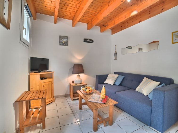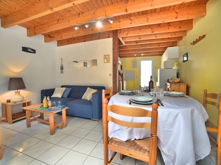 3-room terraced house 39 m2 on 2 levels. Living/dining room with TV and flat screen. Exit to the terrace. Kitchenette (2 hot plates, mini-oven, dishwasher, toaster, microwave, electric coffee machine). Shower, sep. WC. Electric heating. Upper floor: 1 room with 1 french bed (1 x 140 cm, length 190 cm).