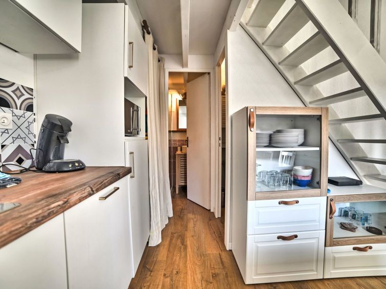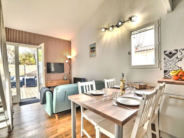 3-room terraced house 30 m2. Beautiful furnishings: living/dining room with TV (flat screen). Exit to the terrace. 1 room with 1 french bed (1 x 140 cm, length 190 cm). Kitchenette (oven, dishwasher, 3 induction hot plates, toaster, kettle, microwave, electric coffee machine). Bathroom, sep.