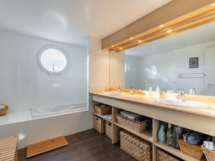 6-room villa 200 m2 on 2 levels, south facing position. Spacious and bright, comfortable and modern furnishings: living/dining room with panoramic window. Exit to the garden, to the terrace. 1 room with 2 beds (90 cm, length 190 cm). Open kitchen (oven, dishwasher, 3 induction hot plates, toaster, kettle, microwave, electric coffee machine, Capsules for coffee machine (Nespresso) extra).