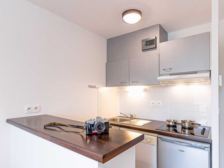 "2 pièces 4 BBQ Les Rives Marines", 2-room apartment 36 m2. Beautiful furnishings: living/dining room with 1 double sofabed and TV can be hired. 1 room with 1 french bed (1 x 140 cm, length 190 cm). Kitchenette (dishwasher, 4 ceramic glass hob hotplates, toaster, kettle, microwave, electric coffee machine).