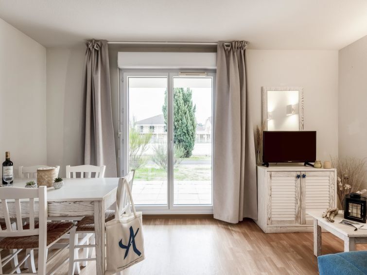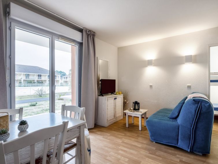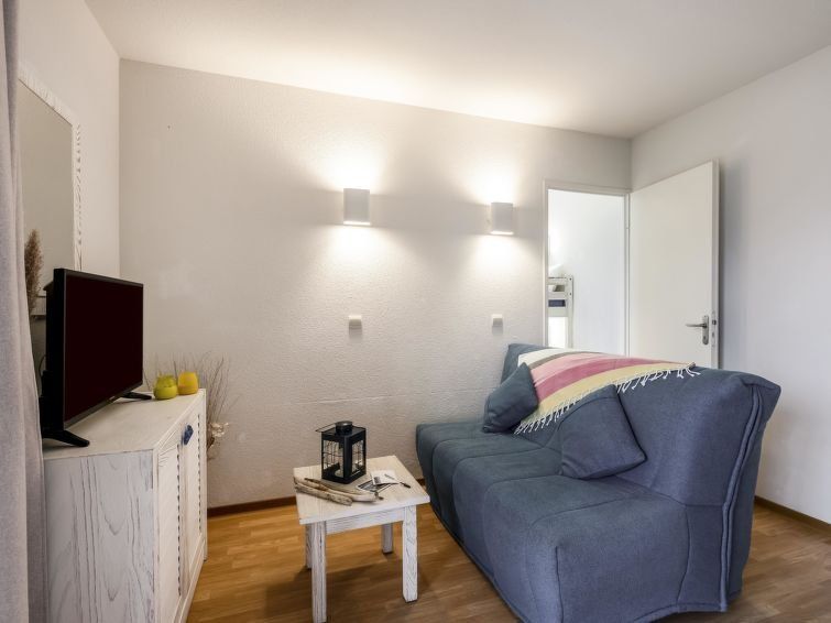 "Les Alcyons T2", 2-room apartment 35 m2. Practical furnishings: living/sleeping room with 1 sofabed (140 cm, length 190 cm), dining table and TV (flat screen). Exit to the balcony, to the terrace. 1 room with 1 french bed (140 cm, length 190 cm). Alcove with 1 x 2 bunk beds (80 cm, length 190 cm).