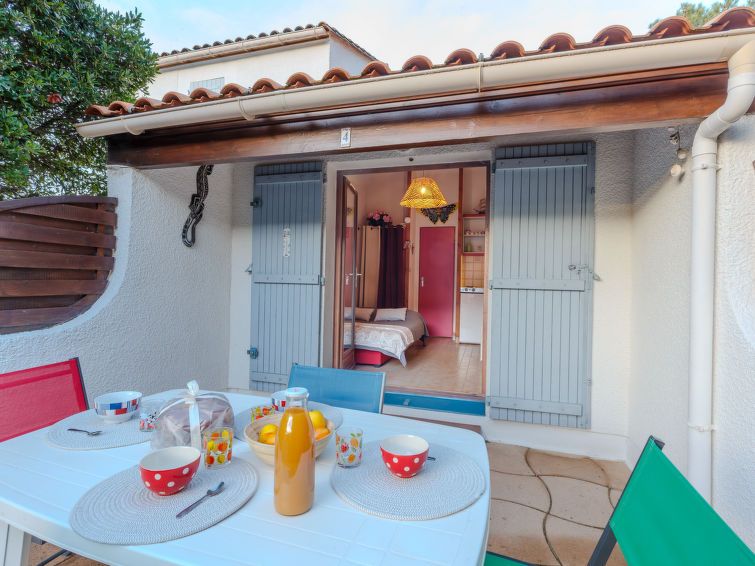 1-room terraced house 18 m2, south facing position. Object suitable for 2 adults + 2 children. Living room with 1 double sofabed (1 x 140 cm, length 190 cm), TV (flat screen). Exit to the terrace. Alcove with 1 x 2 bunk beds (90 cm, length 190 cm). Kitchenette (2 hot plates, toaster, kettle, electric coffee machine).