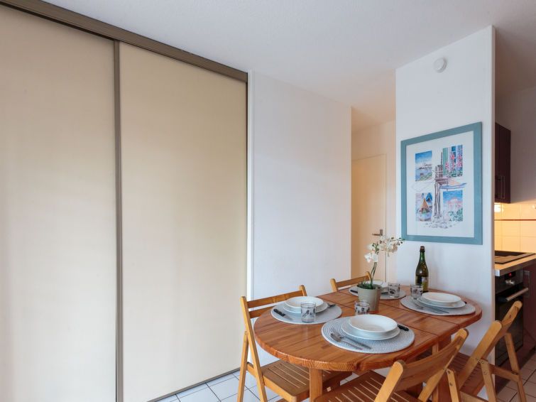 2-room apartment 28 m2, on the ground floor, east facing position. Living/dining room with TV (flat screen). Exit to the terrace. 1 room with 1 french bed (140 cm, length 190 cm). Sleeping alcove with 1 x 2 bunk beds (90 cm, length 190 cm). Kitchenette (oven, 2 ceramic glass hob hotplates, toaster, kettle, microwave, electric coffee machine).