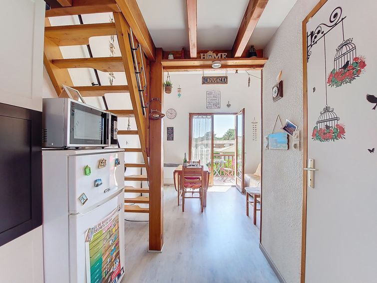 1-room studio 35 m2 on 2 levels on 1st floor, south-east facing position. Living room with TV (flat screen). Exit to the terrace. Kitchenette (oven, dishwasher, toaster, kettle, freezer, electric coffee machine, Capsules for coffee machine (Senseo) extra). Shower/WC. Electric heating.