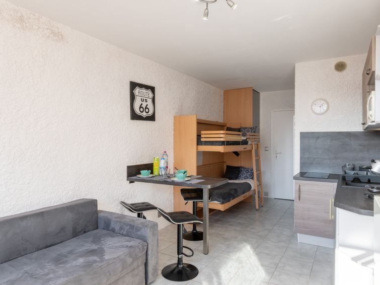 1-room apartment 18 m2 on 1st floor. Practical furnishings: living/dining room with 1 sofabed (130 cm, length 190 cm), 1 x 2 bunk beds (90 cm, length 190 cm), dining nook and TV (flat screen), electric heating and electric heater. Open kitchen (1 induction hot plates, 2 gas rings, toaster, kettle, microwave, electric coffee machine, Capsules for coffee machine (Nescafe Dolce Gusto) extra).