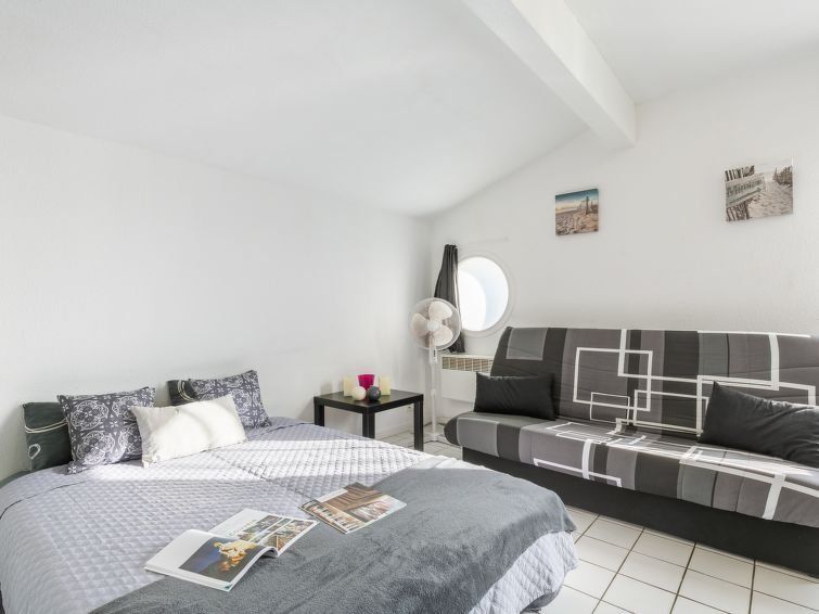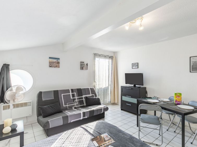 1-room studio 24 m2 on 1st floor. Practical furnishings: living/dining room with 2 sofabeds (130 cm, length 190 cm), dining nook and TV (flat screen), electric heater. Kitchenette (2 hot plates, toaster, kettle, microwave, electric coffee machine). Shower/WC. Facilities: Internet (WiFi, extra).
