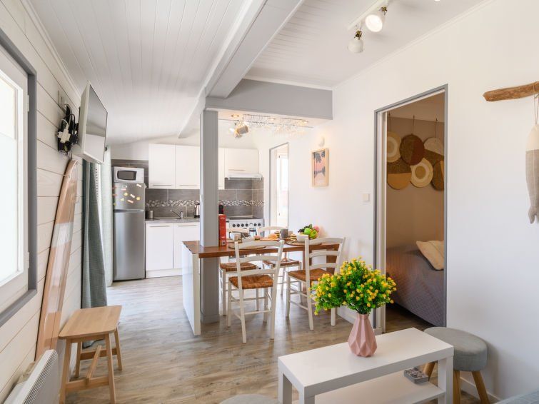 "Bleuet", 3-room apartment 39 m2 on 2 levels on 1st floor, north-west facing position. Modern furnishings: upper floor: (steep stair) living/dining room, Low door height 190 cm with satellite TV (flat screen), electric heating. Exit to the balcony. 1 small room with 2 beds (90 cm, length 190 cm).