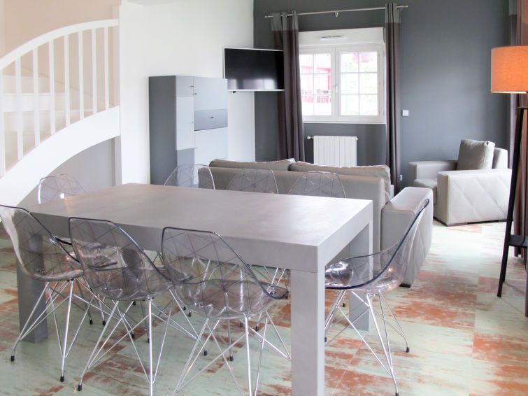 "Villas Odalys Collection Domaine de Lana", 4-room house 75 m2. Modern and tasteful furnishings: living/sleeping room with 1 double sofabed (140 cm, length 190 cm), dining table and TV (flat screen). Exit to the terrace. 1 room with 2 beds (90 cm, length 190 cm). 1 room with 1 french bed (140 cm, length 190 cm).