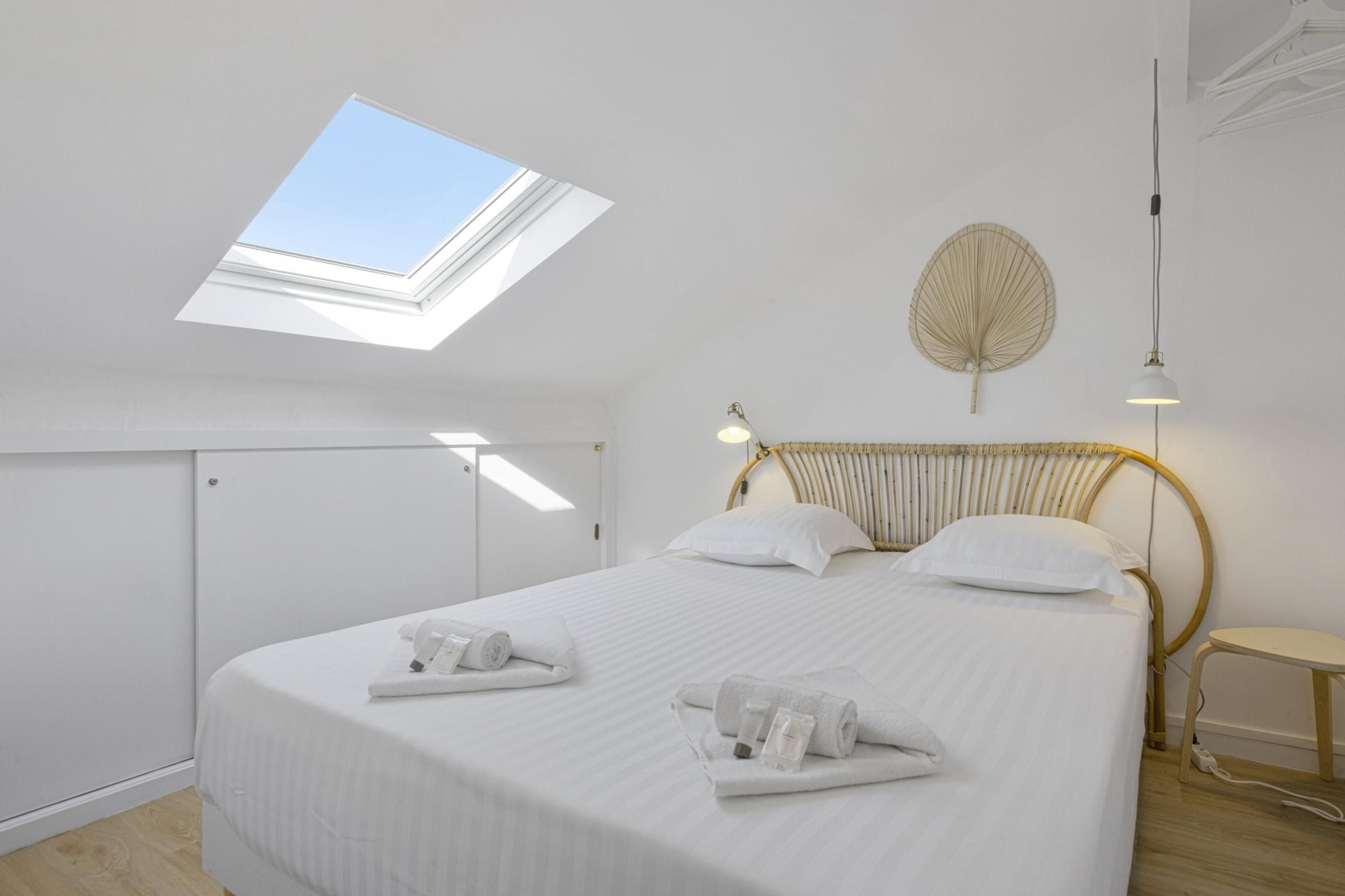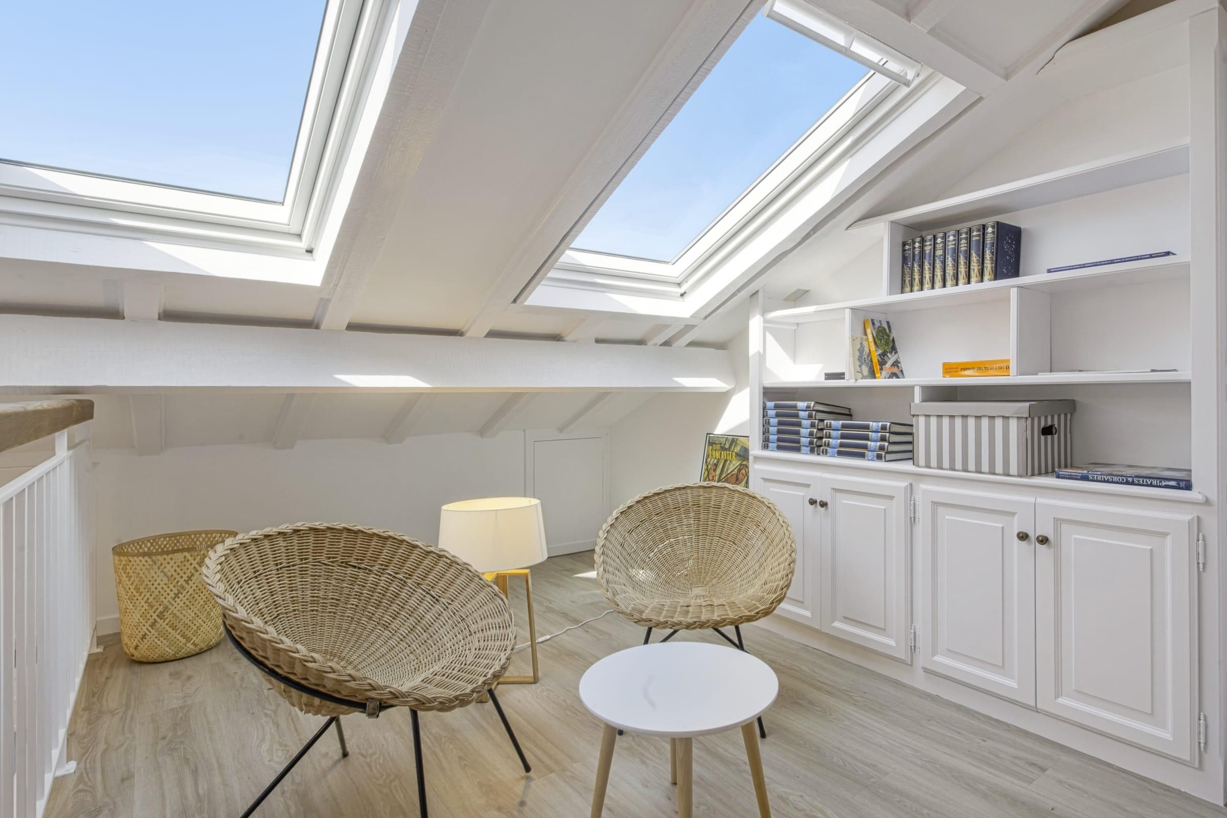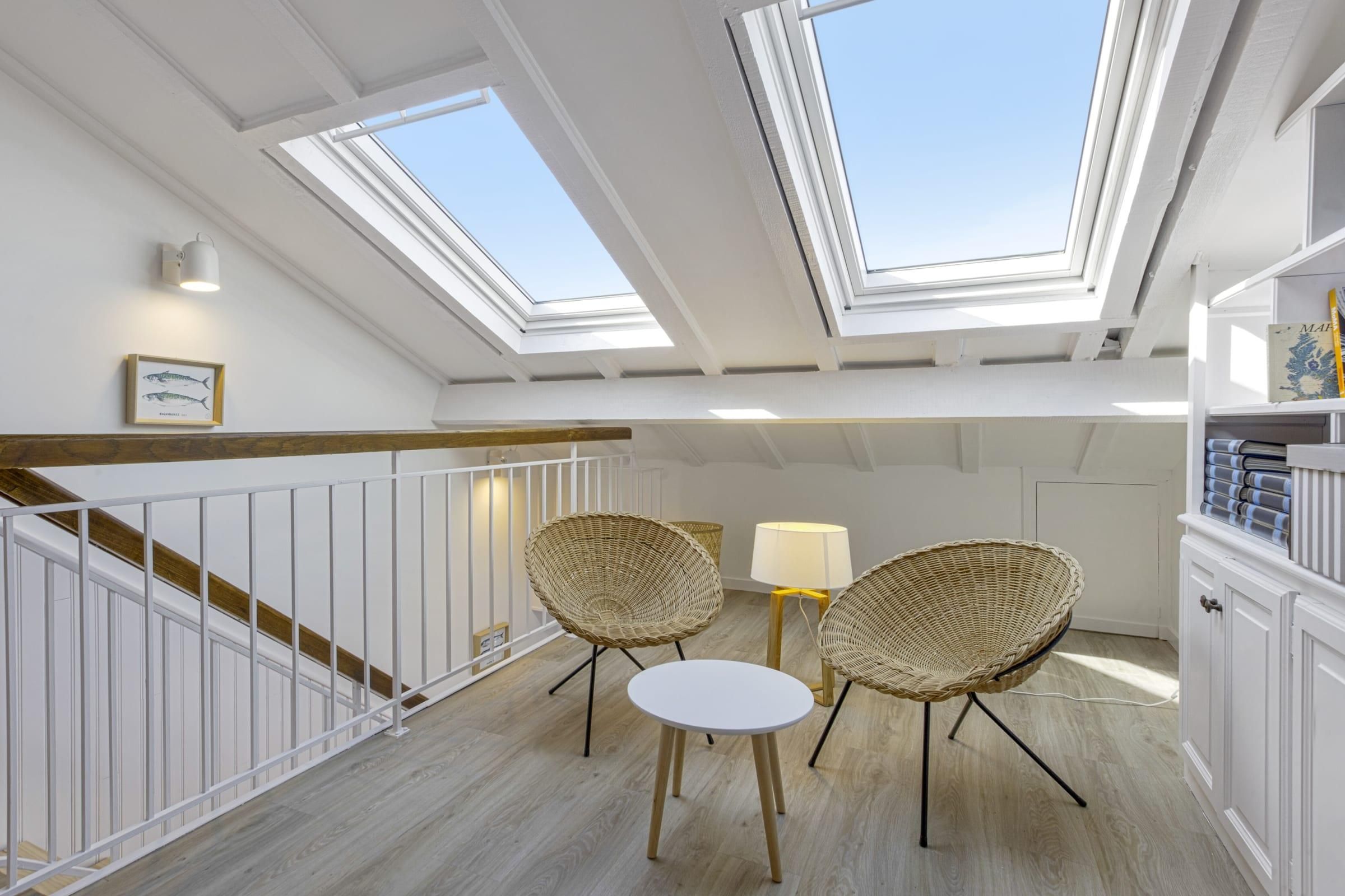 In the centre of the seaside town of Saint-Jean-de-Luz, this duplex loft apartment is bright and breezy, just like the town. A four-minute walk sees you at the Grande Plage, the town’s horseshoe of golden sand lined with loungers and a calm spot for swimming. Here you’ll find local restaurants serving up the seafood-rich basque cuisine. Closer to home, the classic indoor market of Les Halles de Saint-Jean-de-Luz is less than a minute from the apartment, where you can stock up on fresh, local produce to take back to the full kitchen. Sleek, modern cabinets in dove grey hide myriad appliances to whip up a family meal, enjoyed at the stylish dining table set for six. The open living, dining room and kitchen is made bright by sliding glass doors that open up to a Juliet-style balcony, looking out over the city’s rooftops. A motif of white and blue throughout is a reminder that the sea is just beyond your street and skylights in the bedrooms flood the place with natural light.