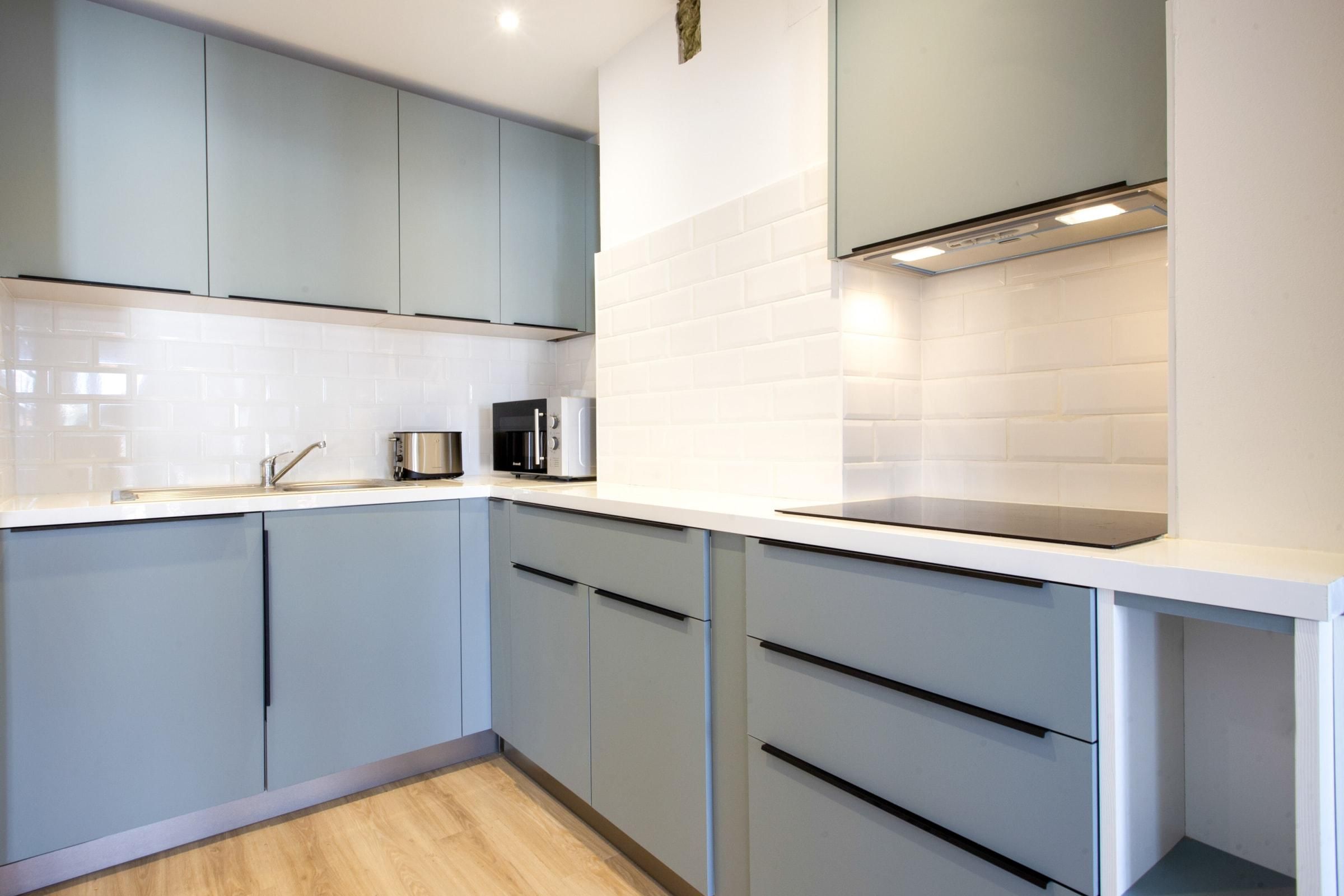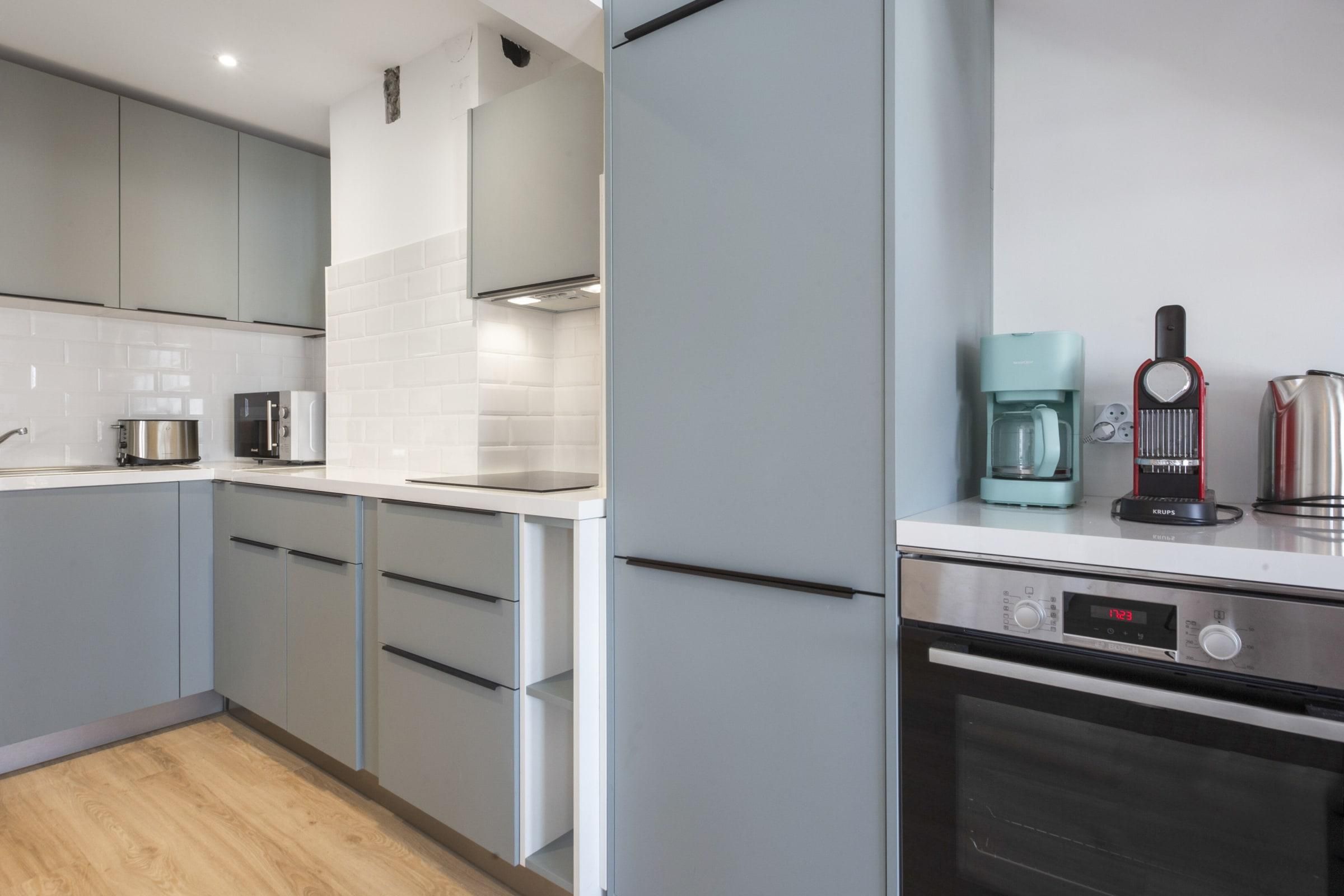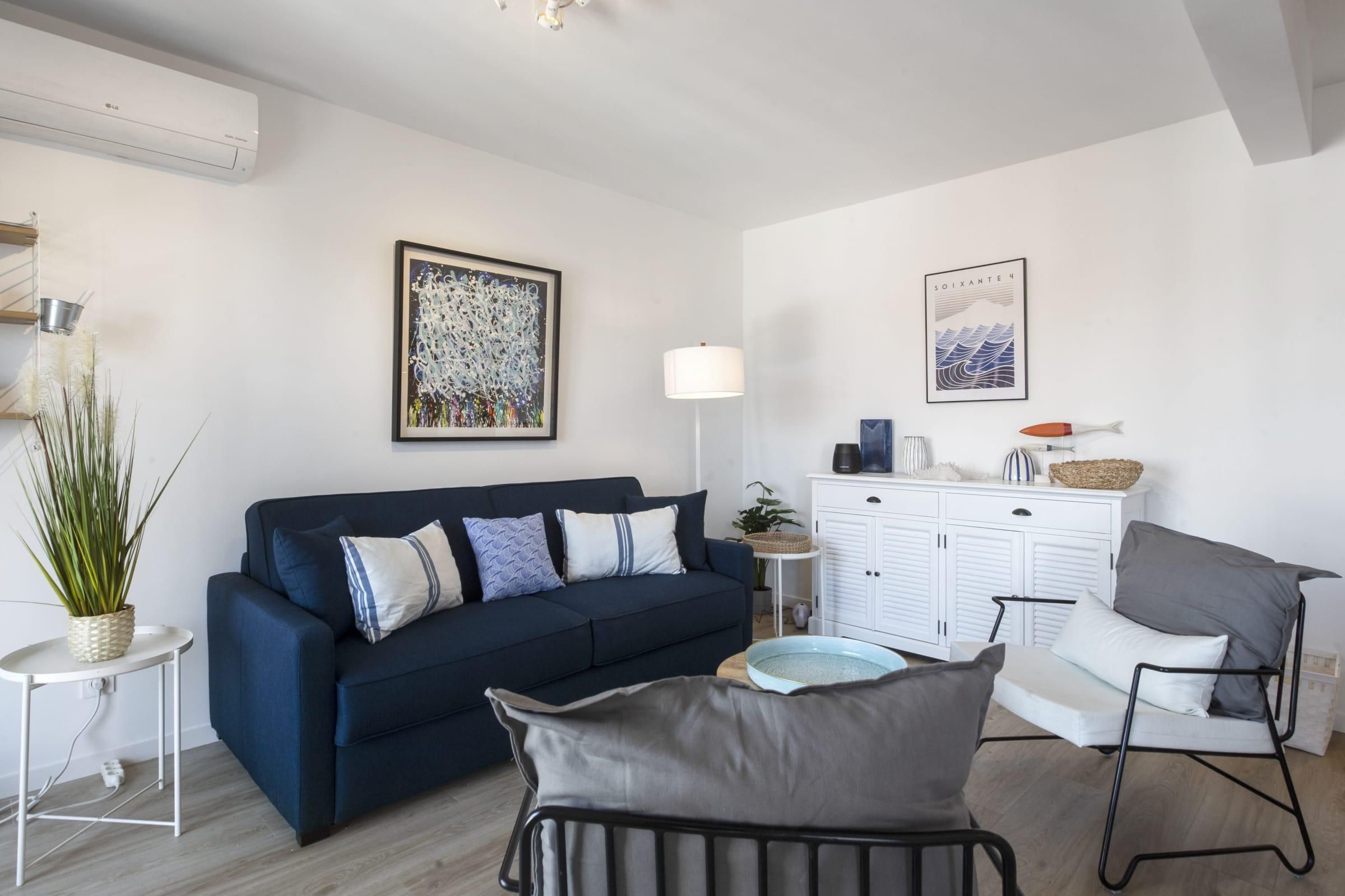 In the centre of the seaside town of Saint-Jean-de-Luz, this duplex loft apartment is bright and breezy, just like the town. A four-minute walk sees you at the Grande Plage, the town’s horseshoe of golden sand lined with loungers and a calm spot for swimming. Here you’ll find local restaurants serving up the seafood-rich basque cuisine. Closer to home, the classic indoor market of Les Halles de Saint-Jean-de-Luz is less than a minute from the apartment, where you can stock up on fresh, local produce to take back to the full kitchen. Sleek, modern cabinets in dove grey hide myriad appliances to whip up a family meal, enjoyed at the stylish dining table set for six. The open living, dining room and kitchen is made bright by sliding glass doors that open up to a Juliet-style balcony, looking out over the city’s rooftops. A motif of white and blue throughout is a reminder that the sea is just beyond your street and skylights in the bedrooms flood the place with natural light.