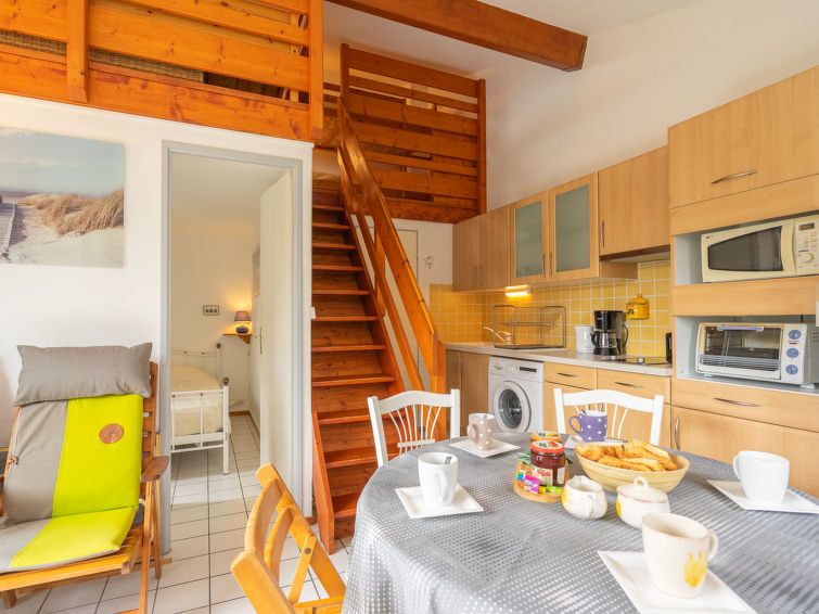 2-room terraced house 35 m2 on 2 levels. Living room with TV (flat screen). Exit to the terrace, to the patio. 1 room with 1 french bed (1 x 140 cm, length 190 cm). Kitchenette (mini-oven, 2 ceramic glass hob hotplates, toaster, kettle, microwave, freezer, electric coffee machine).